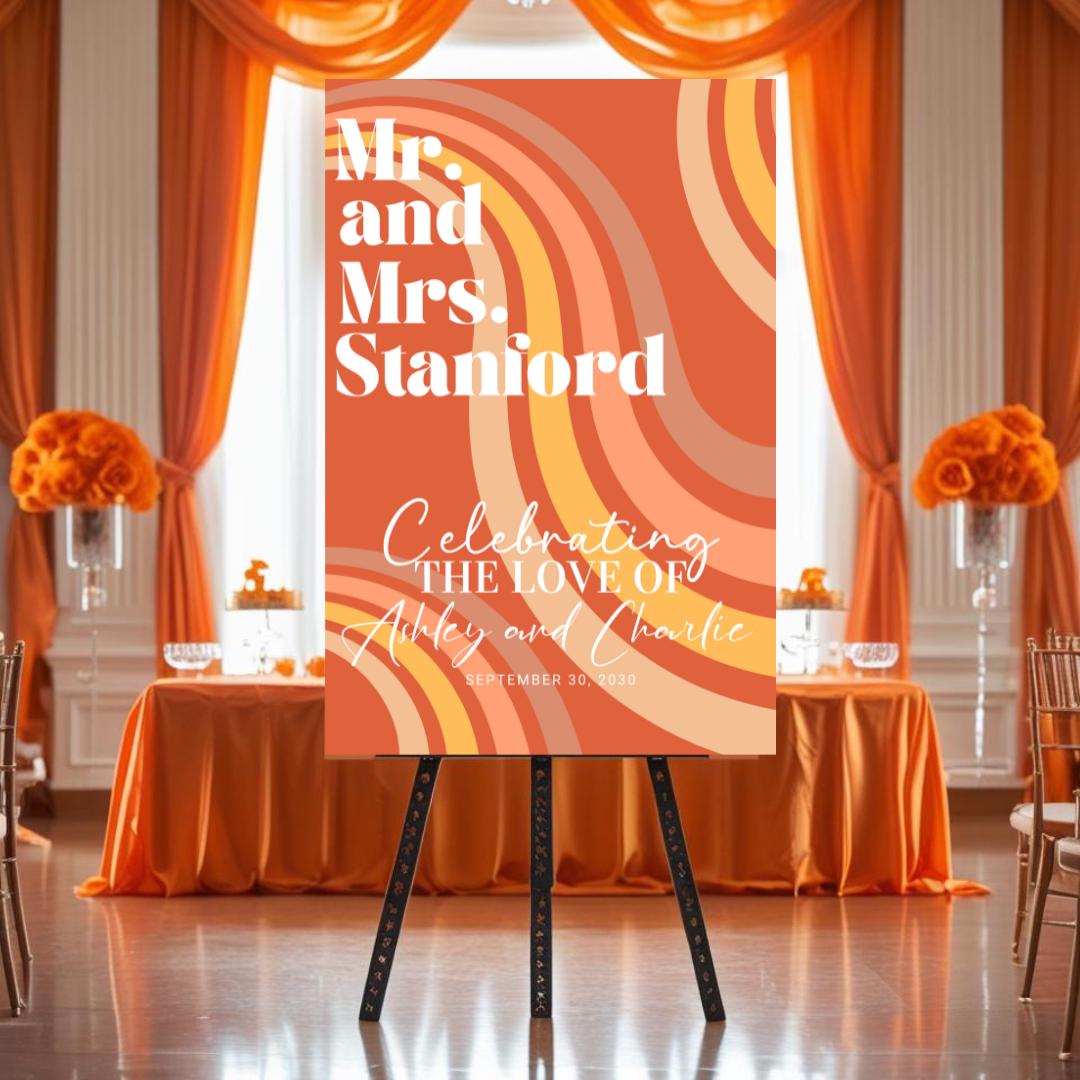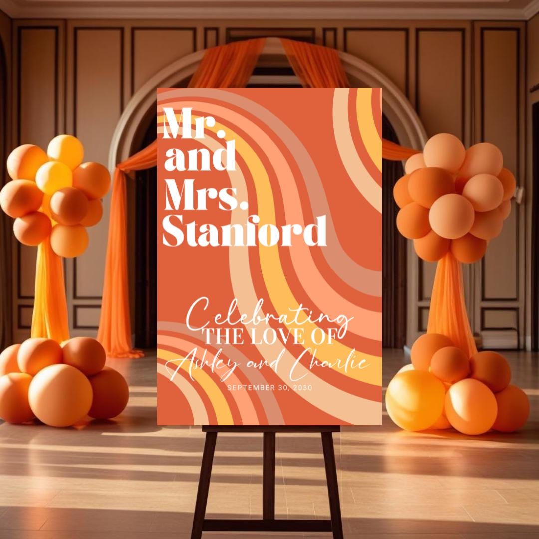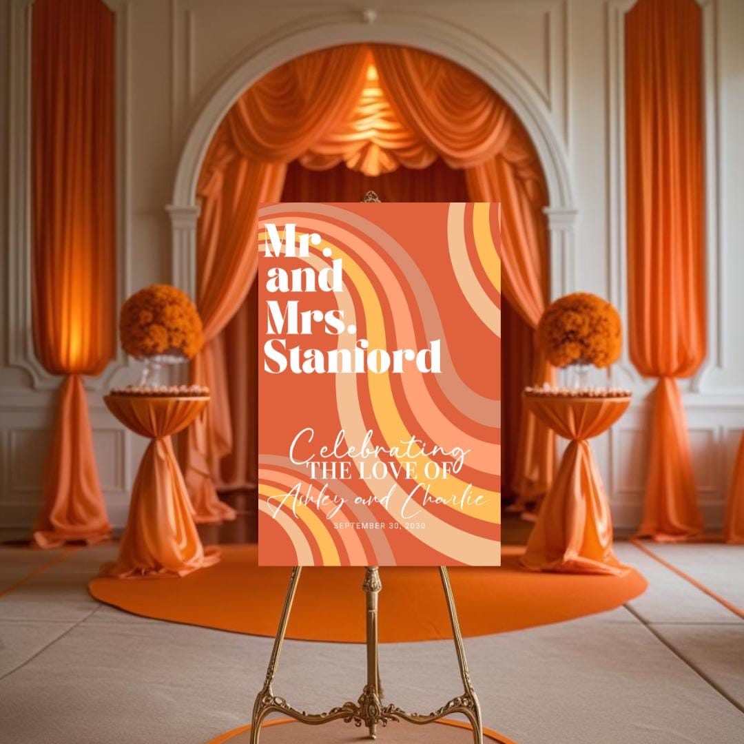 Bring a bold retro vibe to your big day with this burnt orange wedding welcome sign – perfect for weddings, anniversaries, engagements, or parties! Designed with groovy waves and a vintage-inspired palette, it sets the tone for a stylish celebration.