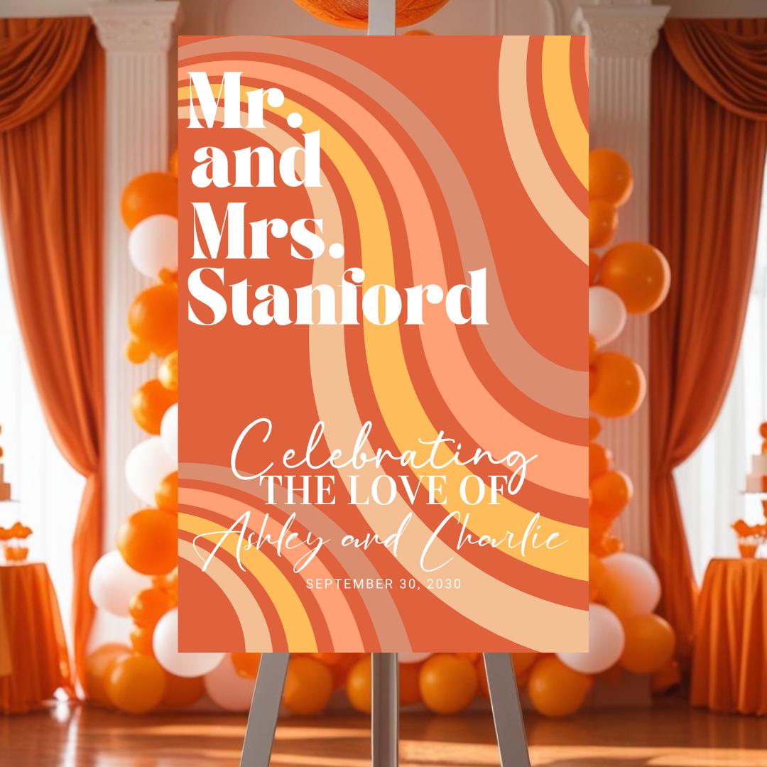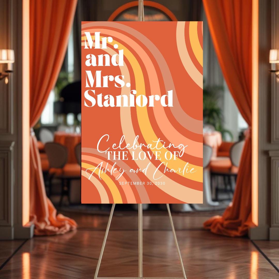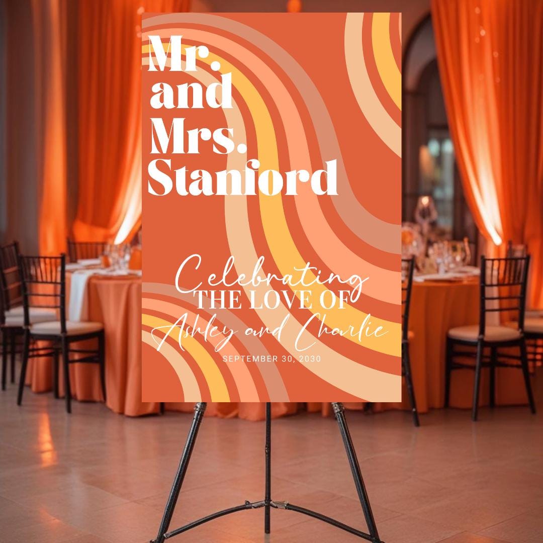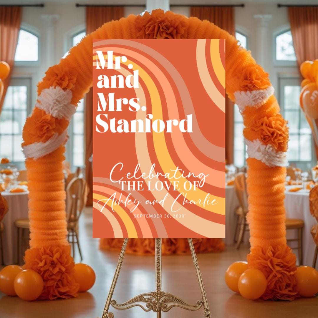 Bring a bold retro vibe to your big day with this burnt orange wedding welcome sign – perfect for weddings, anniversaries, engagements, or parties! Designed with groovy waves and a vintage-inspired palette, it sets the tone for a stylish celebration.