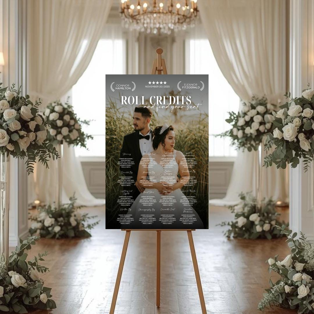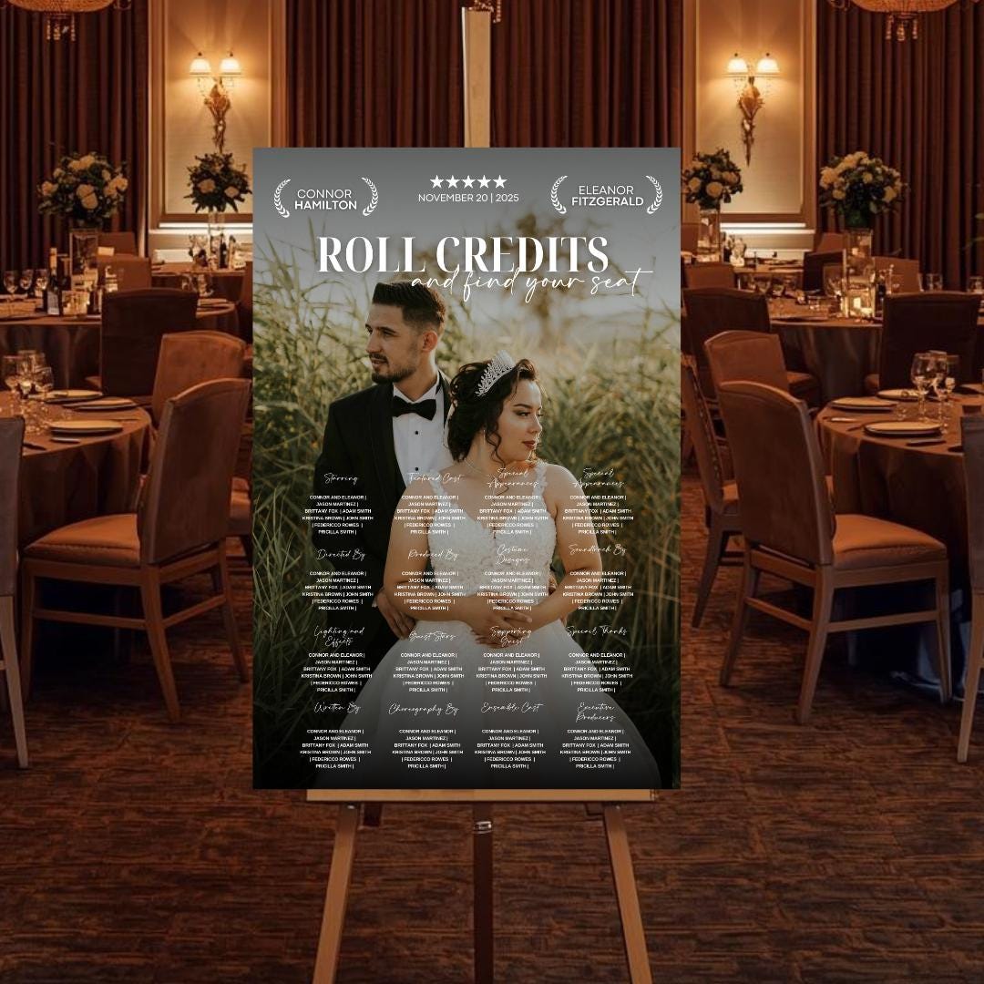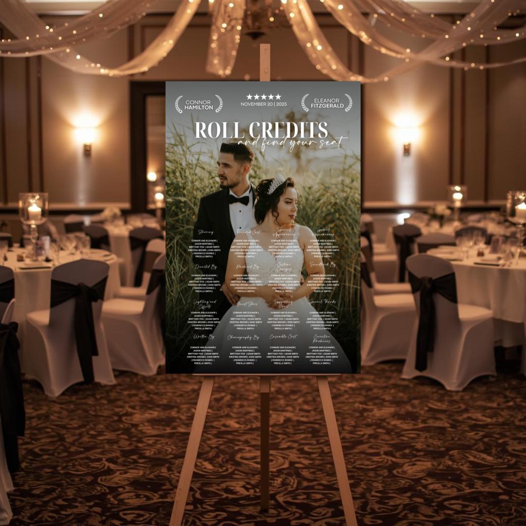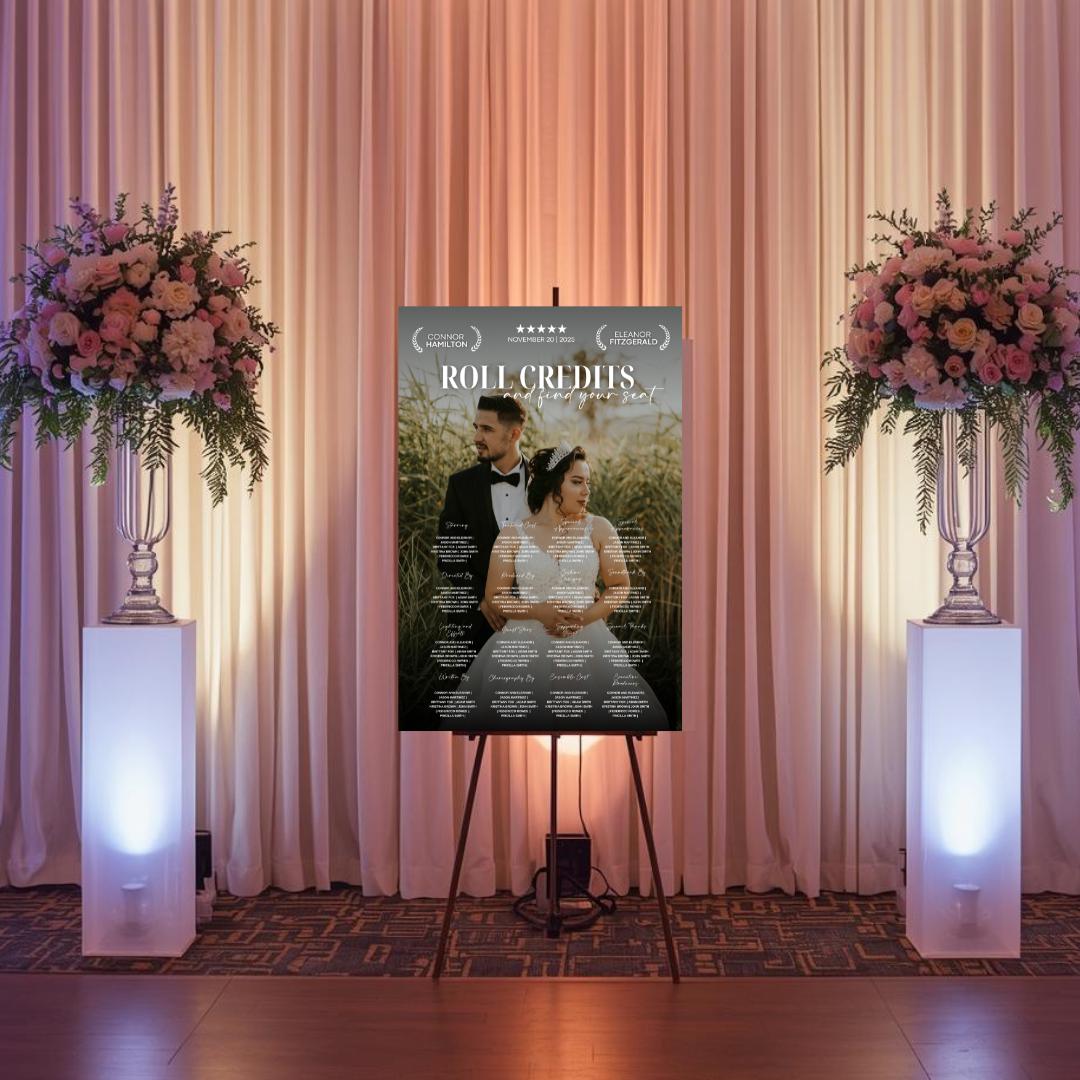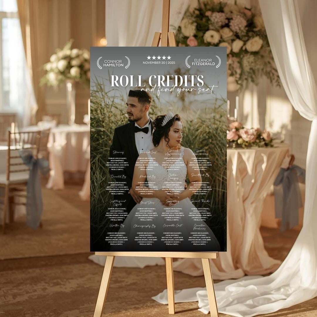 Bring a cinematic touch to your special day with this custom wedding seating chart designed in the style of movie credits. Your guests will feel like stars as they “find their seat” on this unique, personalized display that doubles as wedding décor.
