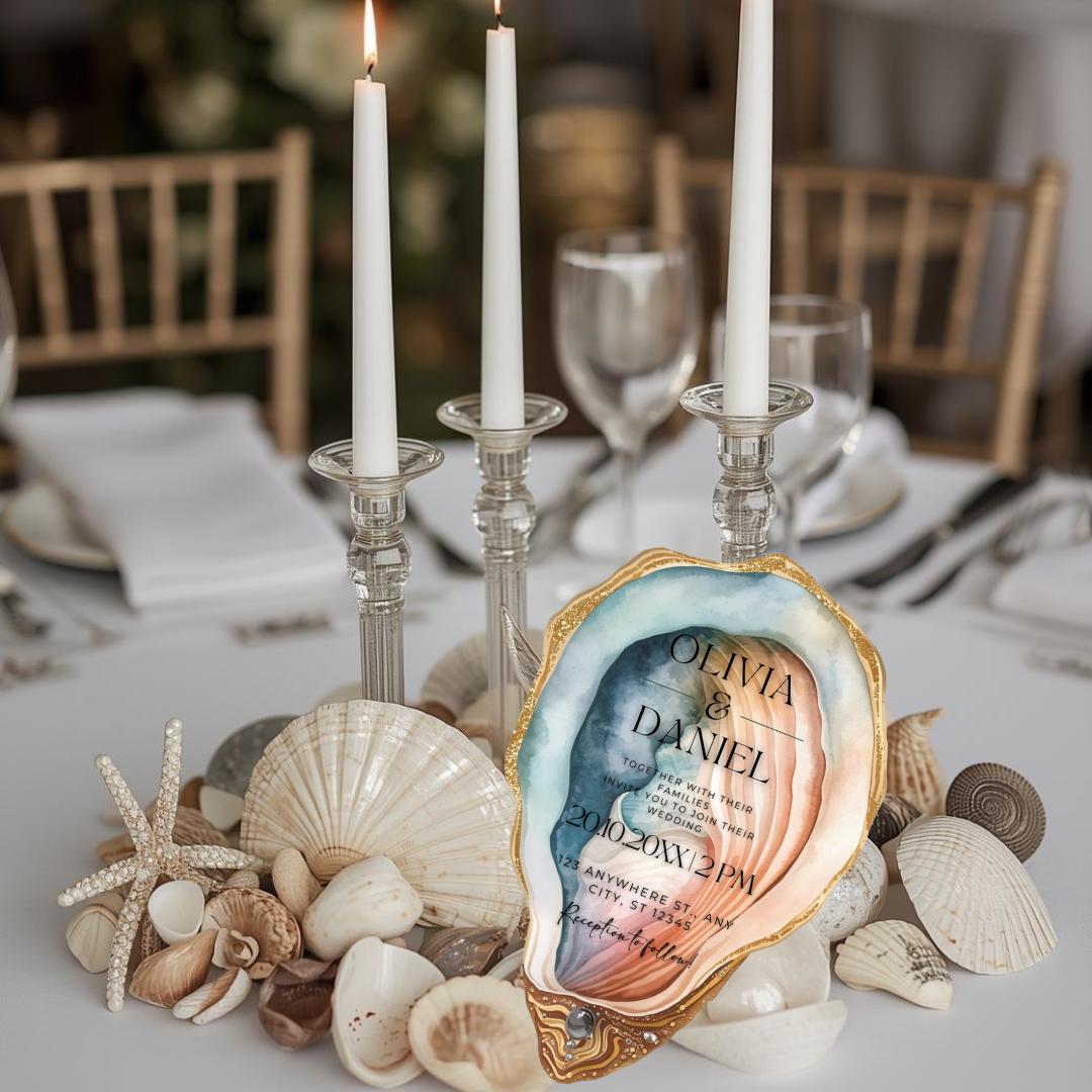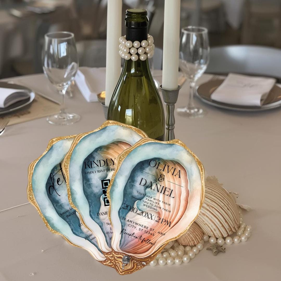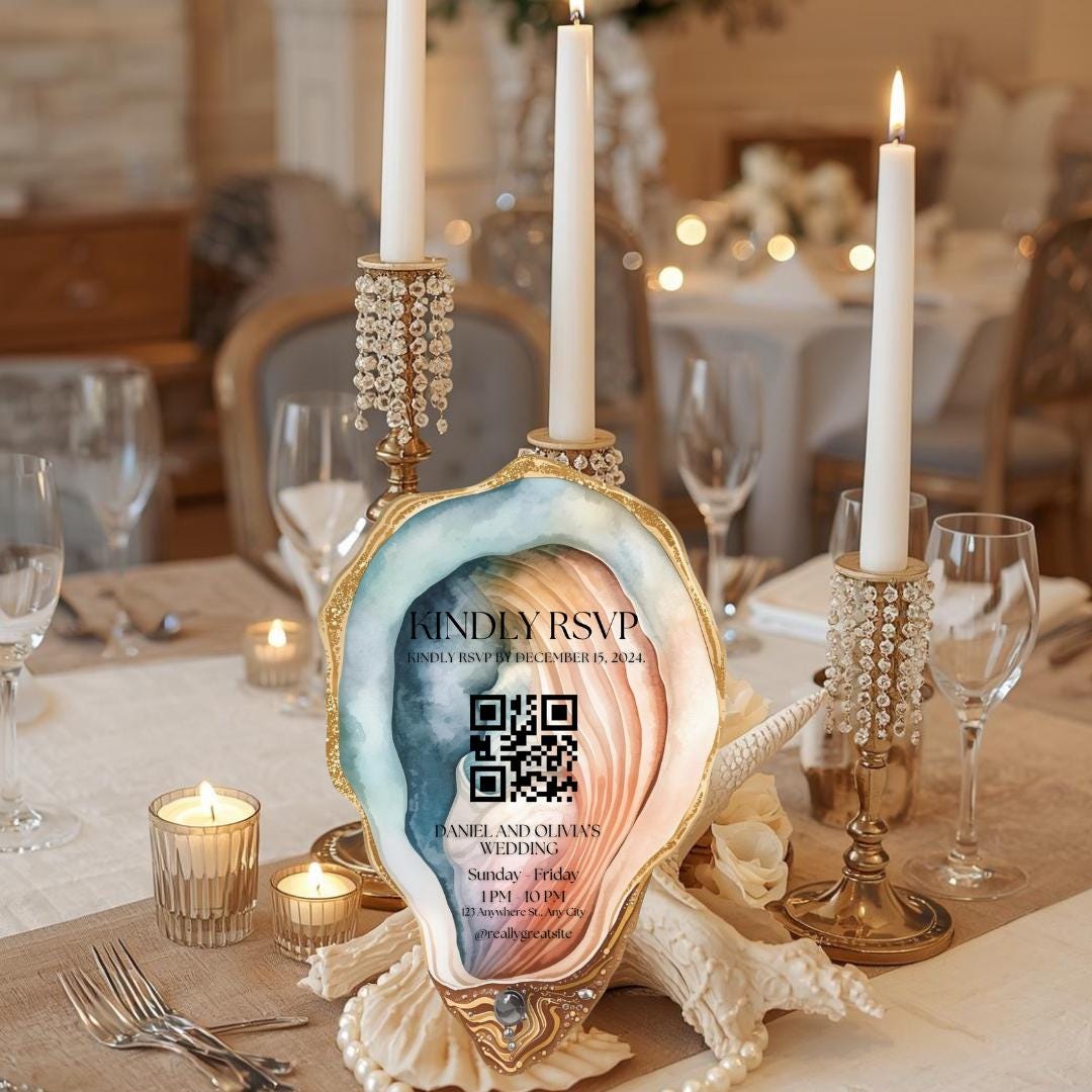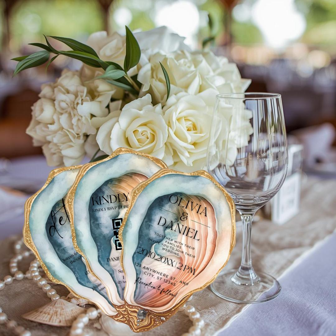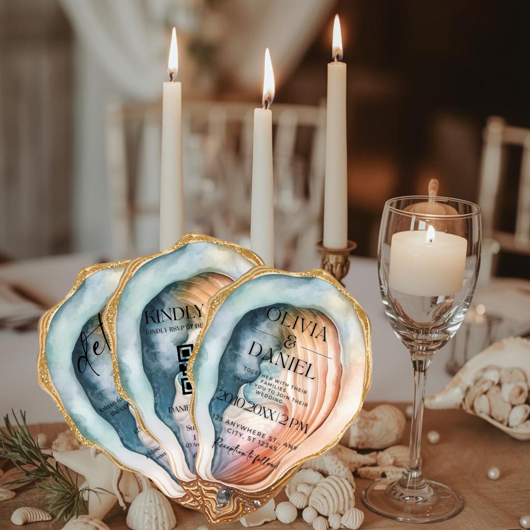Seashell Wedding Invitation – Beach Destination Wedding Invite Cut to Shape | Coastal Nautical Ocean Theme Premium Cardstock with QR Code or Bundle