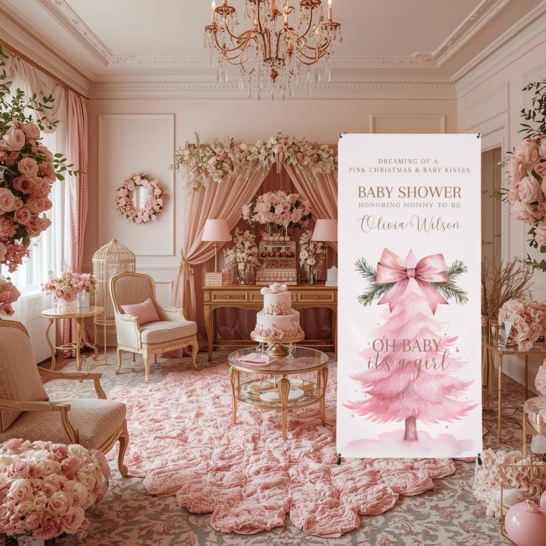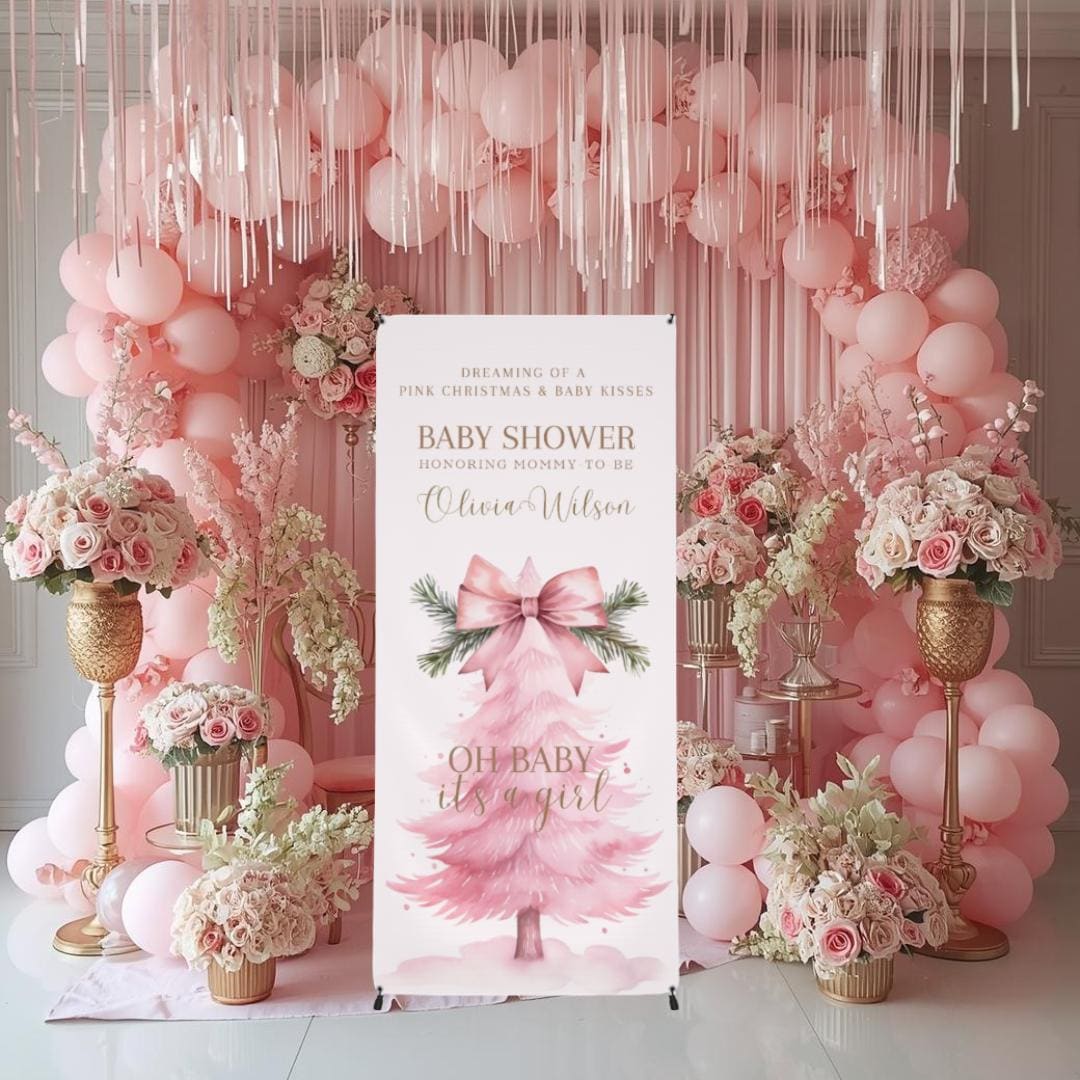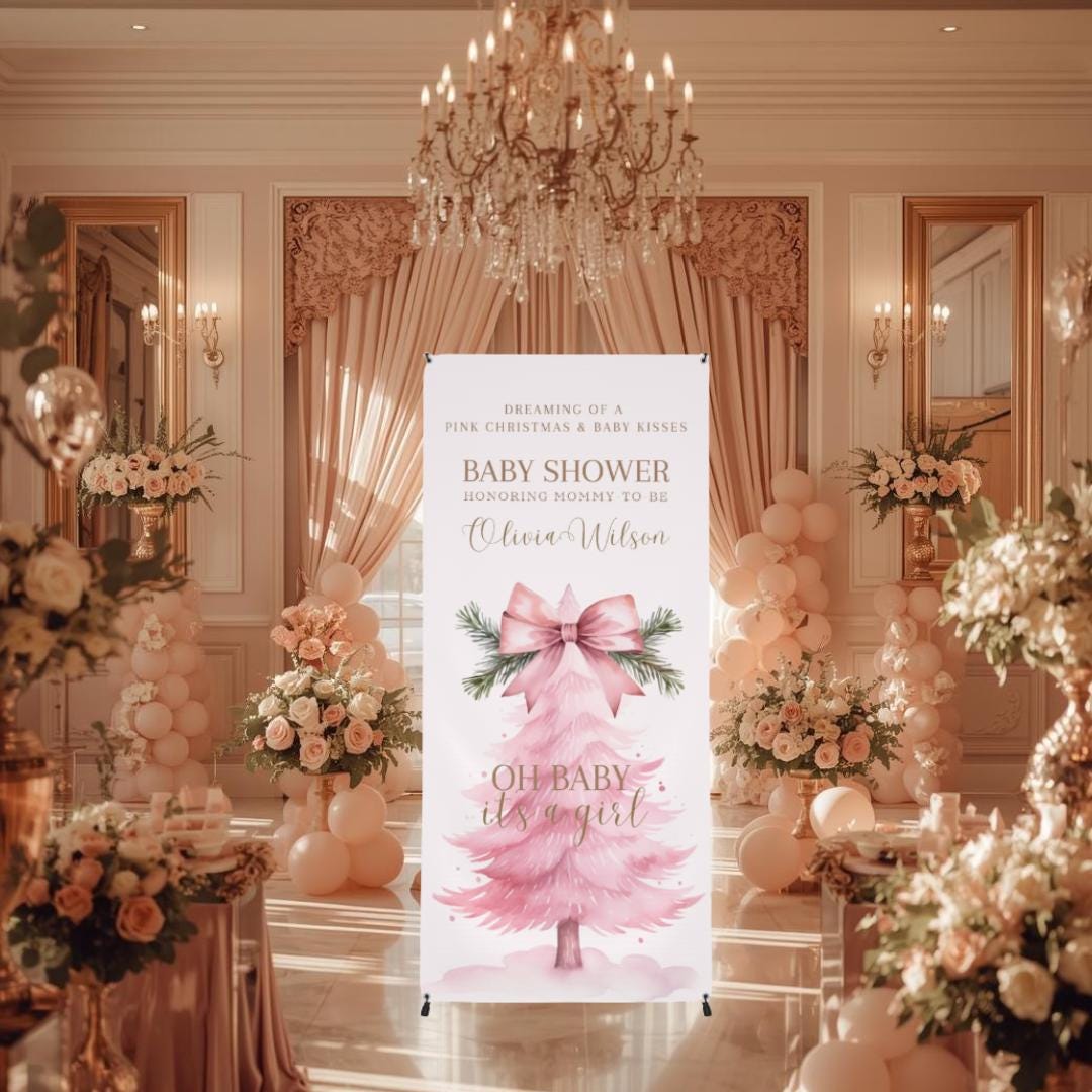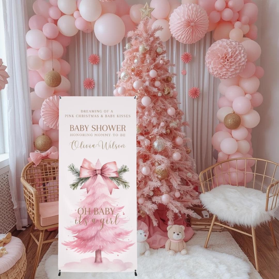 Make your celebration unforgettable with this elegant Pink Christmas Tree Baby Shower Banner – a holiday touch your guests will love and your photos will treasure forever!