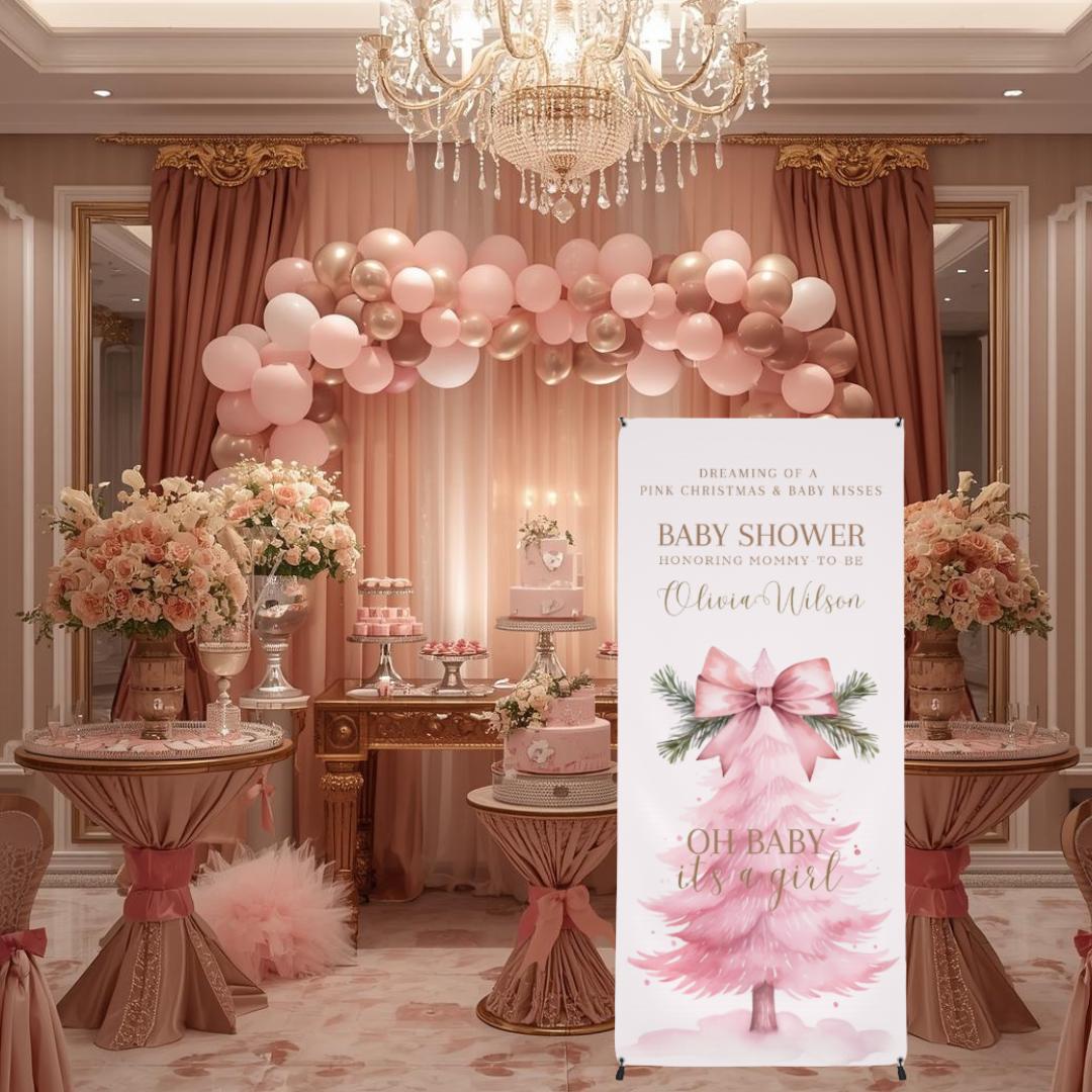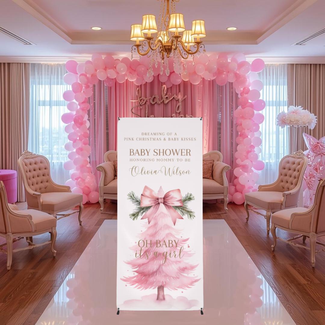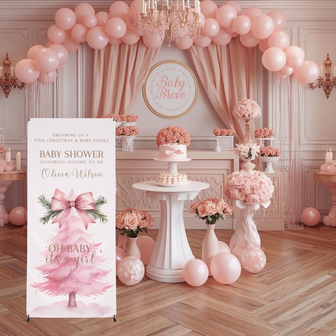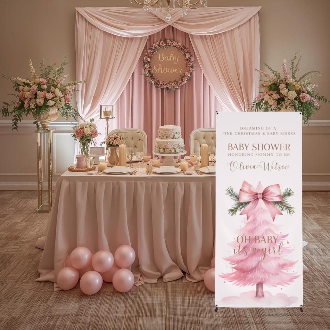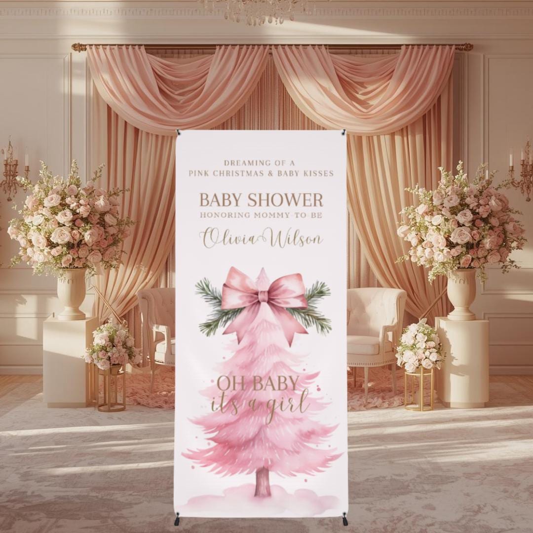 Make your celebration unforgettable with this elegant Pink Christmas Tree Baby Shower Banner – a holiday touch your guests will love and your photos will treasure forever!
