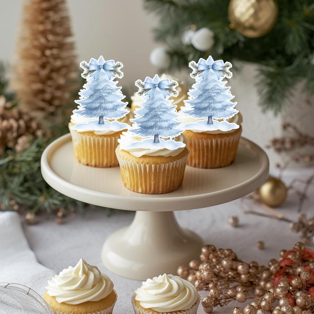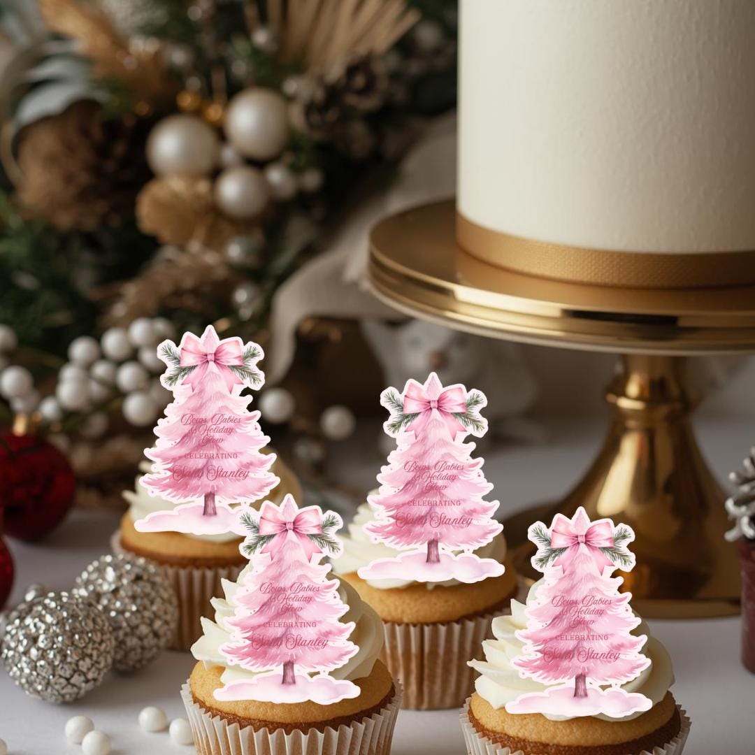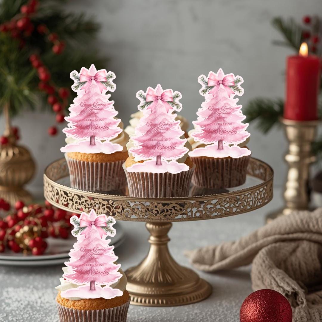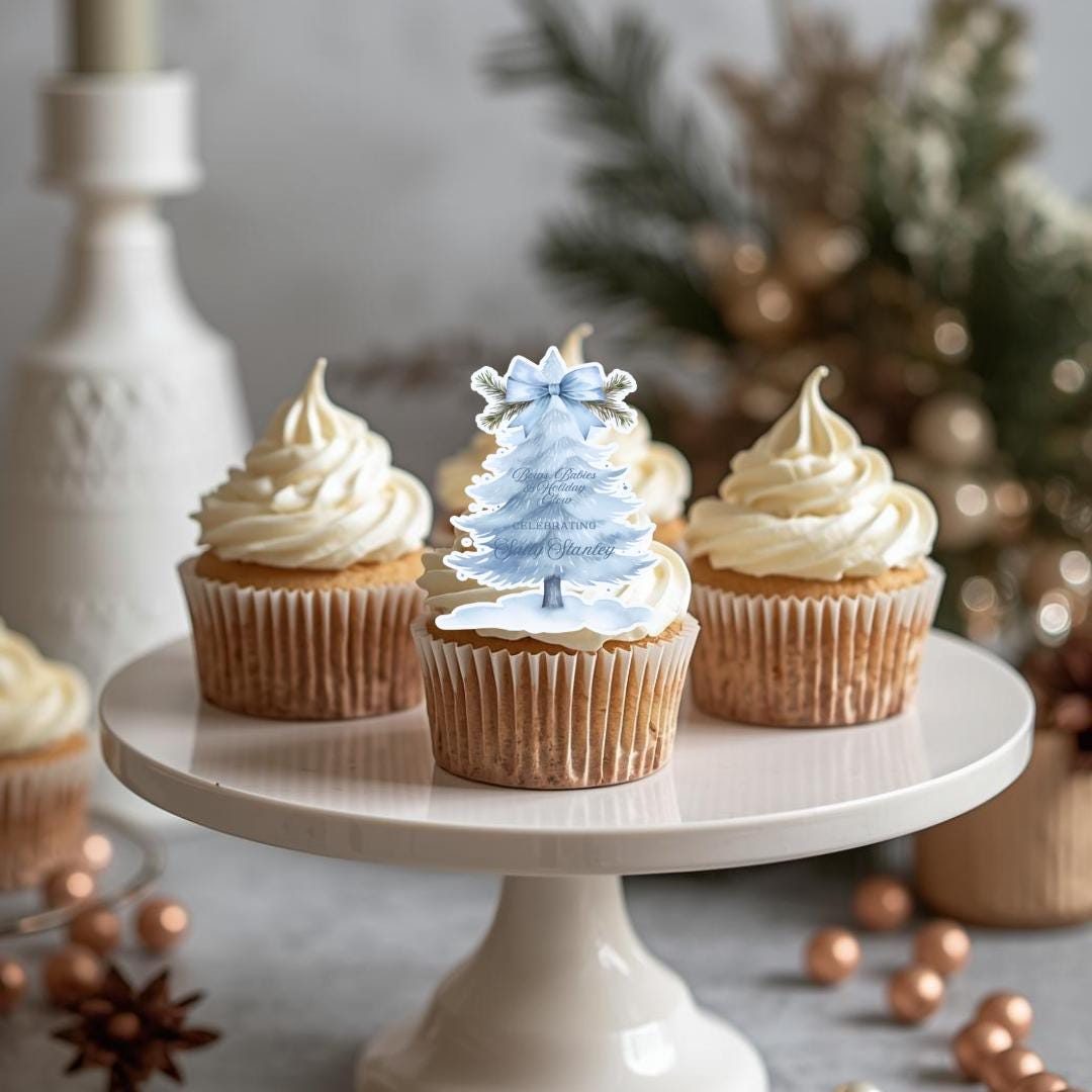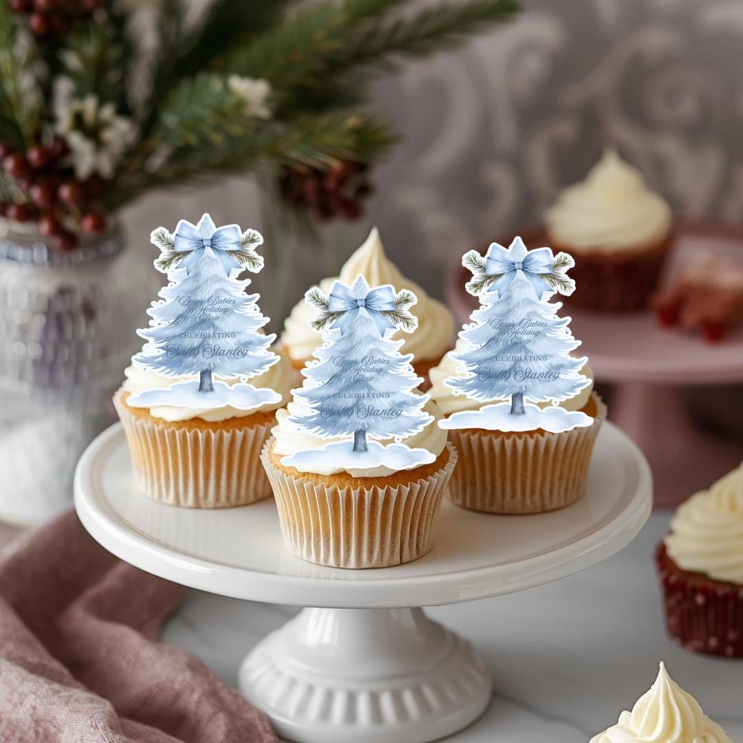Add a festive and elegant touch to your baby shower or gender reveal celebration with these beautiful Christmas Tree Cupcake Toppers with Bows. Perfect for a winter-themed party, these edible toppers make your cupcakes, cookies, cakes, or even drinks stand out!