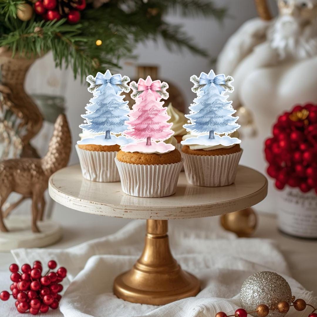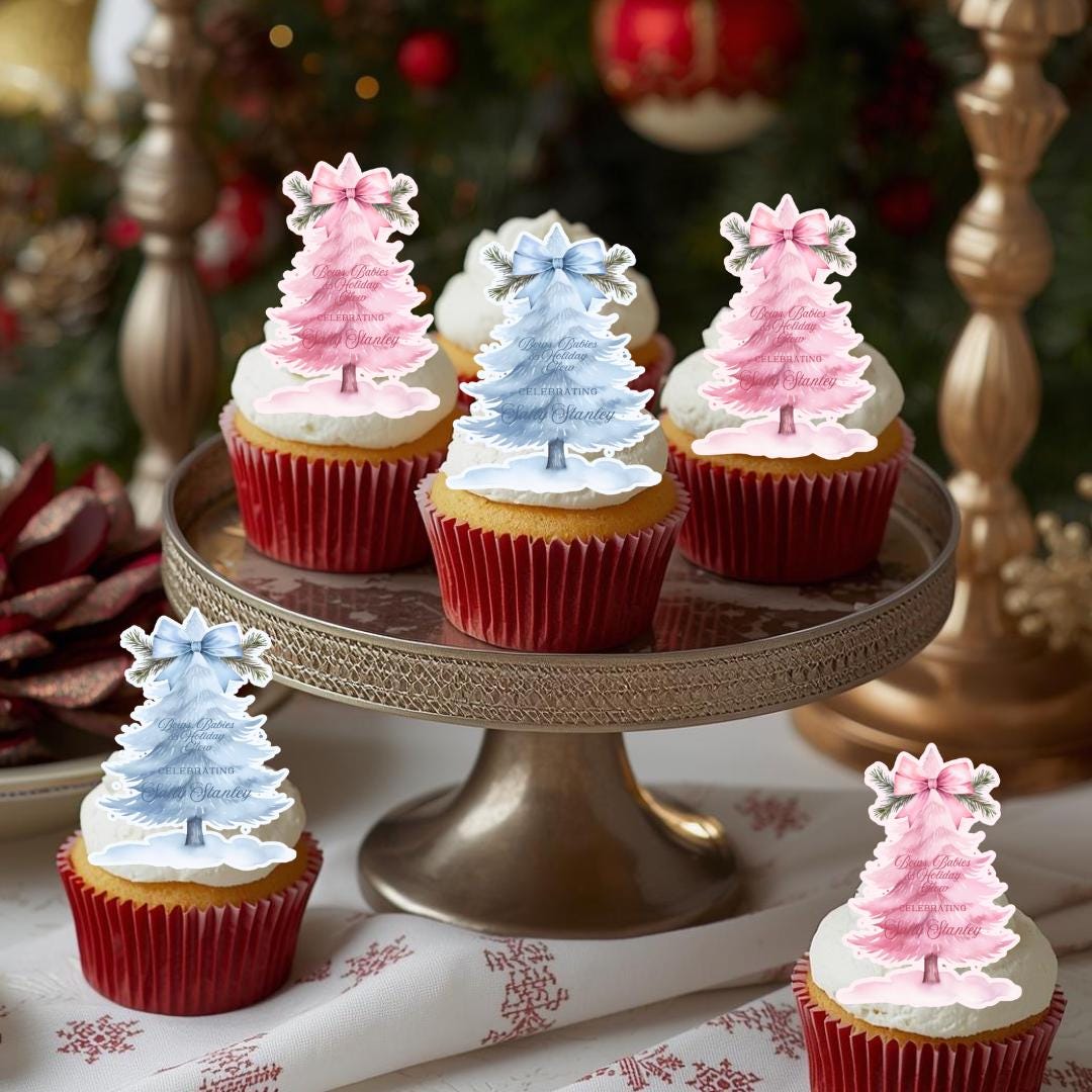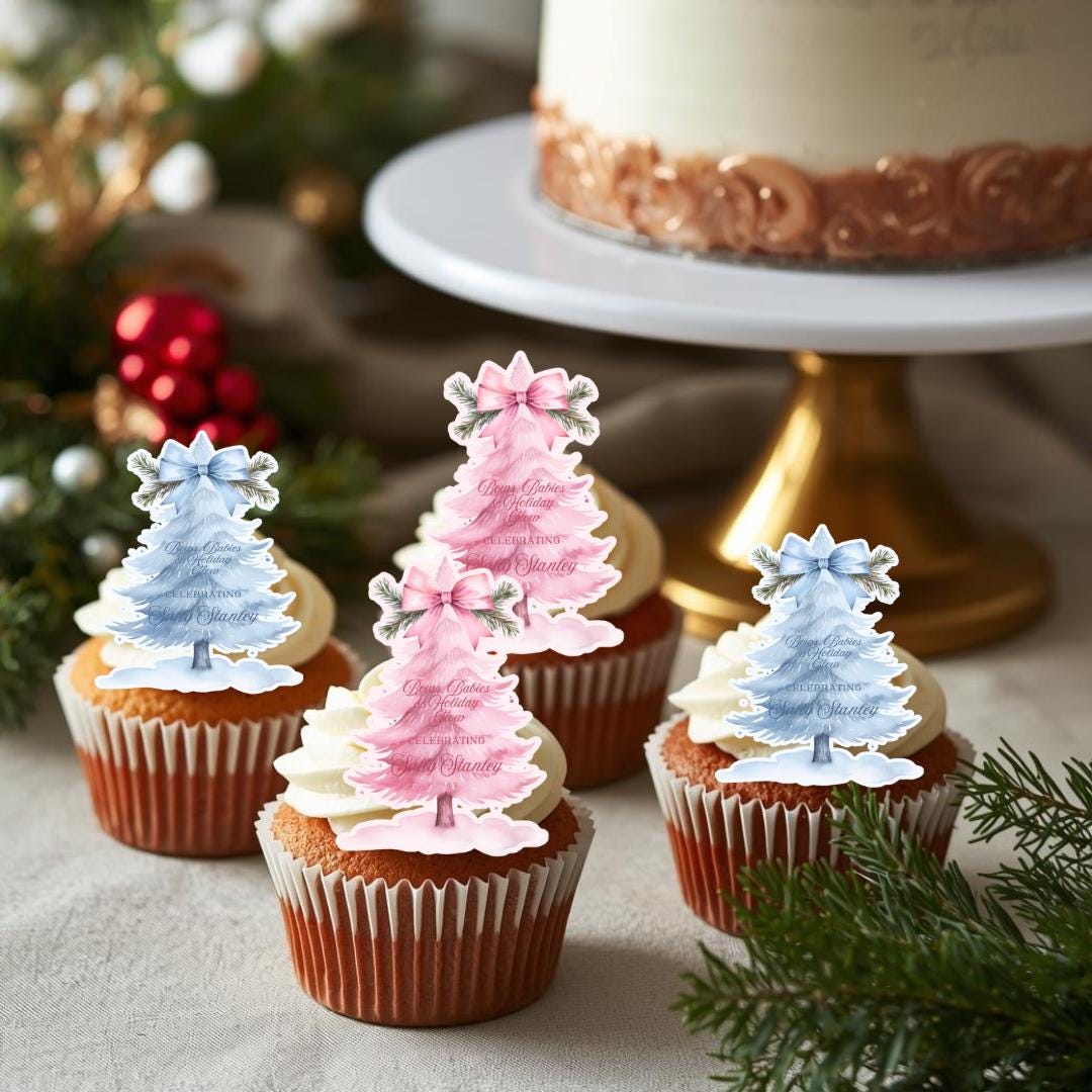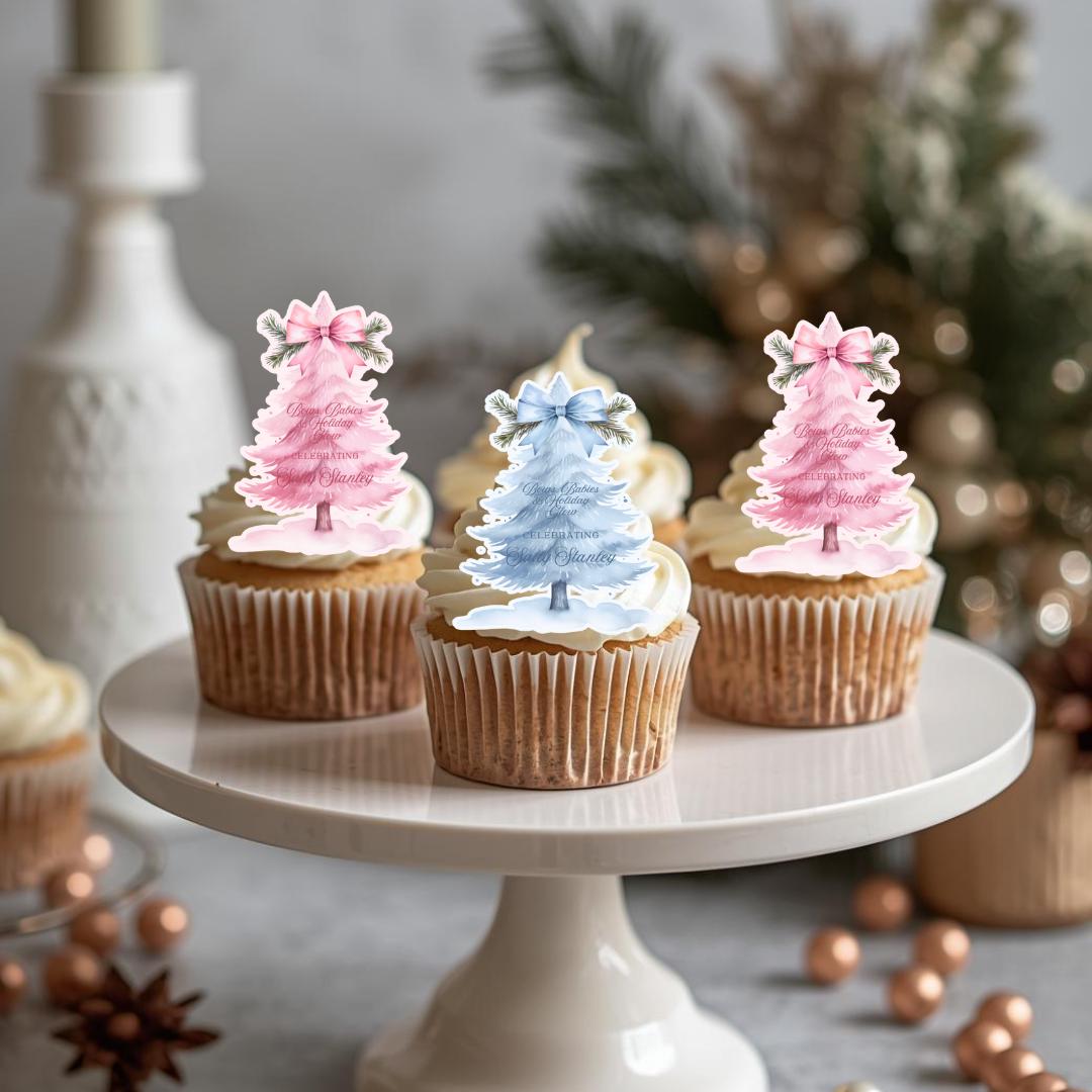 ✨ Blue or Pink Christmas Tree with Bow Cupcake Toppers – Baby Shower or Gender Reveal ✨