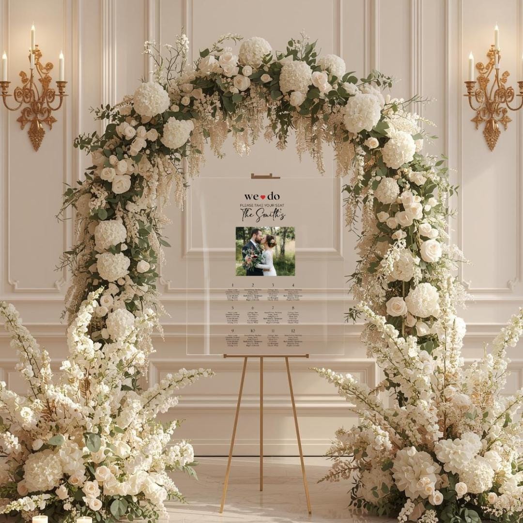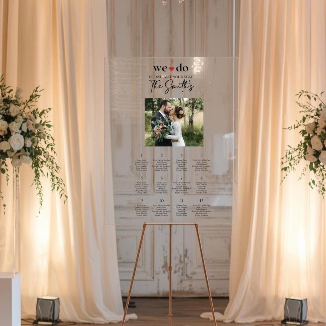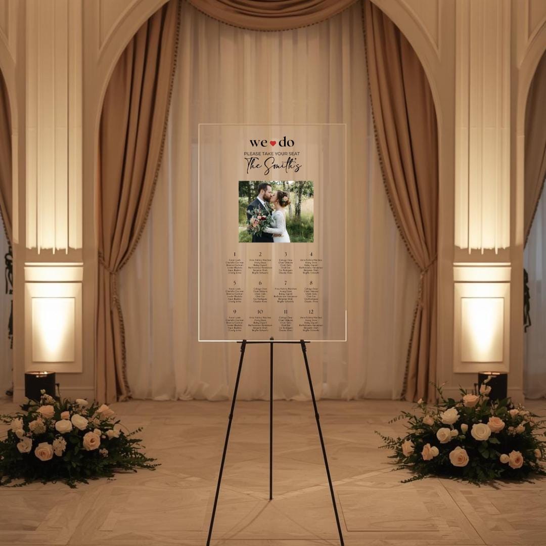 This personalized acrylic seating chart not only serves as a practical guide for your guests but also as a beautiful keepsake to cherish after your special day.