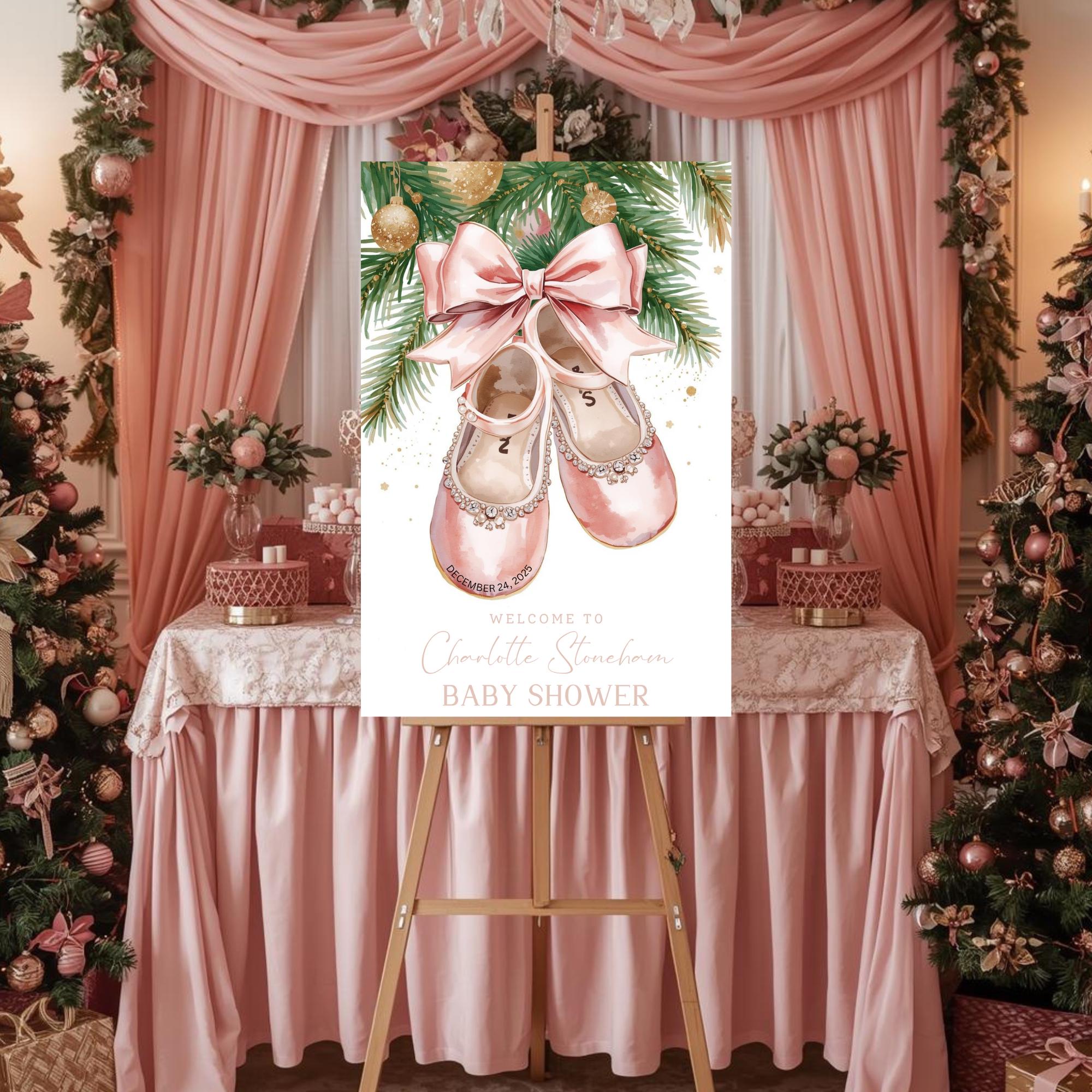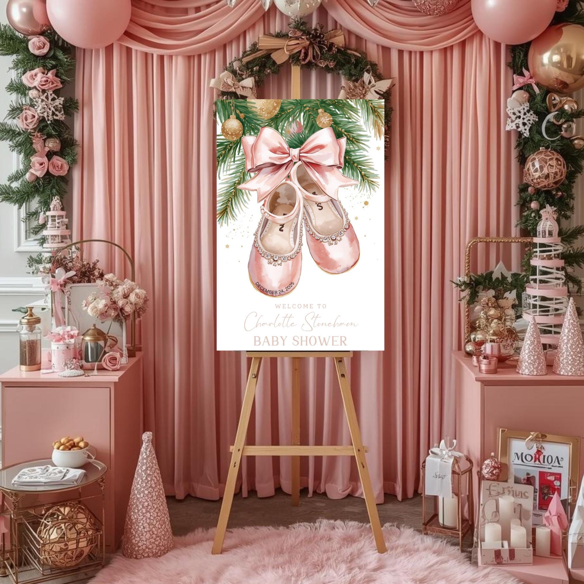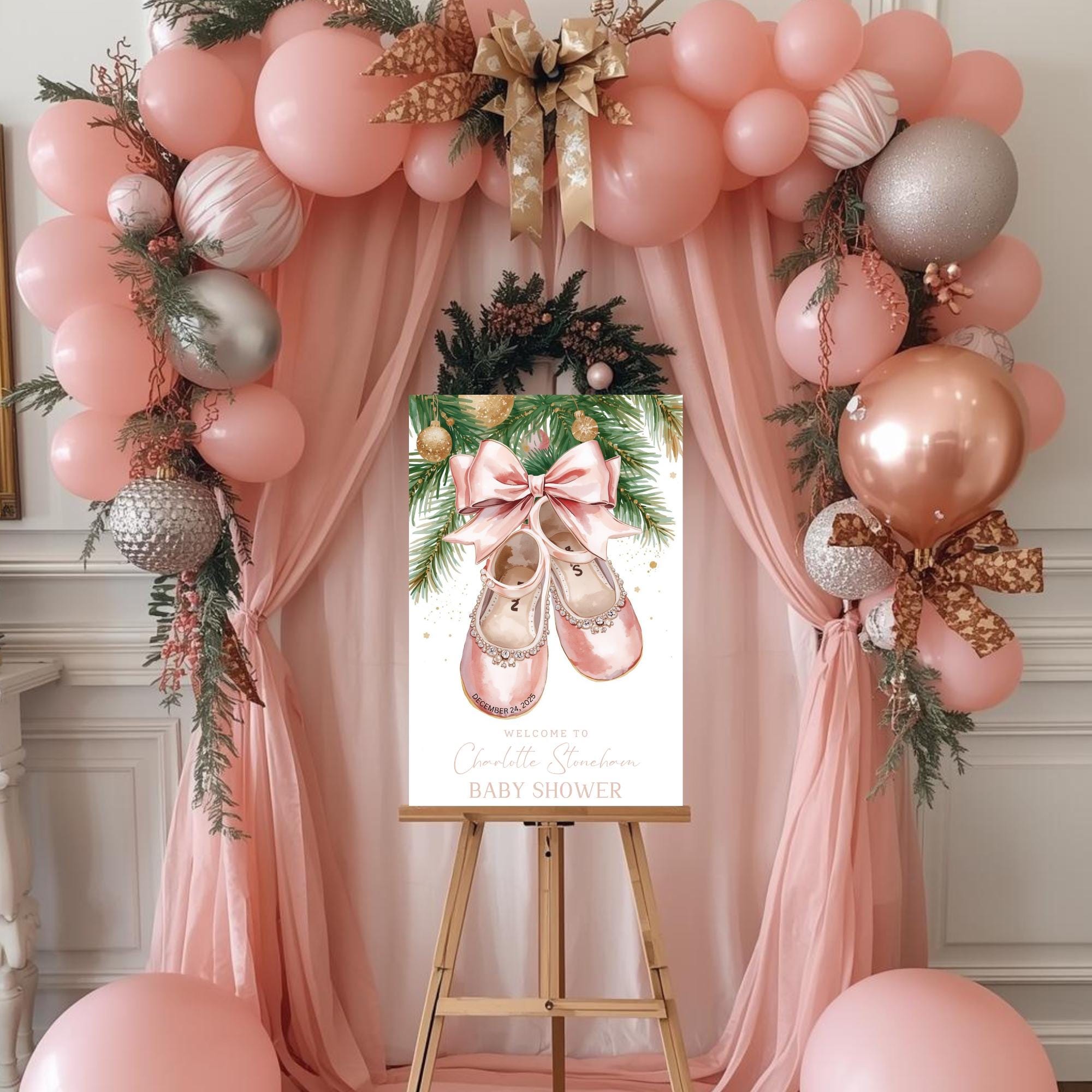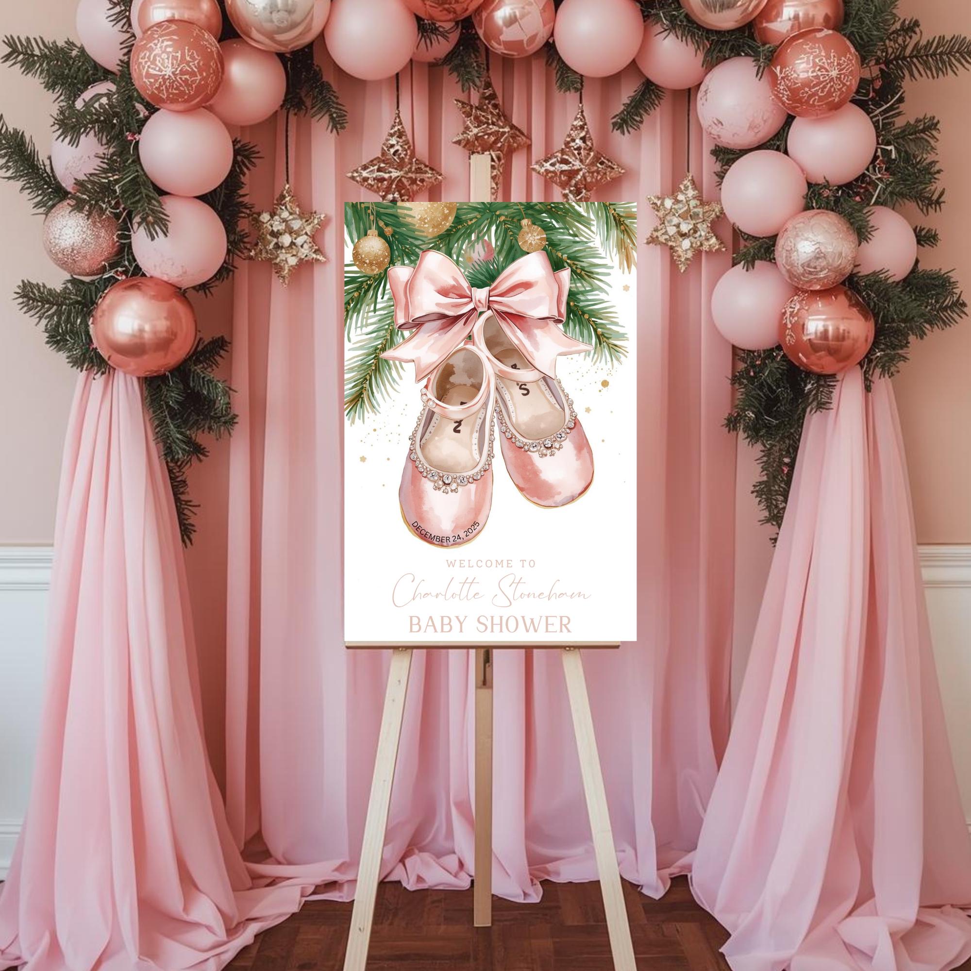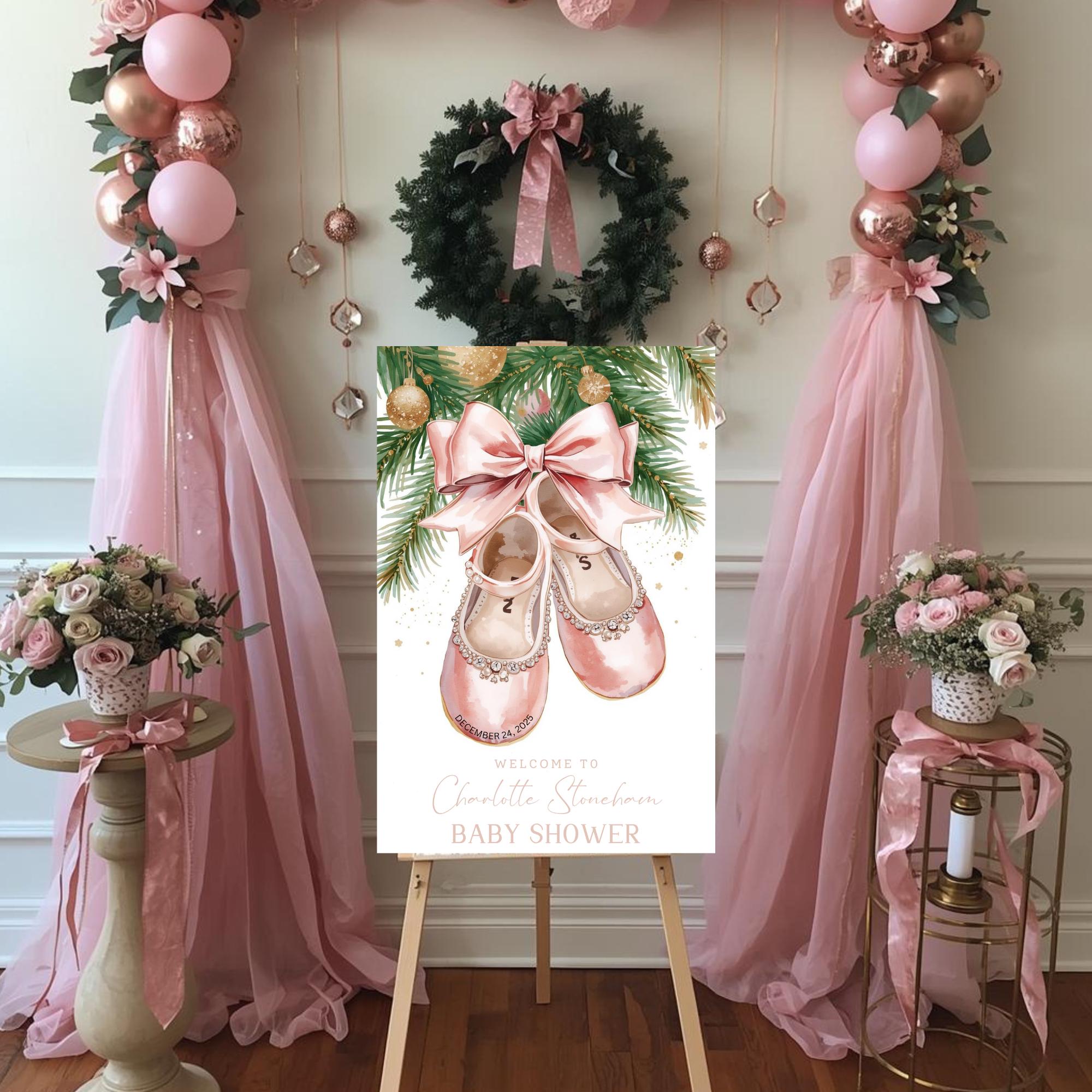 Christmas Baby Shower Welcome Sign for Girl – Personalized Pink Baby Shoes Decor – Holiday Baby Shower Decoration – Custom Printable Sign for Mom-to-Be