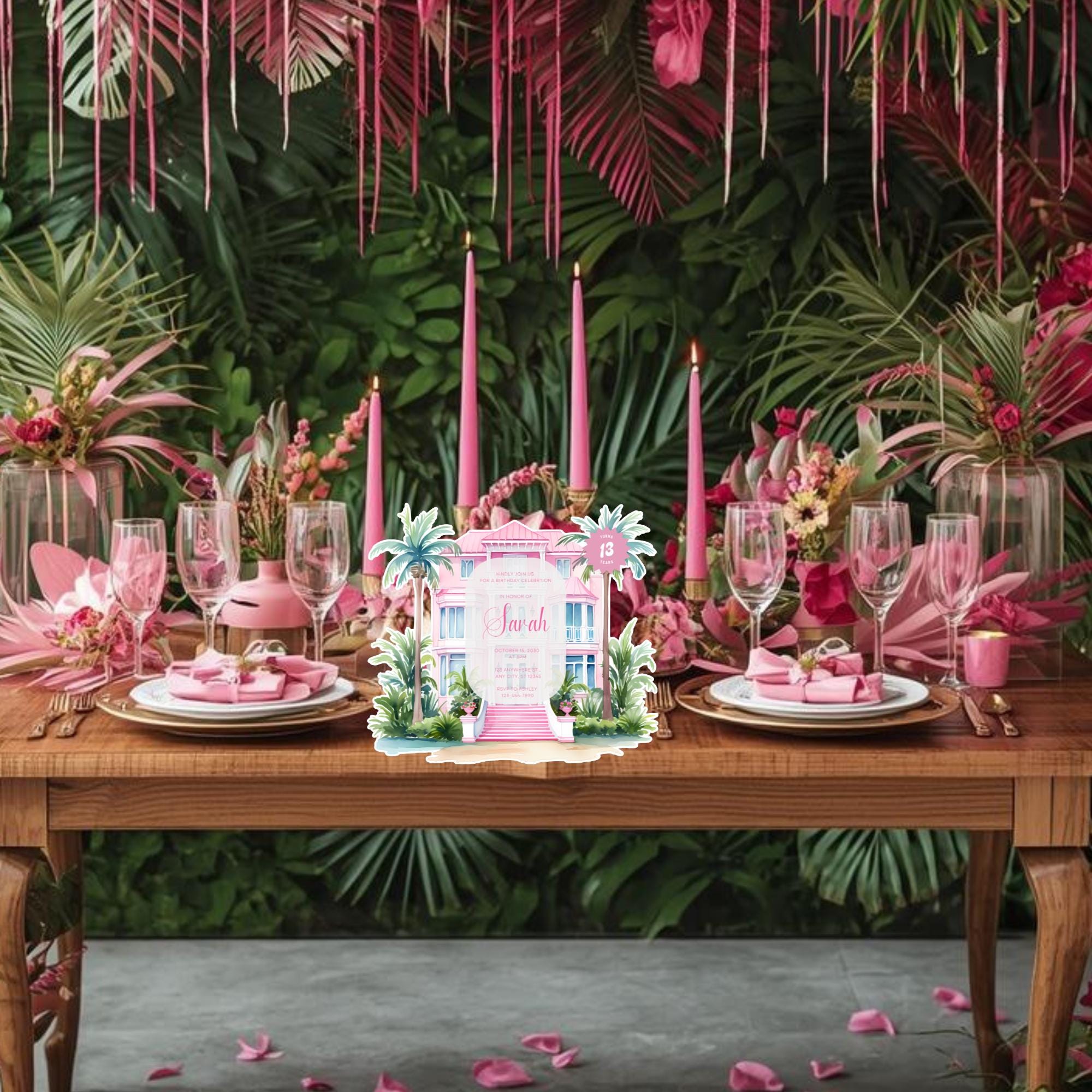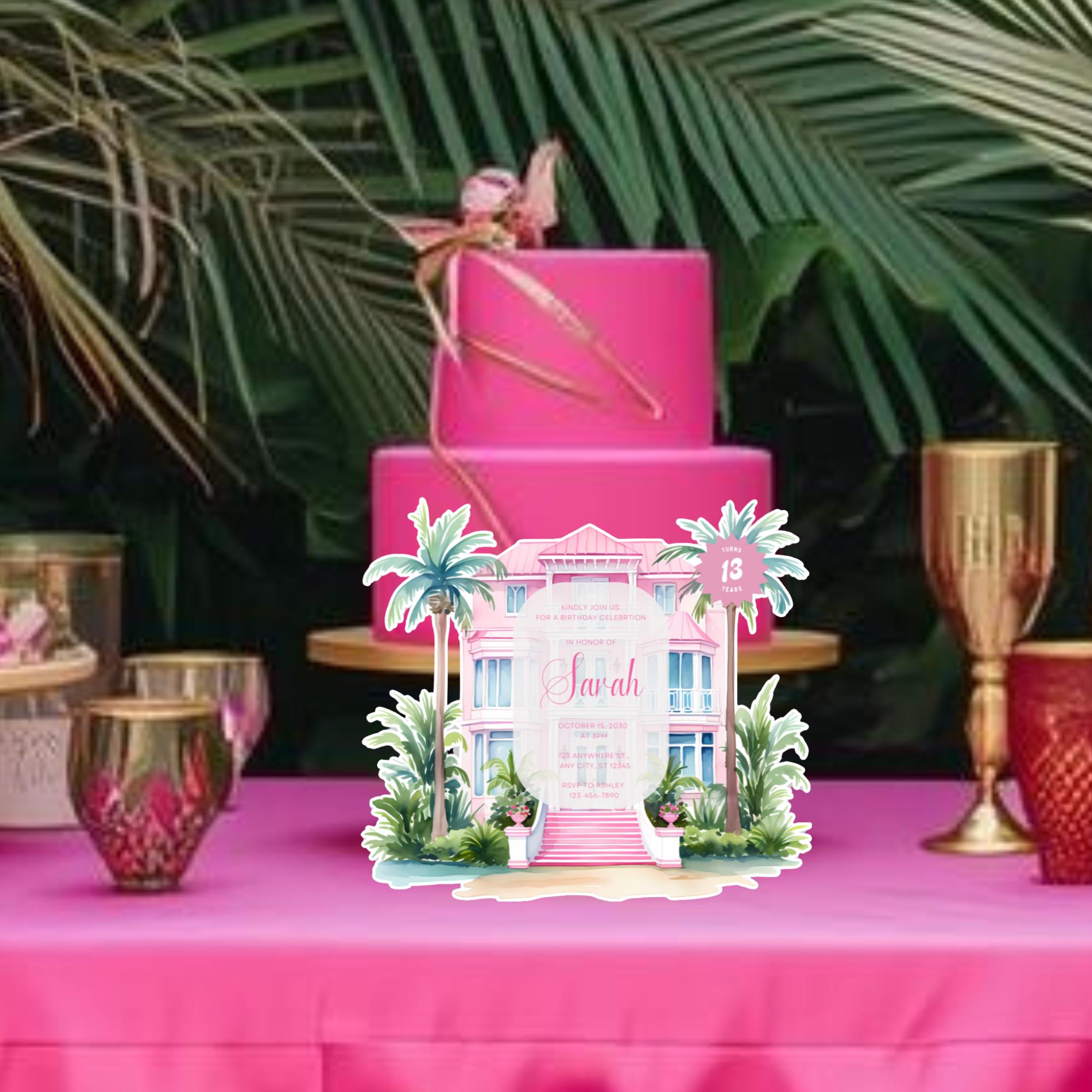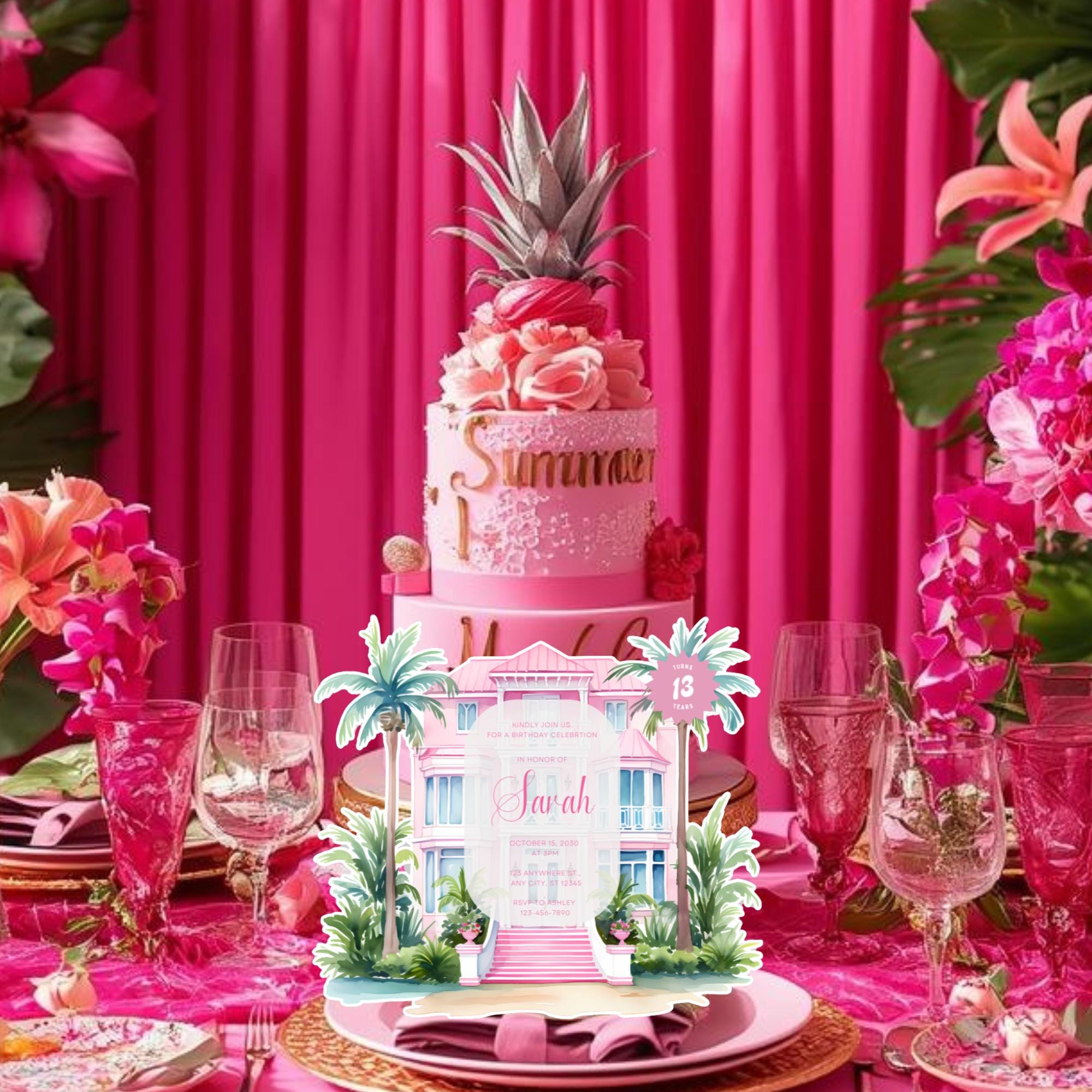 Add a fun, tropical twist to your celebration with this adorable pink dollhouse-shaped invitation! Perfect for birthdays or any special occasion, each invite is carefully cut to shape and printed on premium cardstock for a high-quality, vibrant finish.