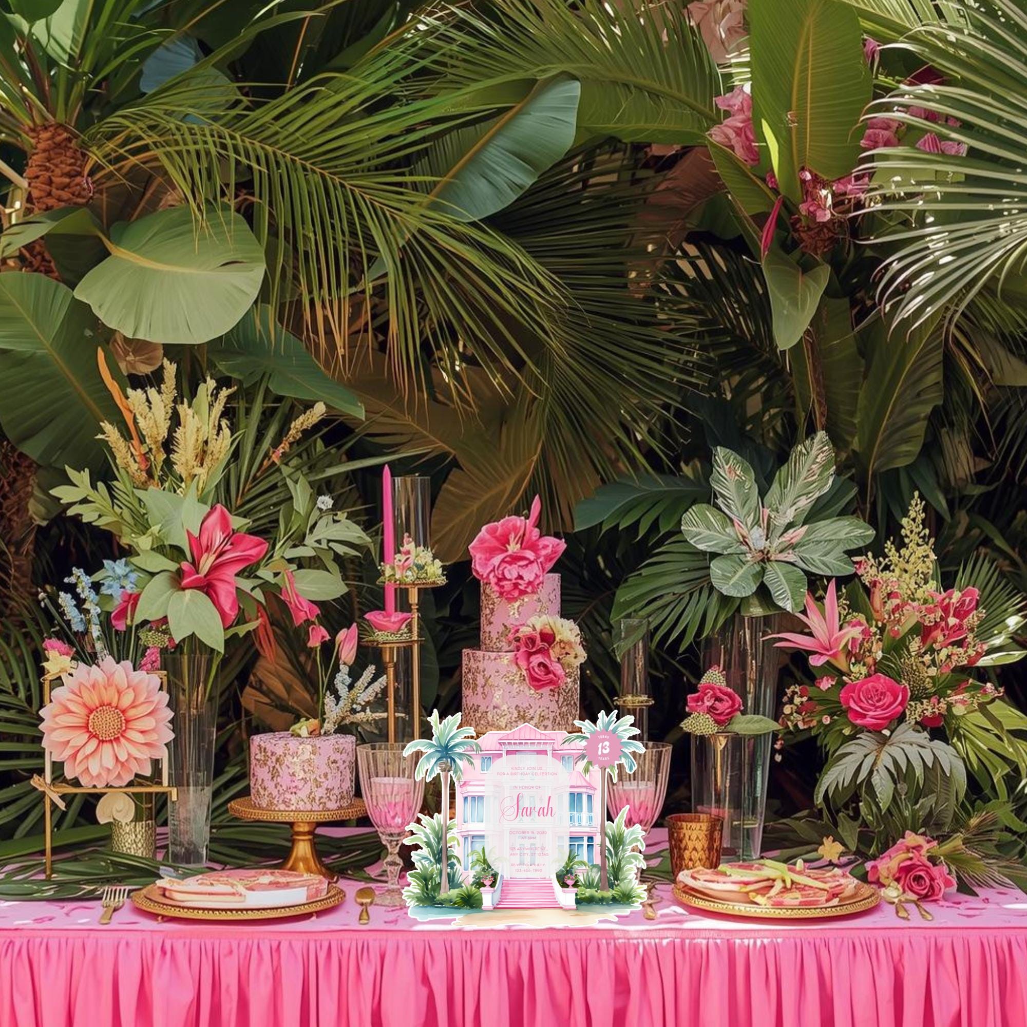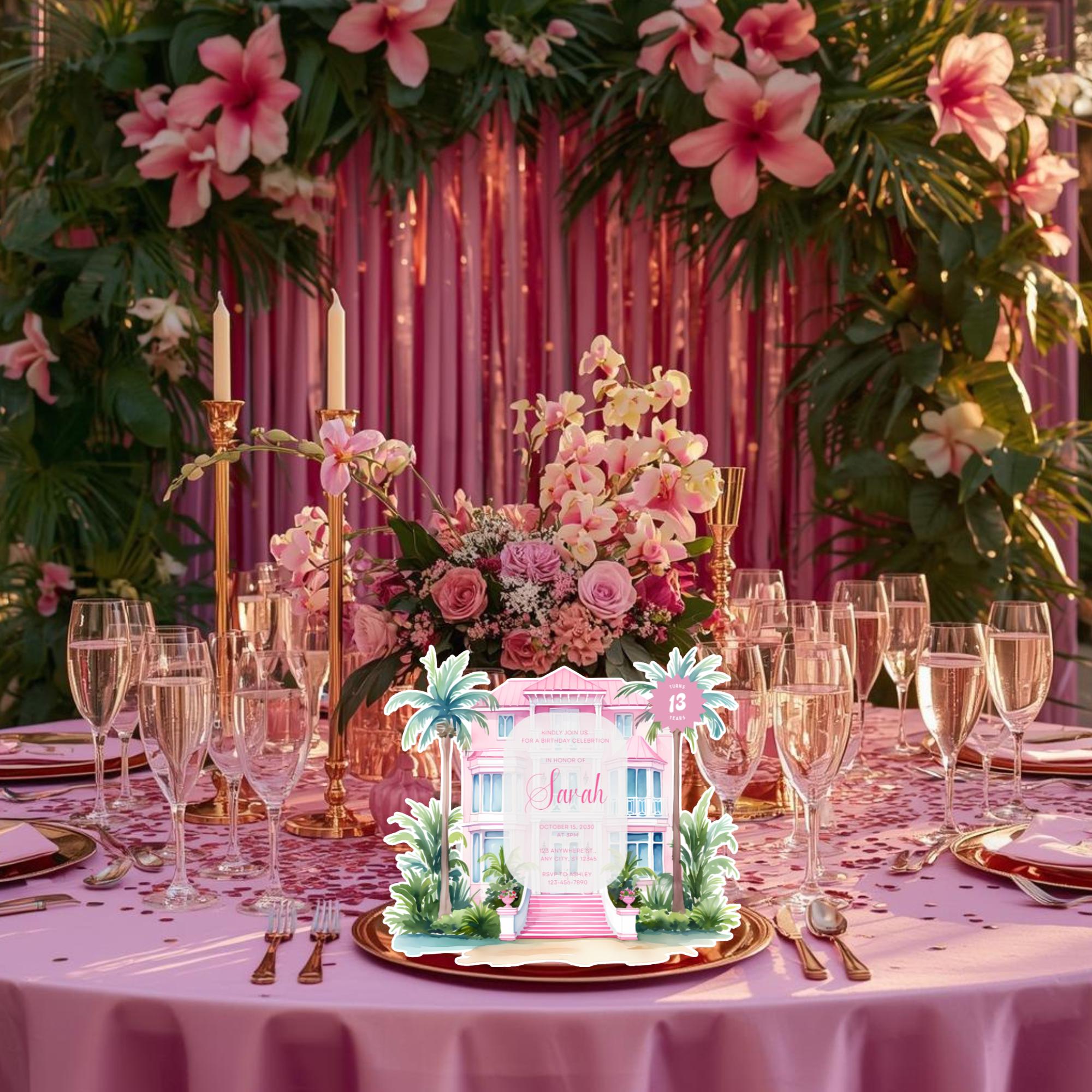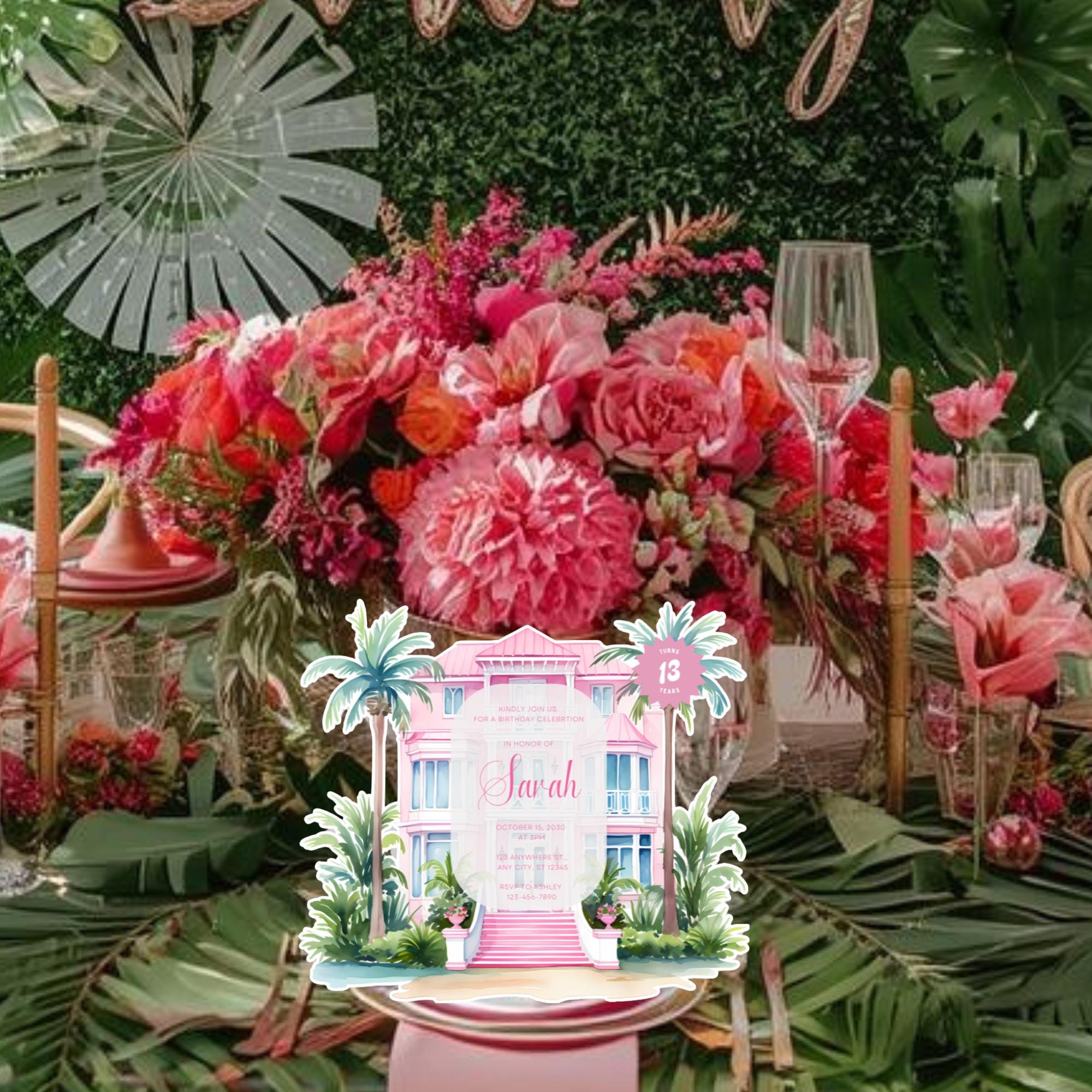 Add a fun, tropical twist to your celebration with this adorable pink dollhouse-shaped invitation! Perfect for birthdays or any special occasion, each invite is carefully cut to shape and printed on premium cardstock for a high-quality, vibrant finish.
