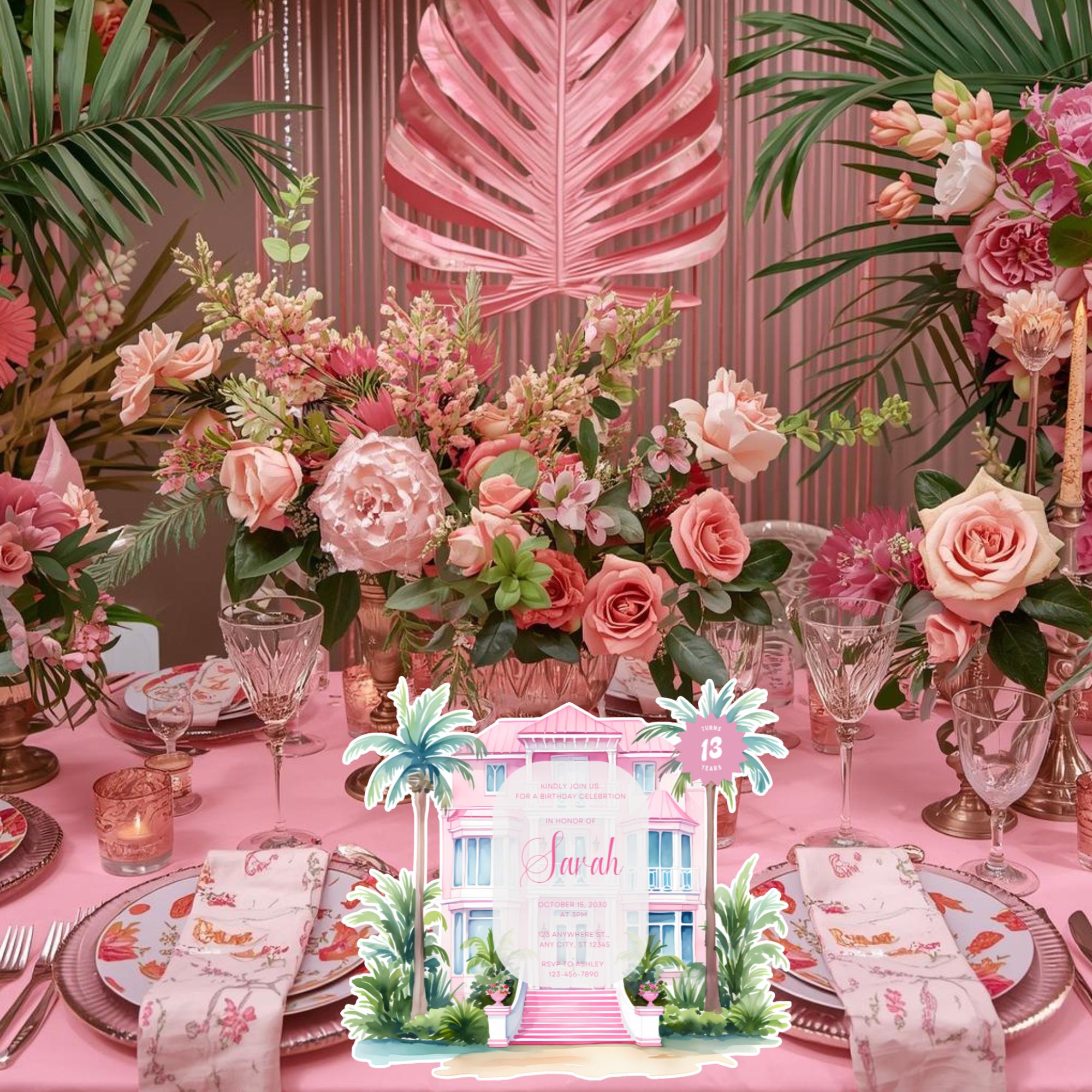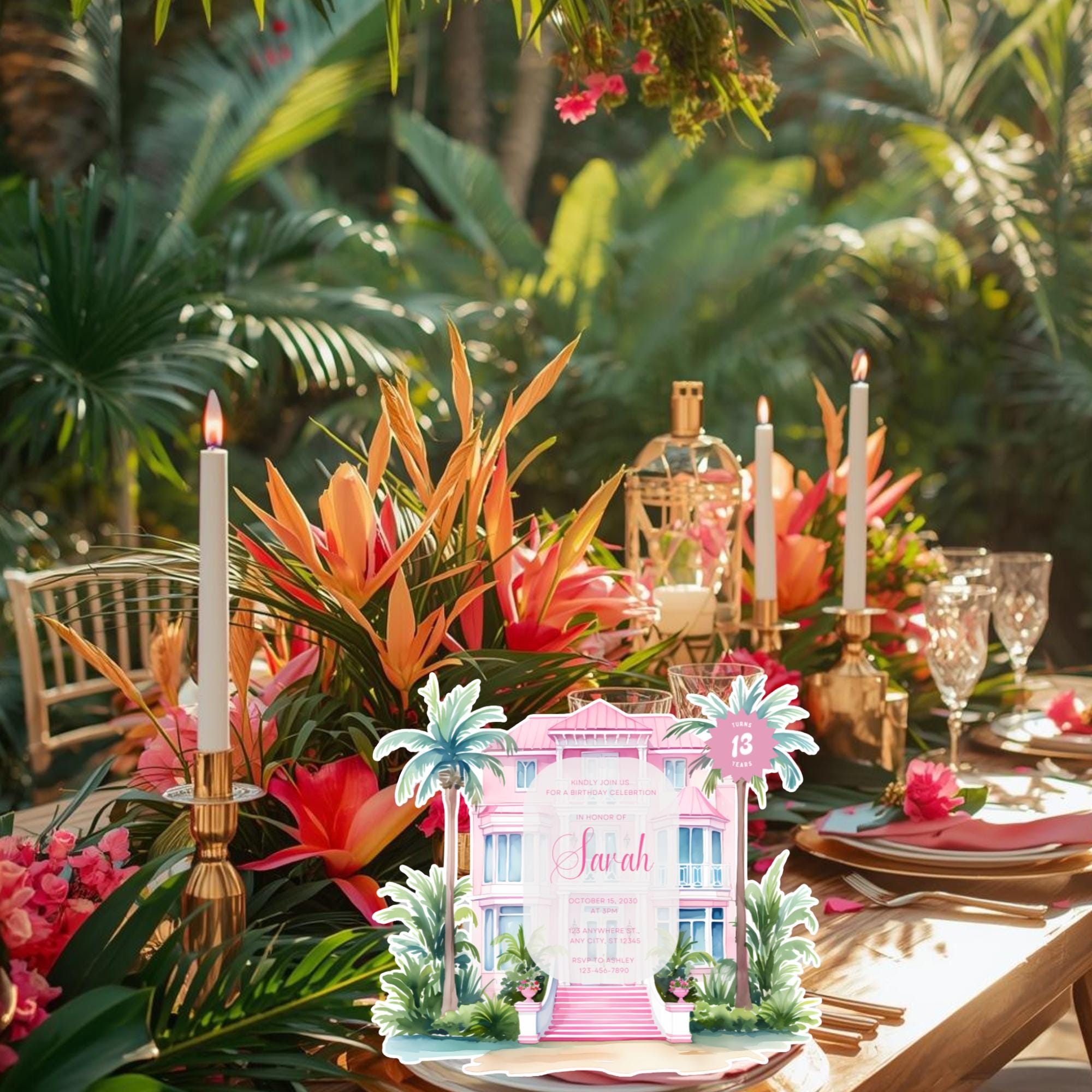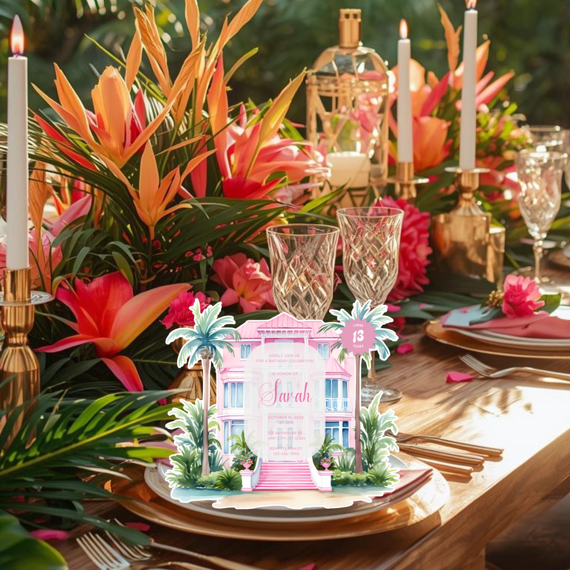 Tropical Pink Dollhouse Invitation | House Shaped Girl Birthday Invite | Printed Party Card | Any Occasion