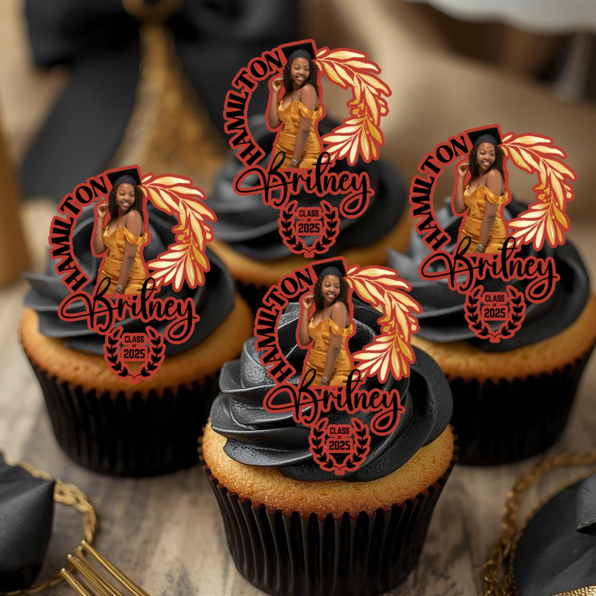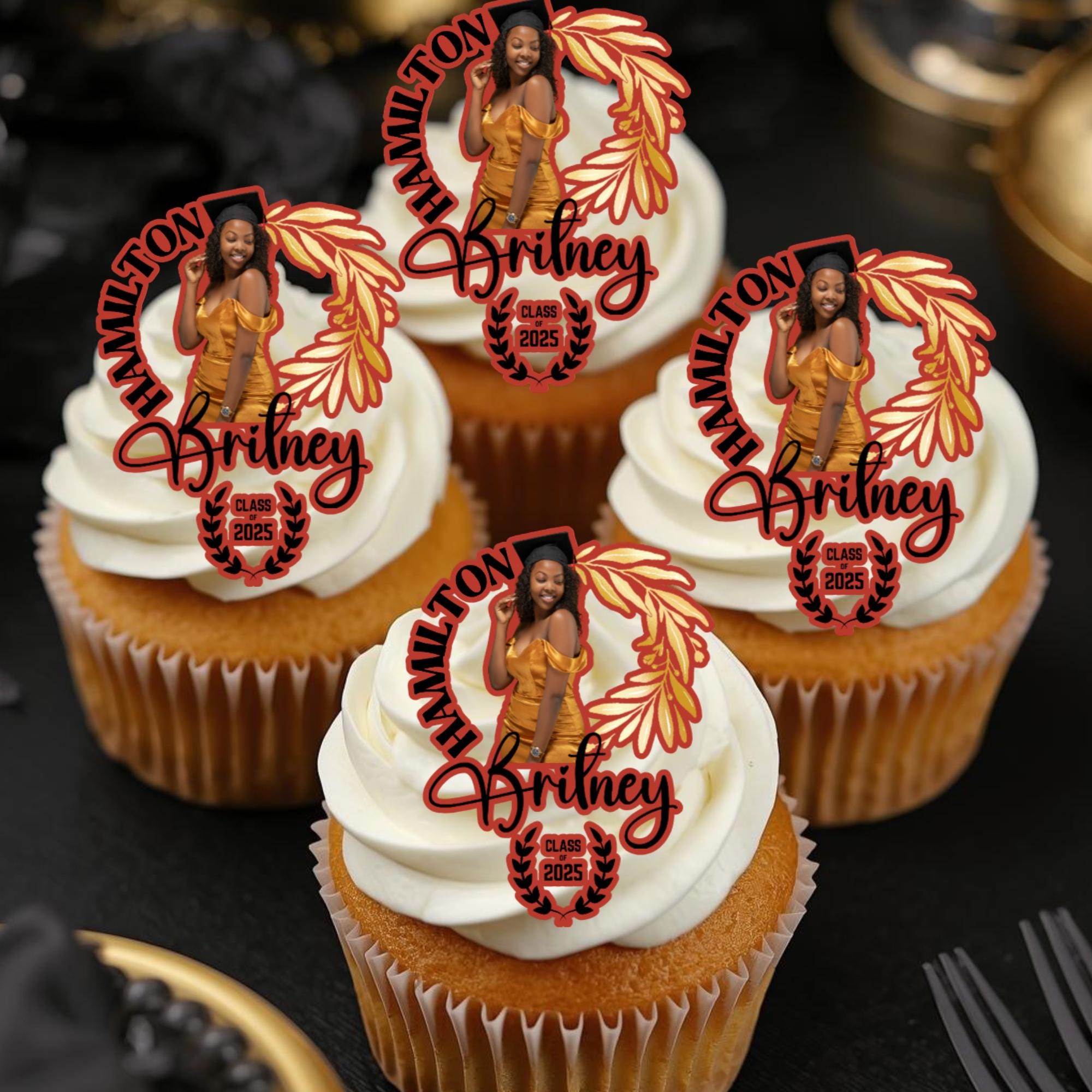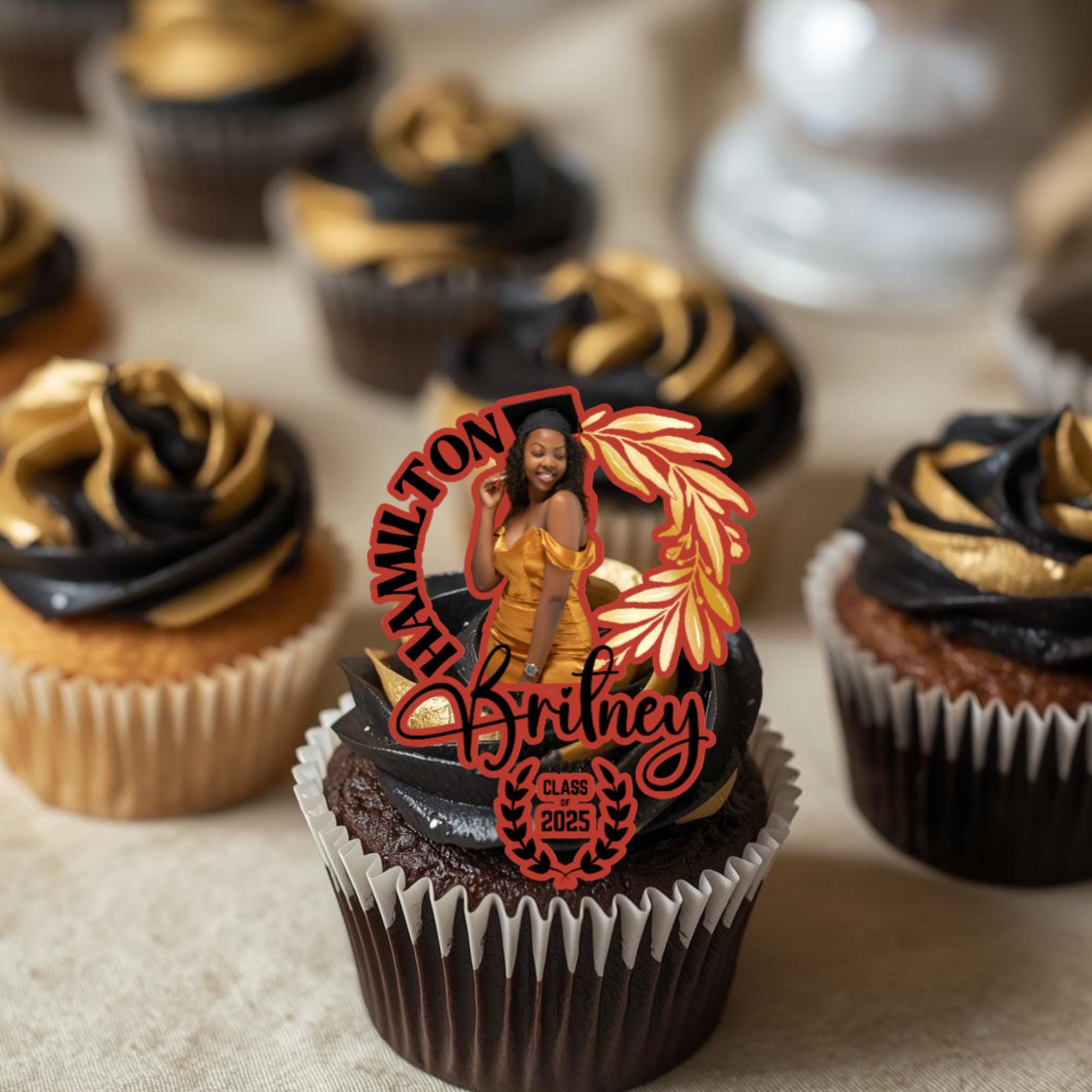 Celebrate your 2025 graduate with a personalized topper featuring their photo, name, and preferred background color. Perfect for cupcakes, cakes, dessert tables, school celebrations, and senior parties—designed to match any theme.