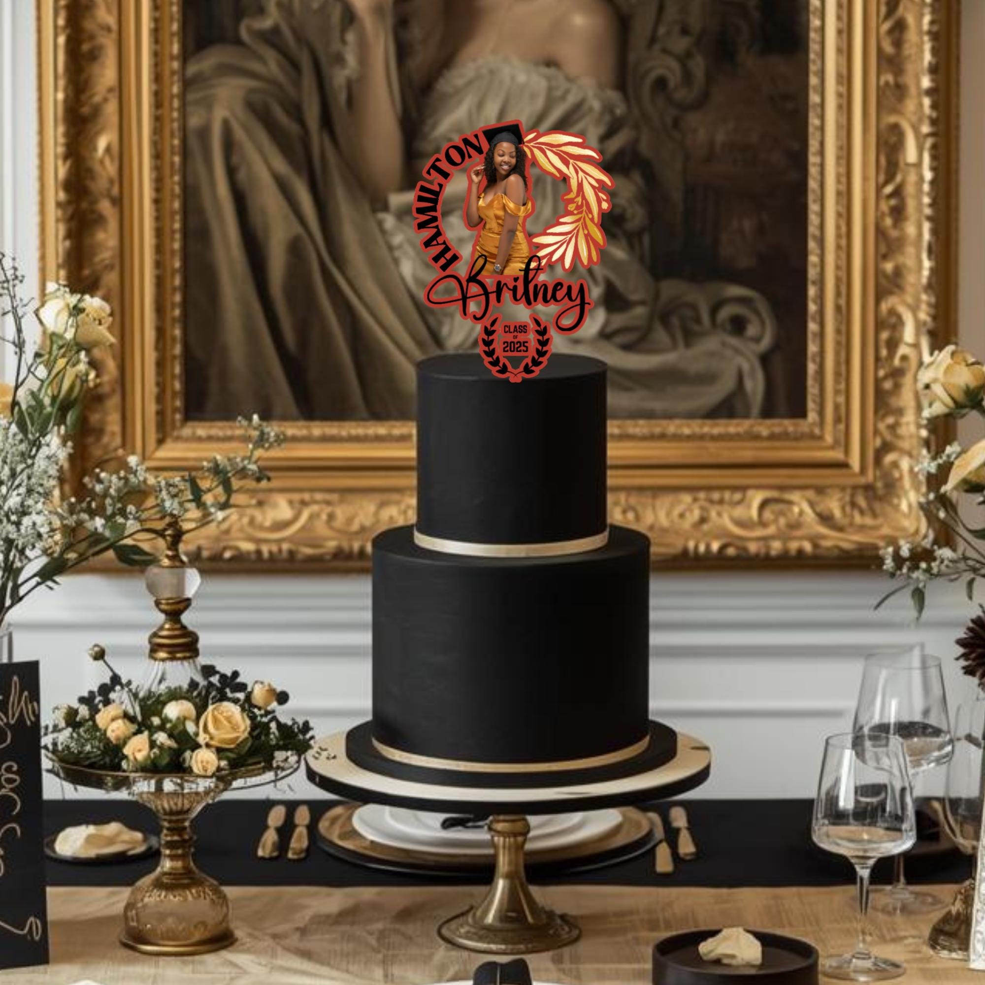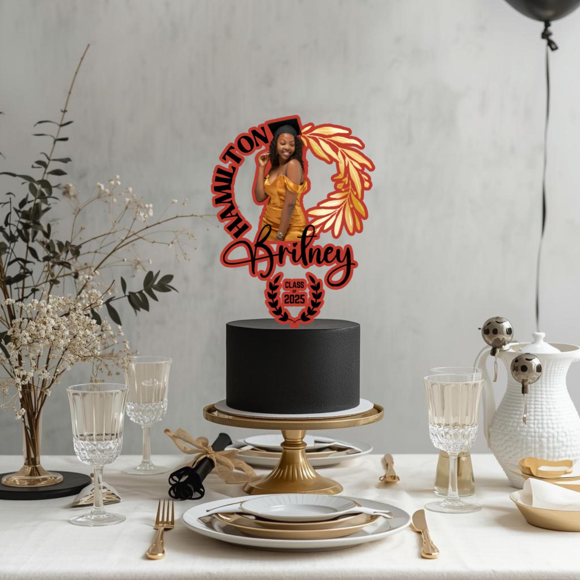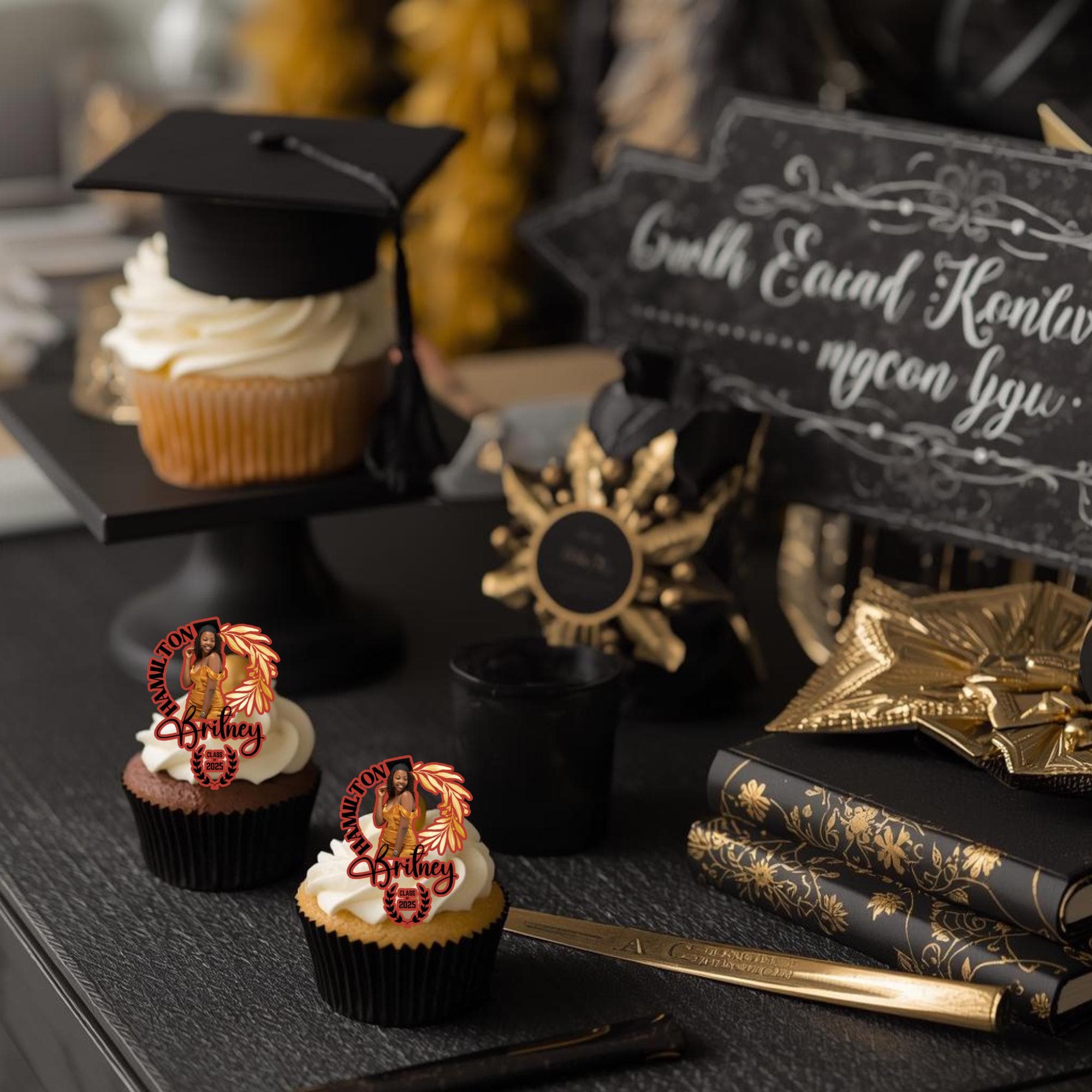 Celebrate your 2025 graduate with a personalized topper featuring their photo, name, and preferred background color. Perfect for cupcakes, cakes, dessert tables, school celebrations, and senior parties—designed to match any theme.