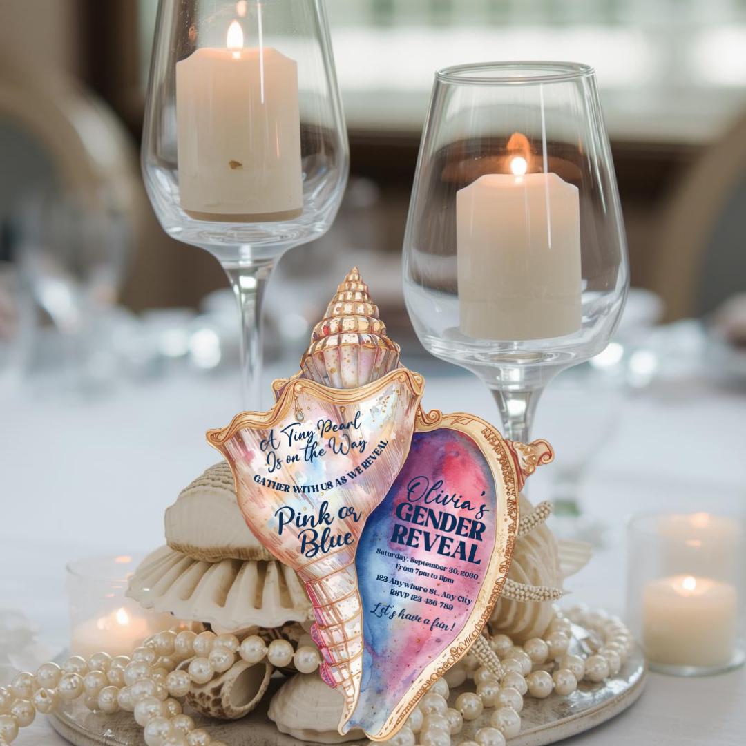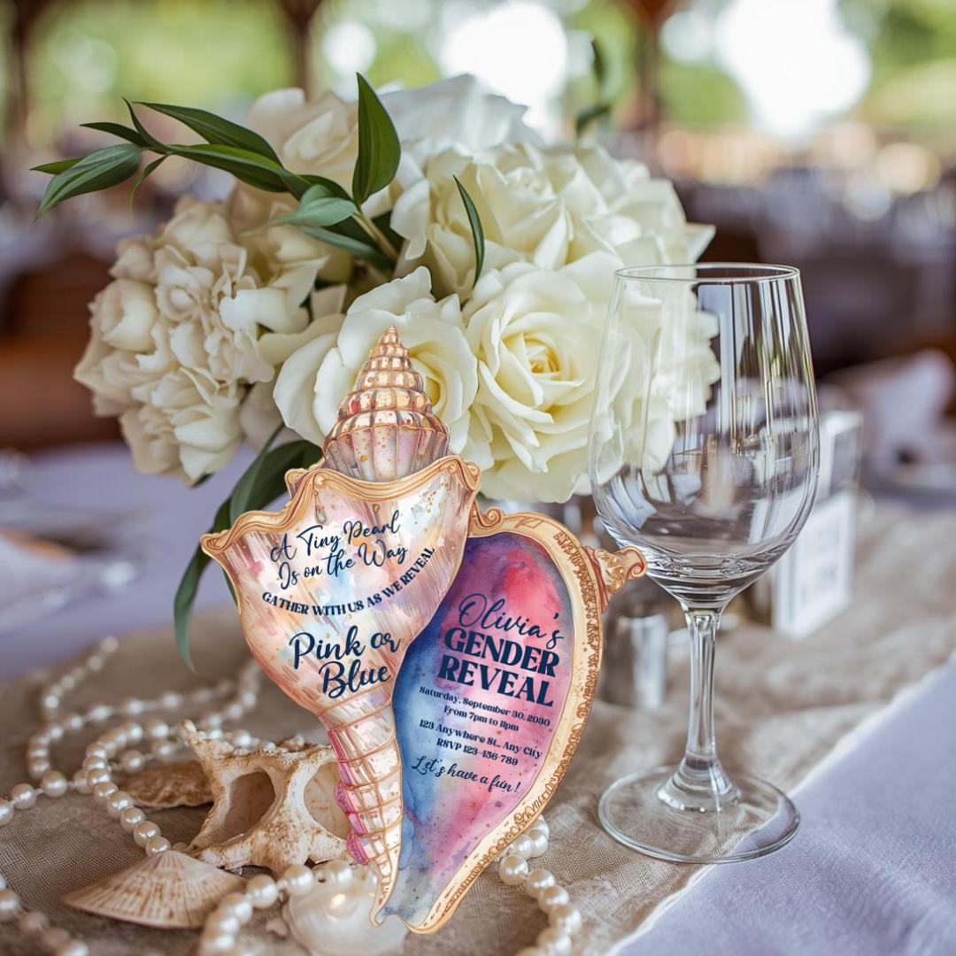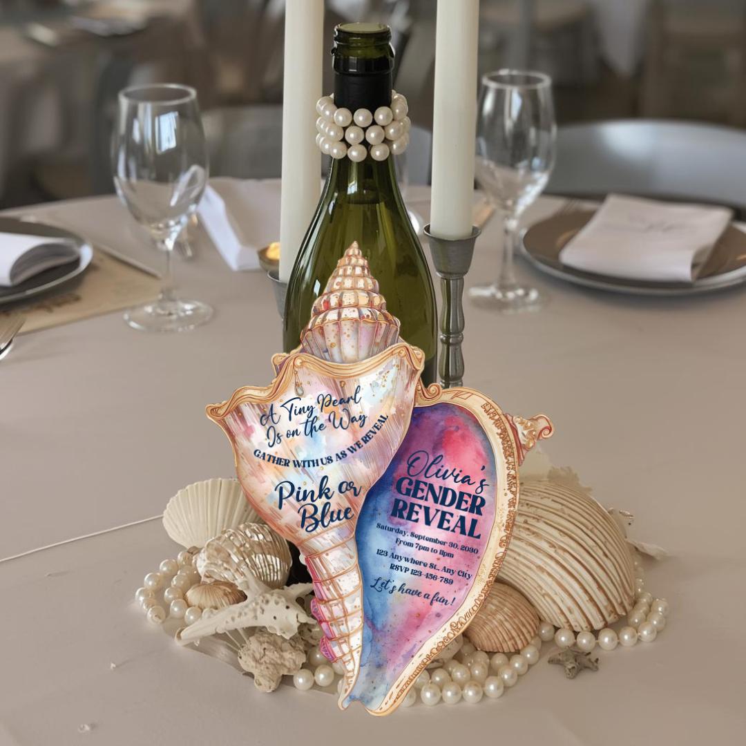 Make your celebration unforgettable with this elegant pink and blue seashell-shaped invitation, beautifully designed and cut to shape for a stunning coastal touch. Each invite measures 5" x 6.5" and features a soft ocean-inspired aesthetic perfect for a gender reveal, baby shower, or any special occasion you choose.