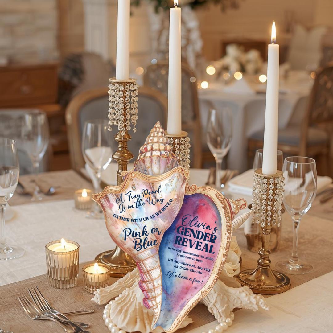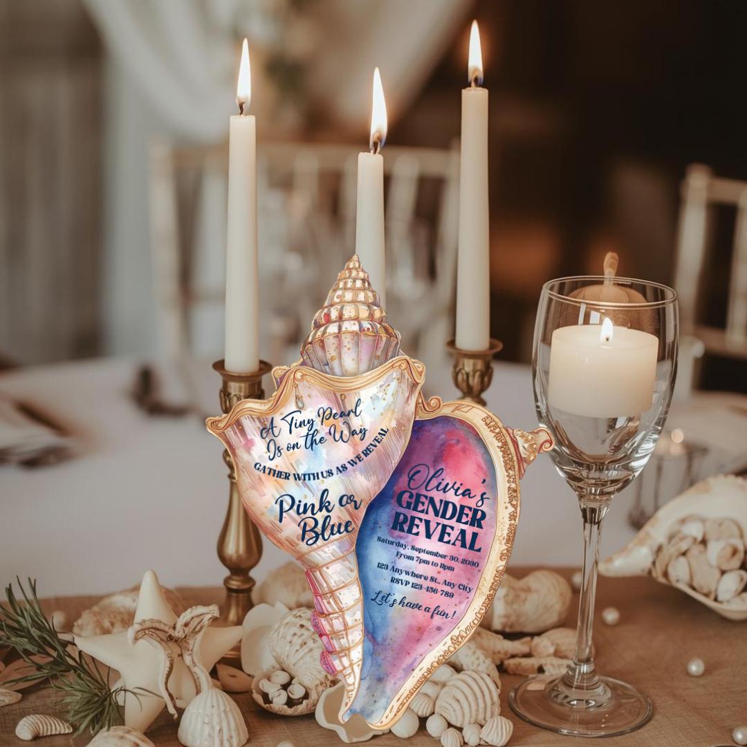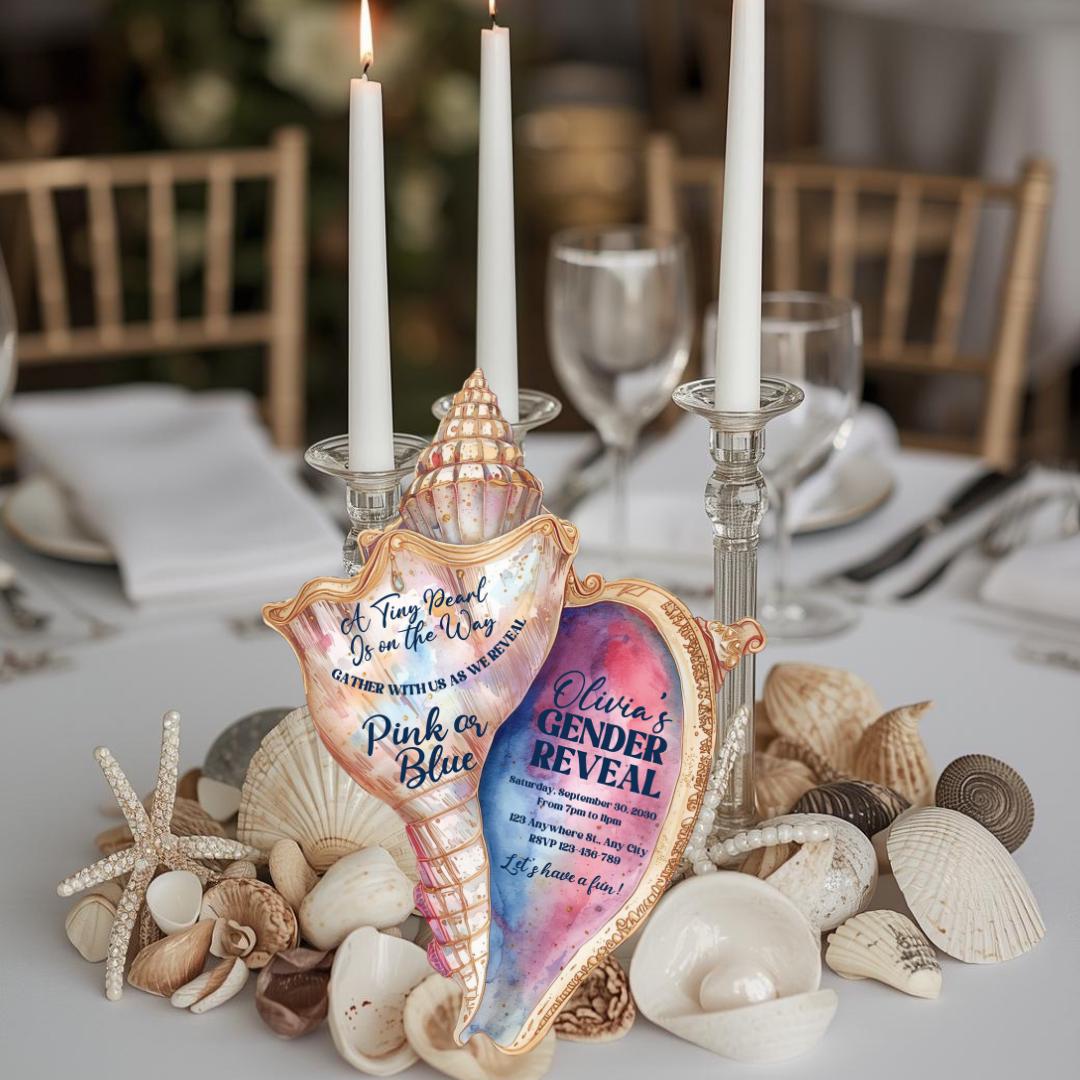 Make your celebration unforgettable with this elegant pink and blue seashell-shaped invitation, beautifully designed and cut to shape for a stunning coastal touch. Each invite measures 5" x 6.5" and features a soft ocean-inspired aesthetic perfect for a gender reveal, baby shower, or any special occasion you choose.