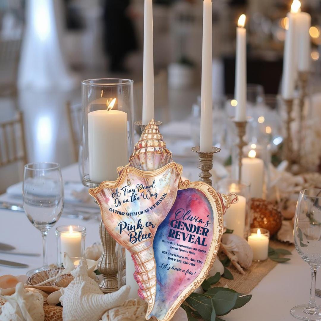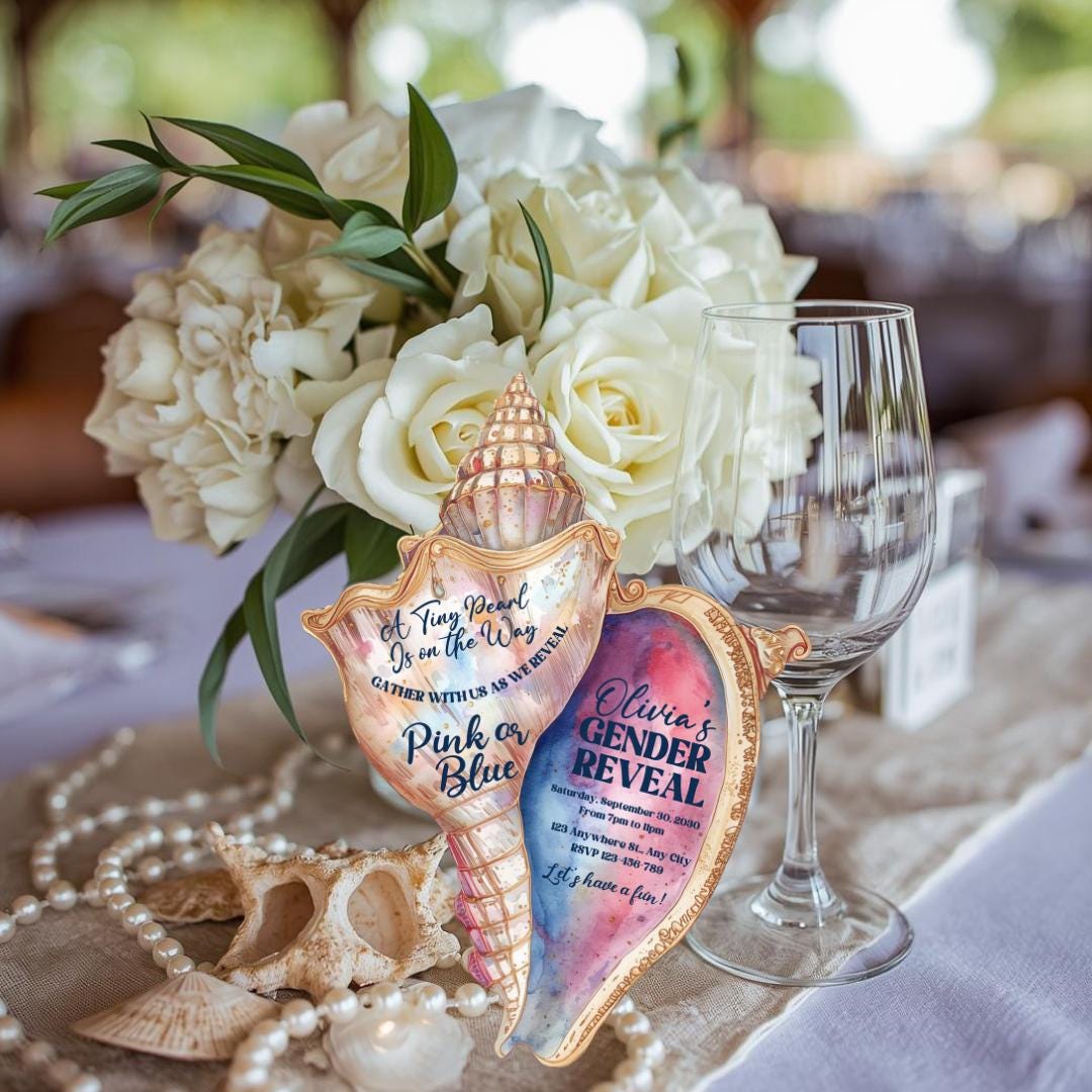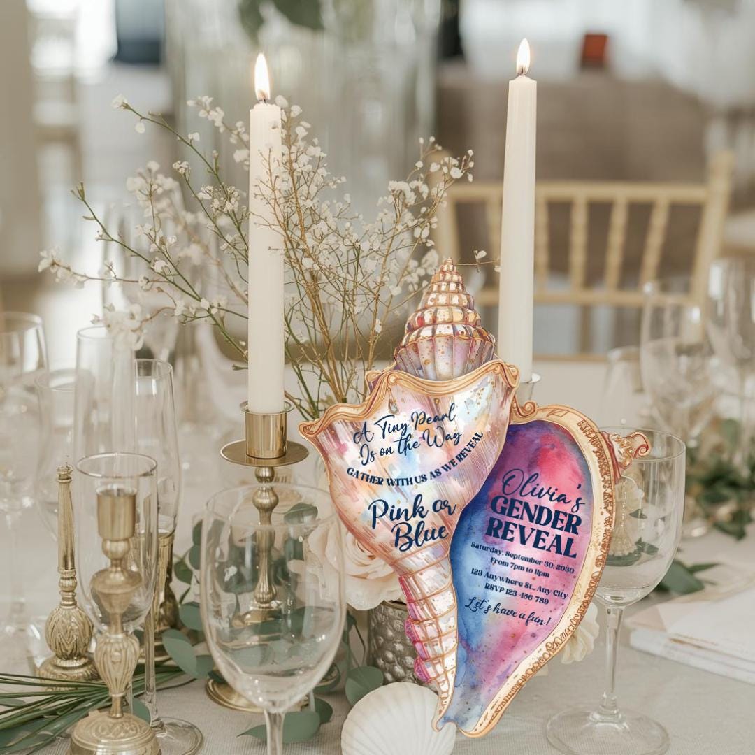 This invitation is editable, allowing you to customize names, dates, wording, and event details to match your theme. Whether you're hosting a seaside gender reveal or a beach-inspired celebration, this unique shell design adds sophistication and charm to your event.