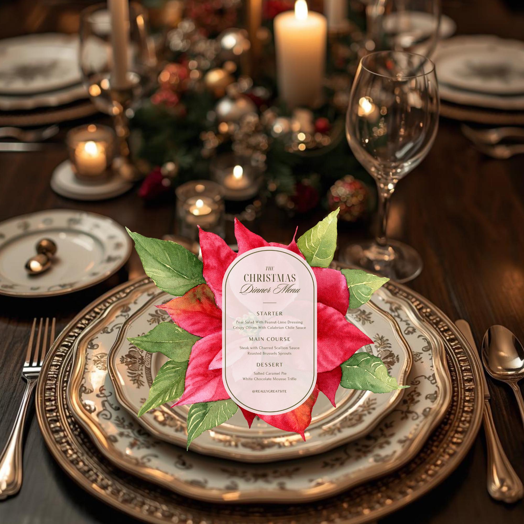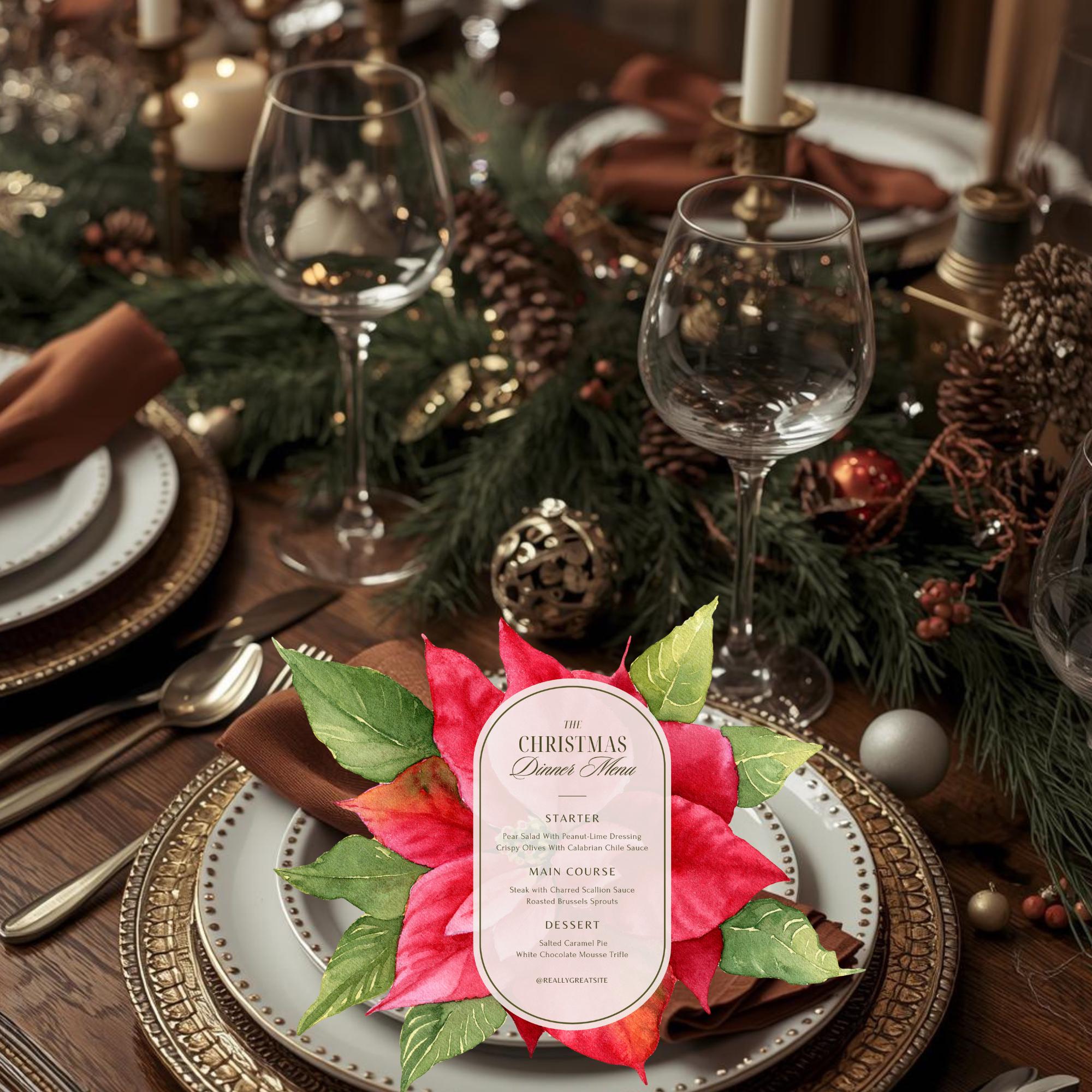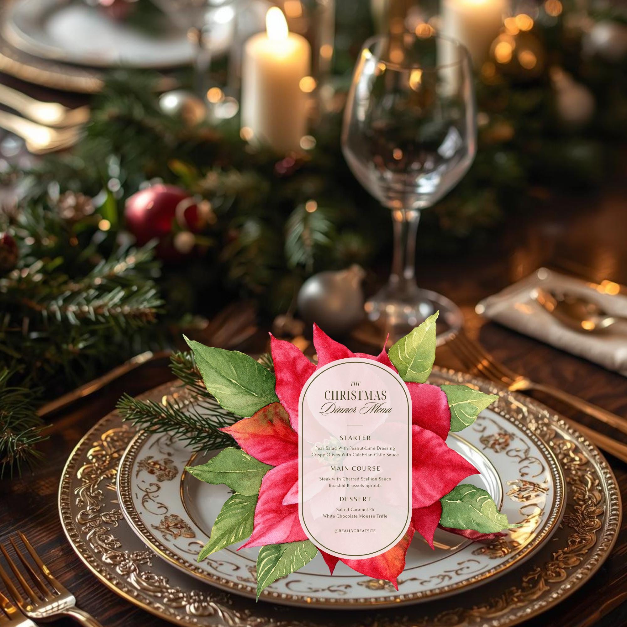 Christmas Poinsettia Shaped Dinner Menu | Holiday Party Menu Card | Winter Dinner Party Decor | Festive Christmas Table Setting