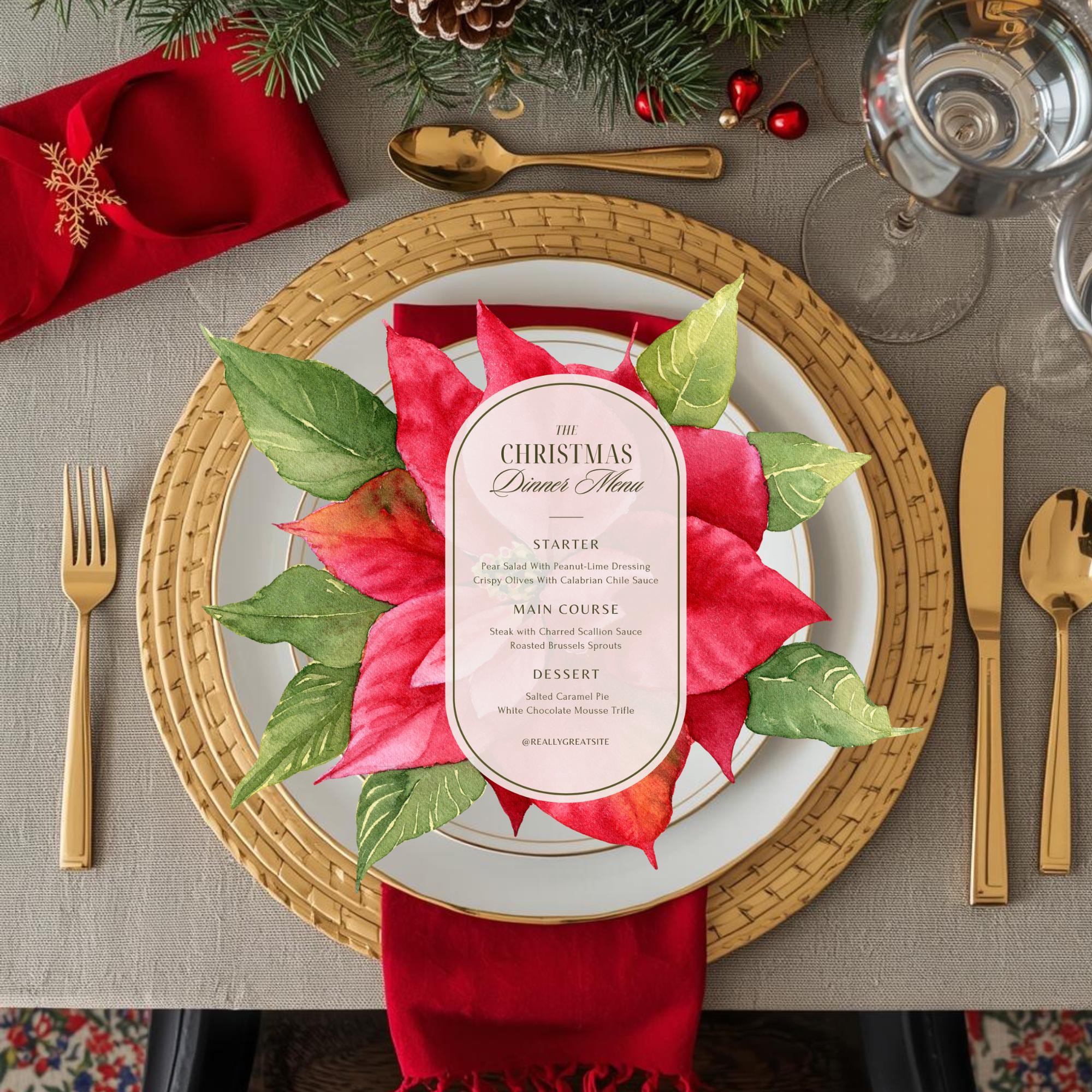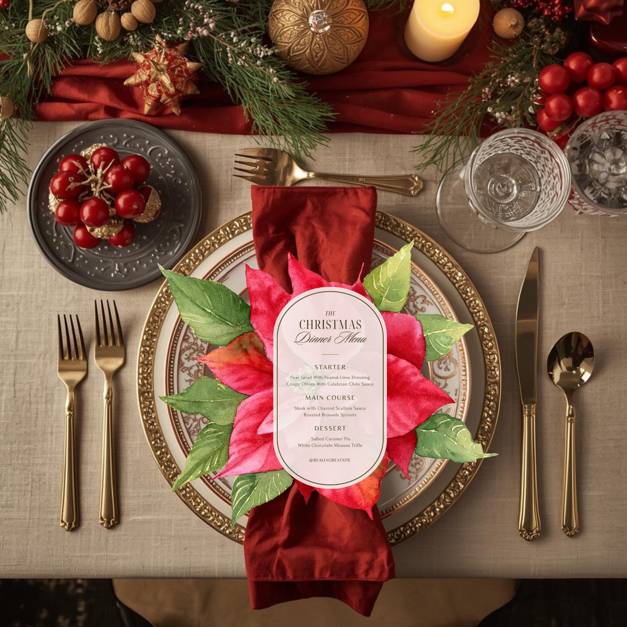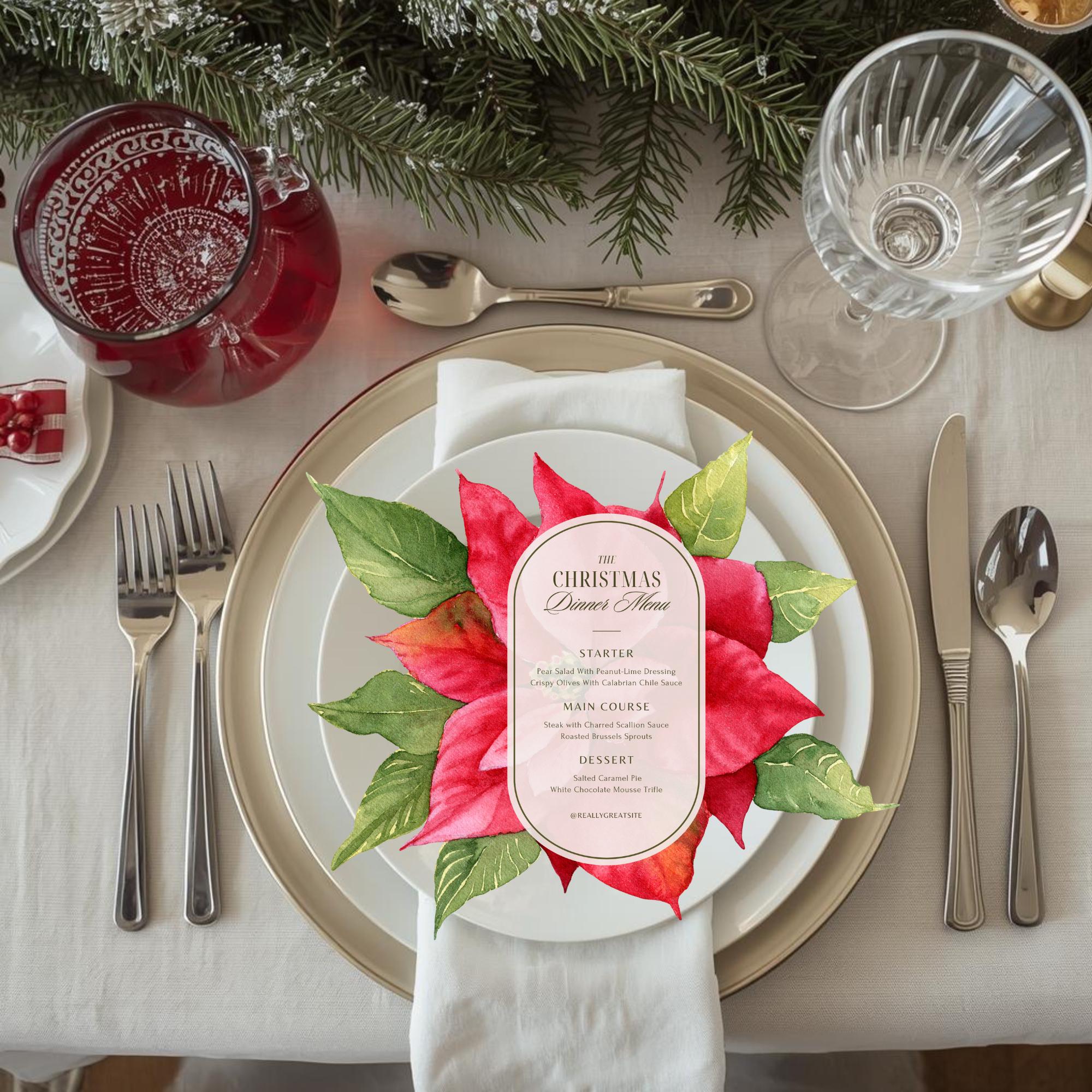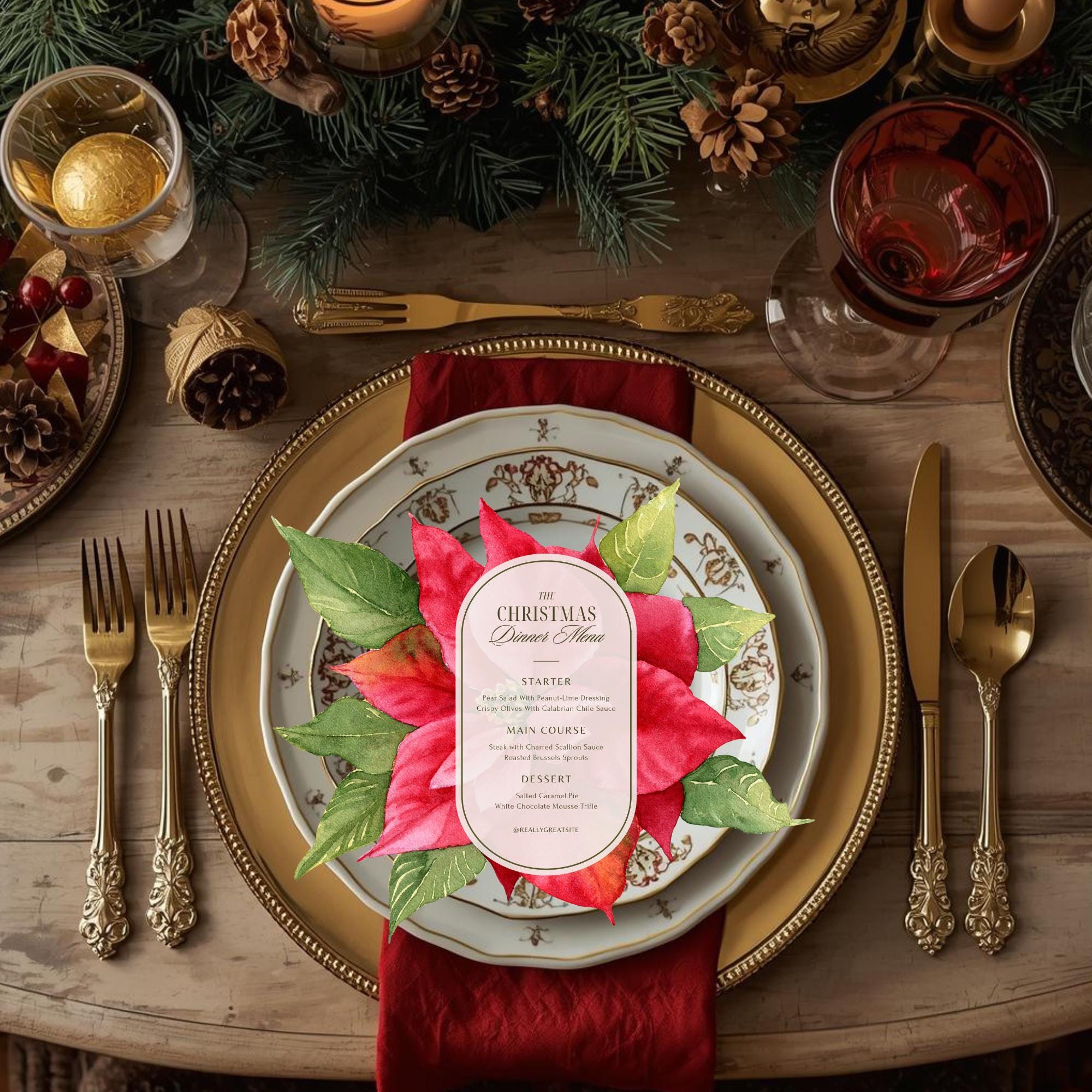 Christmas Poinsettia Shaped Dinner Menu | Holiday Party Menu Card | Winter Dinner Party Decor | Festive Christmas Table Setting