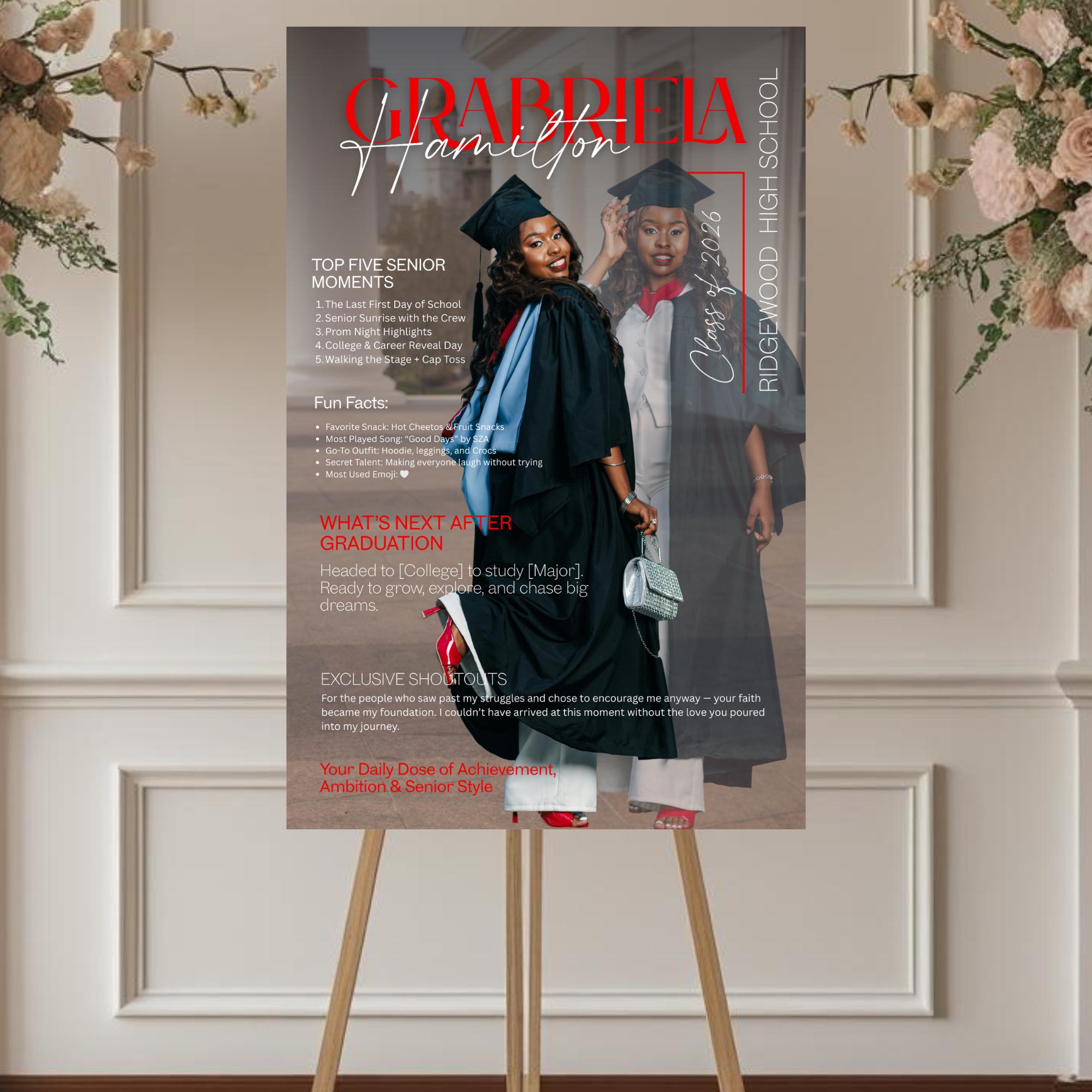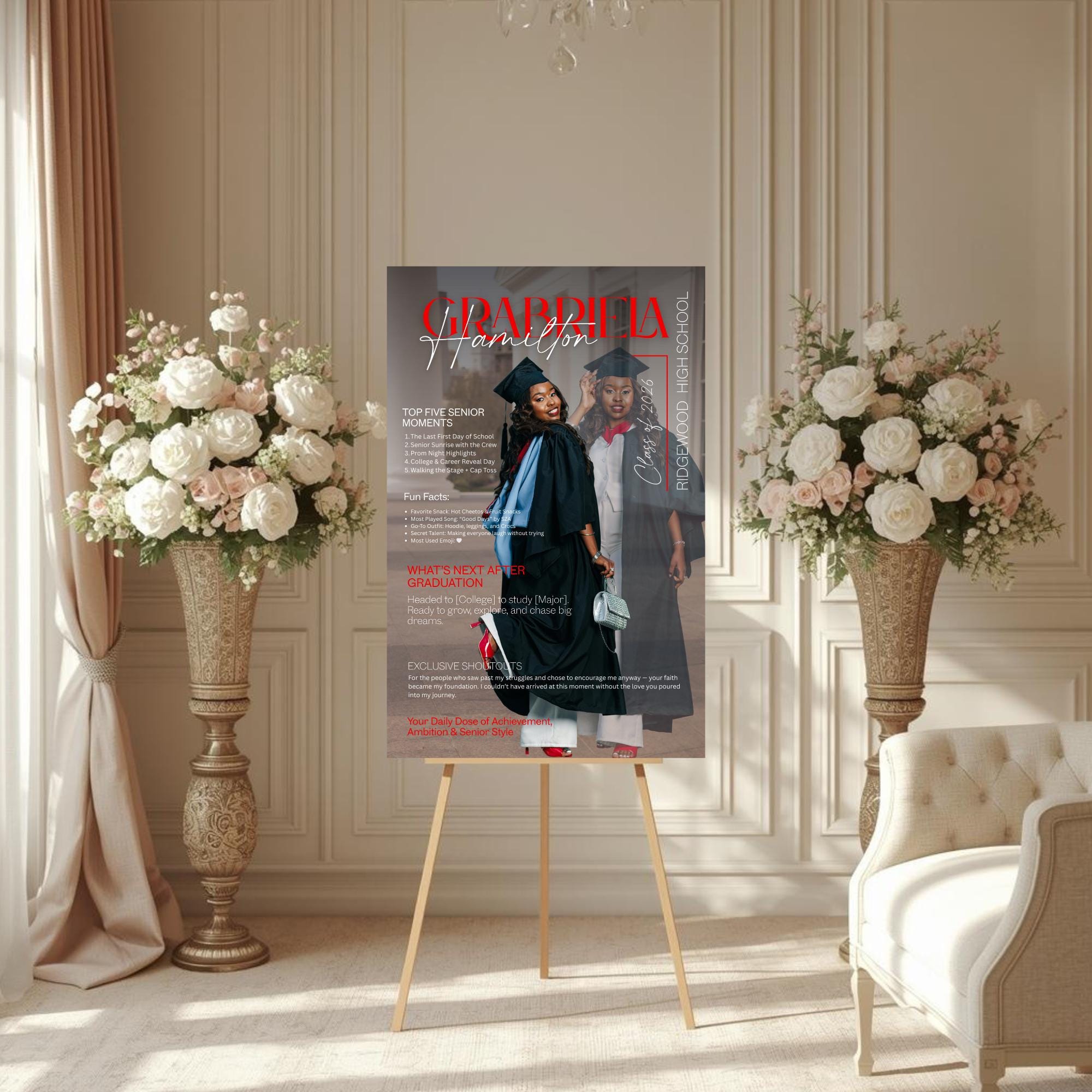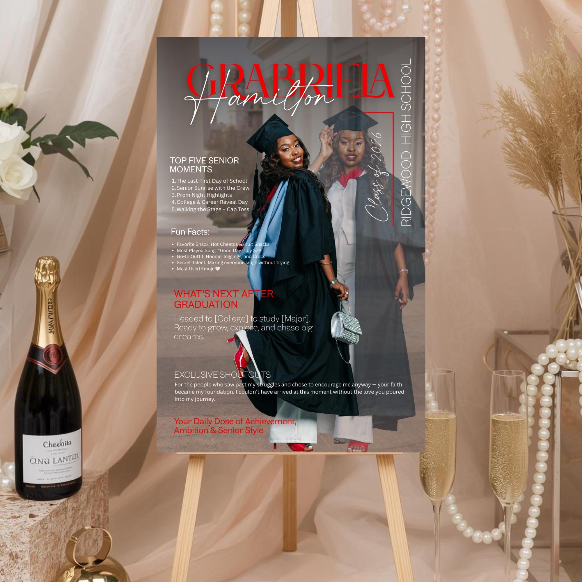 Celebrate your grad with a bold, modern Graduation Magazine Cover Welcome Sign, delivered as a digital file you can print anywhere! This custom-designed digital download includes the grad’s photo, fun facts, shoutout, highlights, and more — all styled in a trending magazine layout that looks stunning at graduation parties, memory tables, and photo setups.