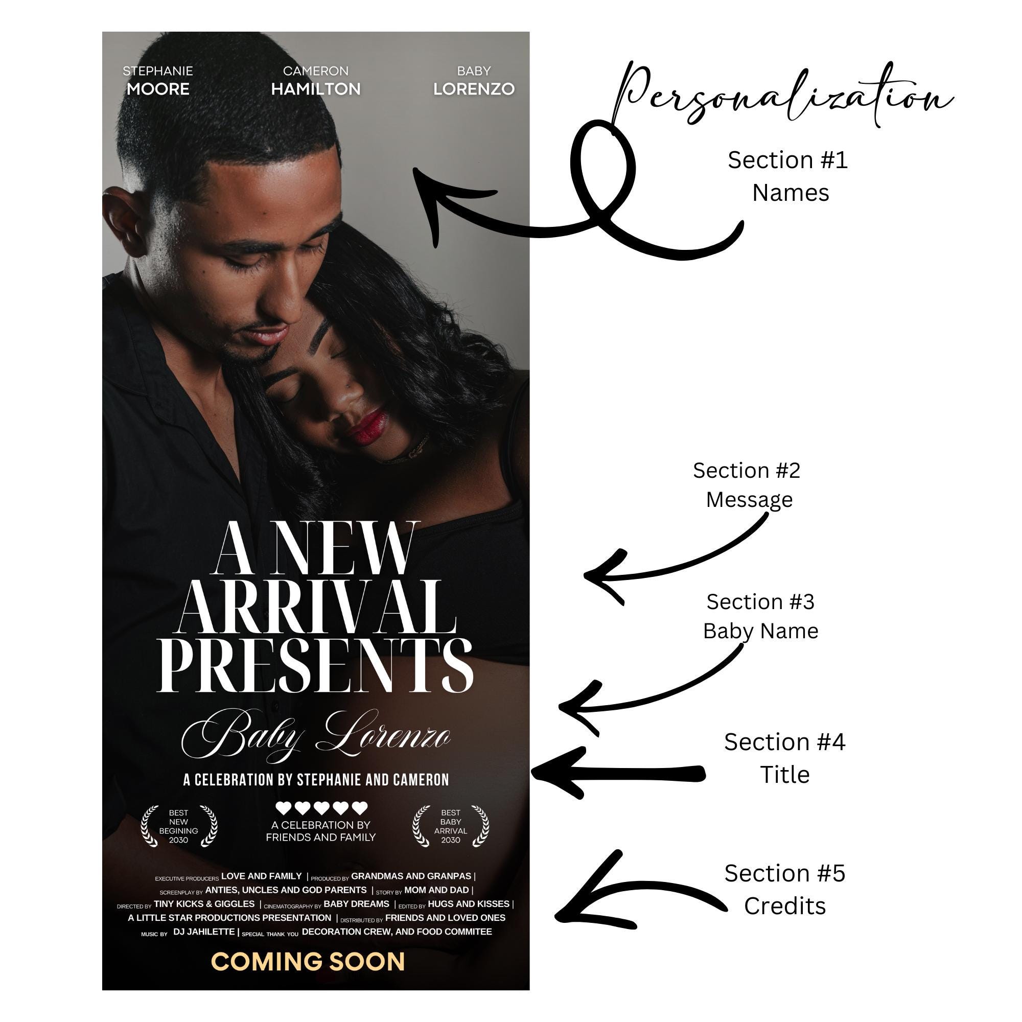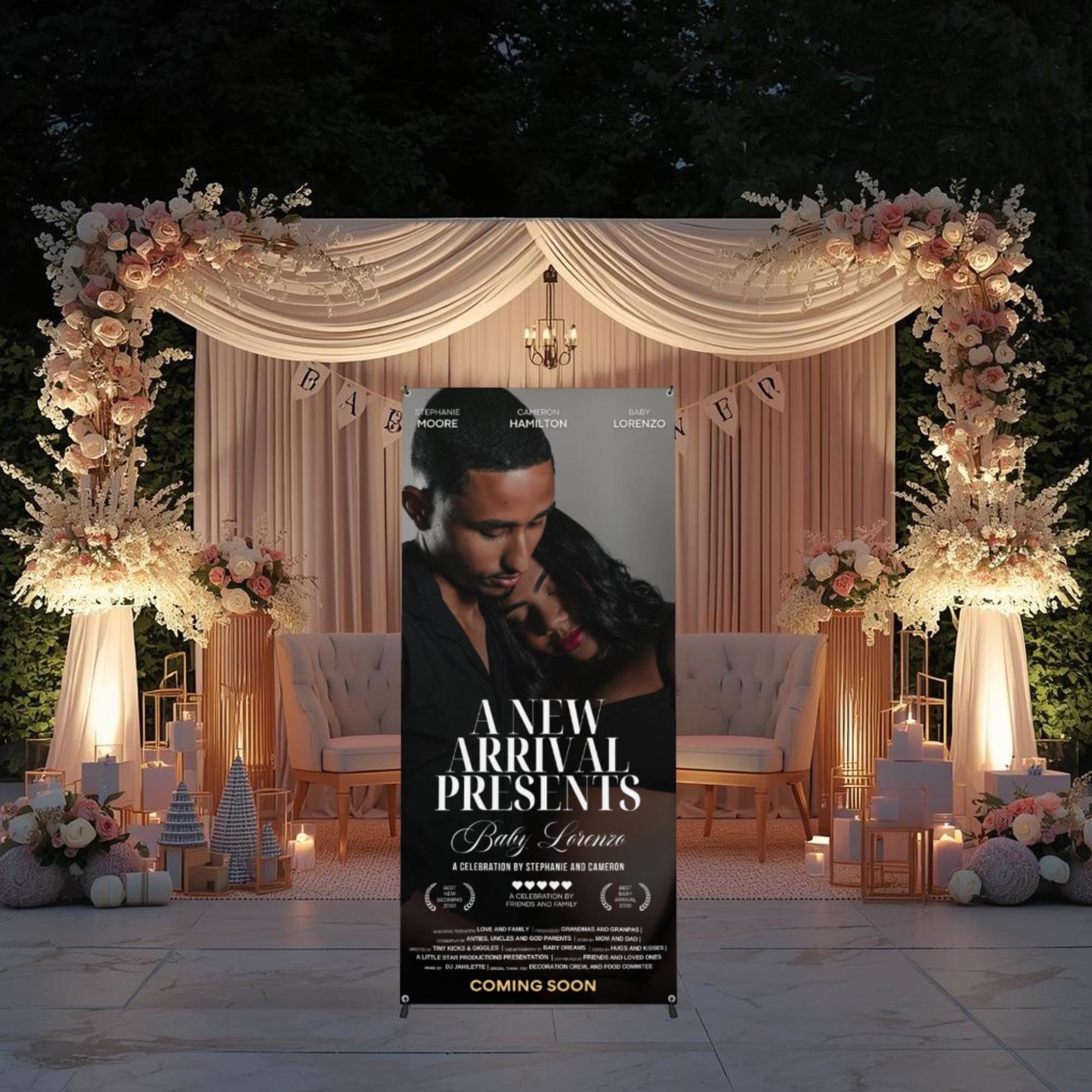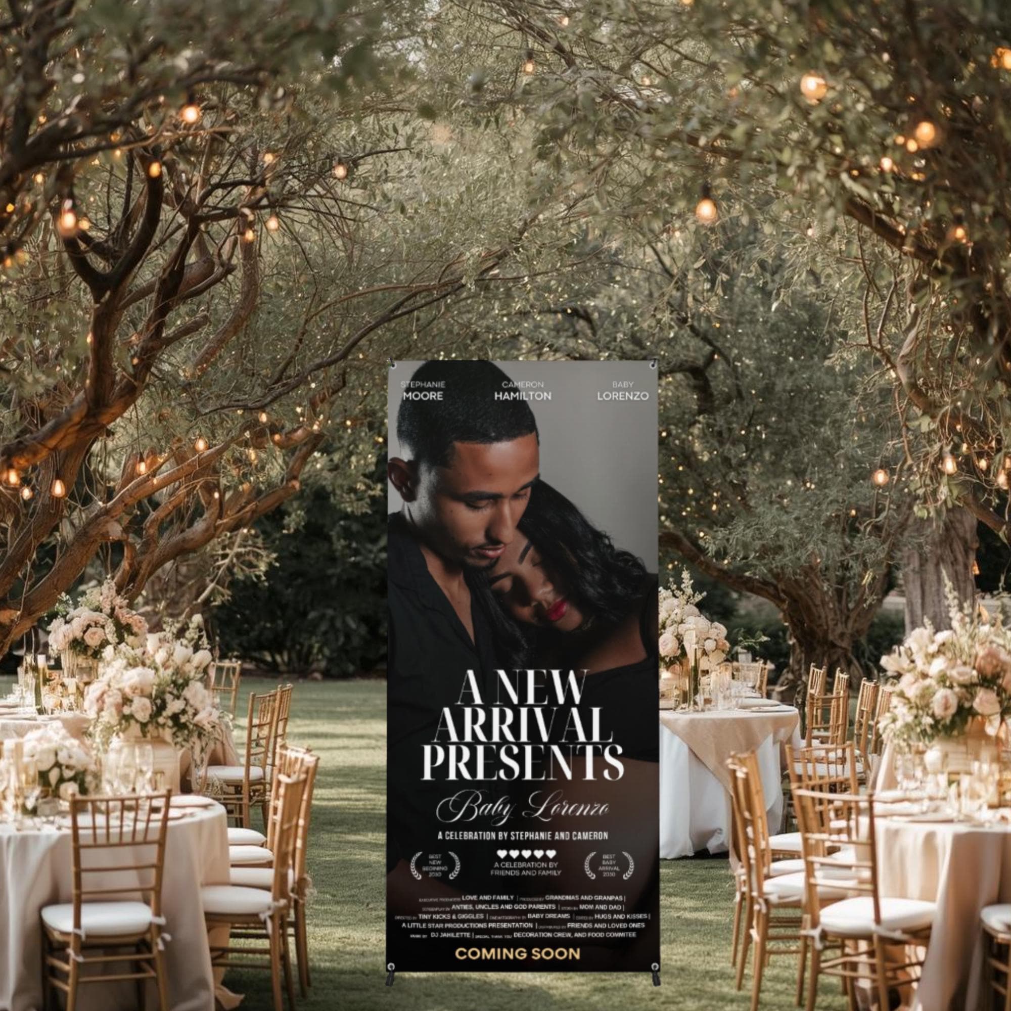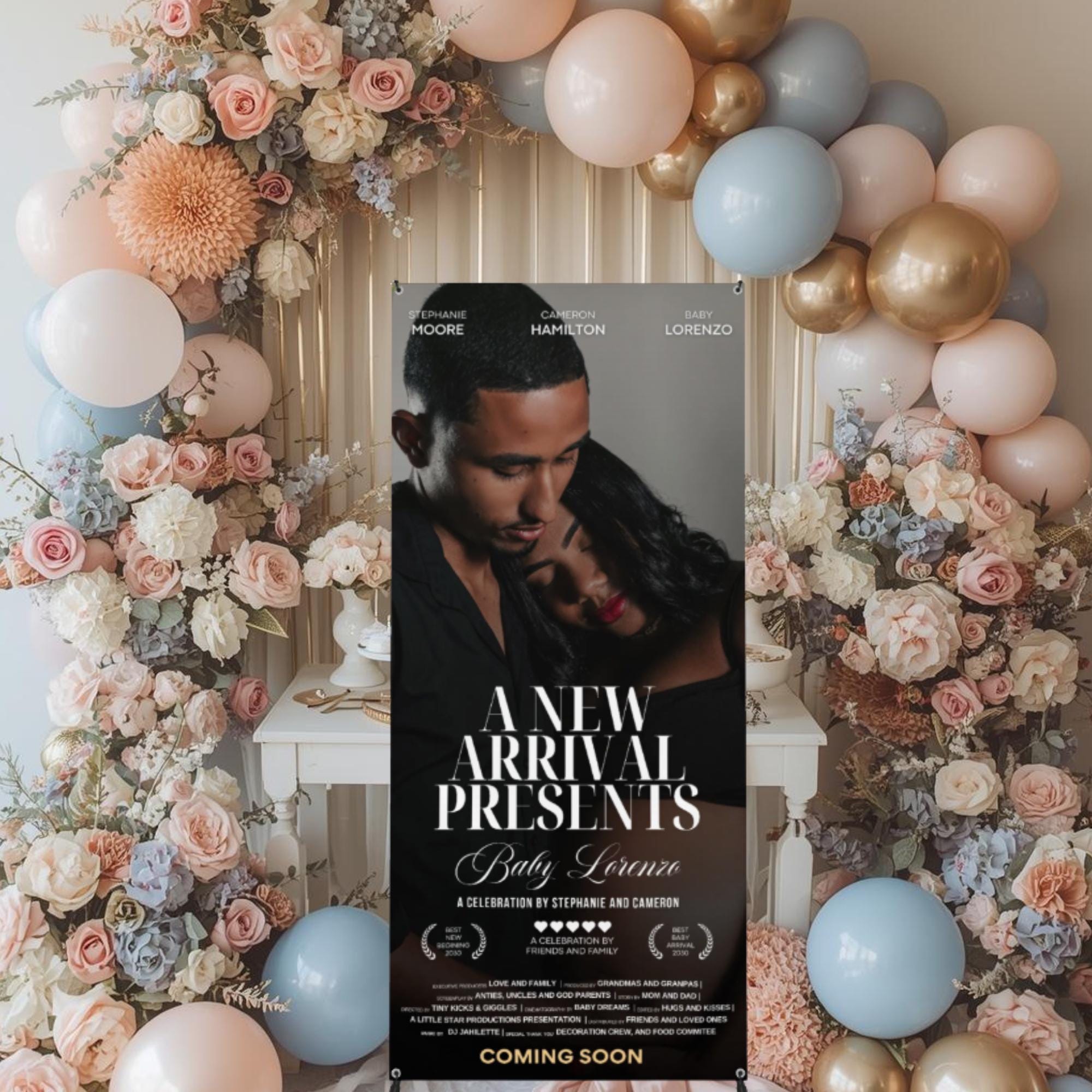 Make a bold statement at your celebration with this custom movie poster–style photo banner, designed to showcase your special moment in a cinematic, eye-catching way. Perfect for baby showers, birthdays, weddings, graduations, anniversaries, and any occasion, this personalized banner creates an unforgettable entrance and doubles as a keepsake after the event.