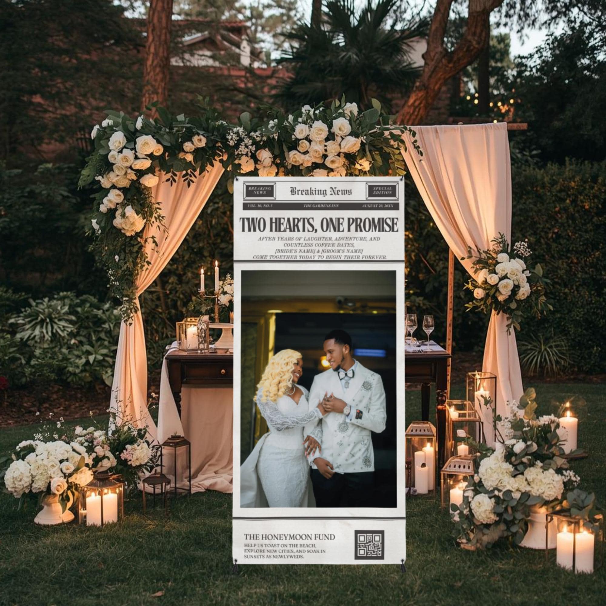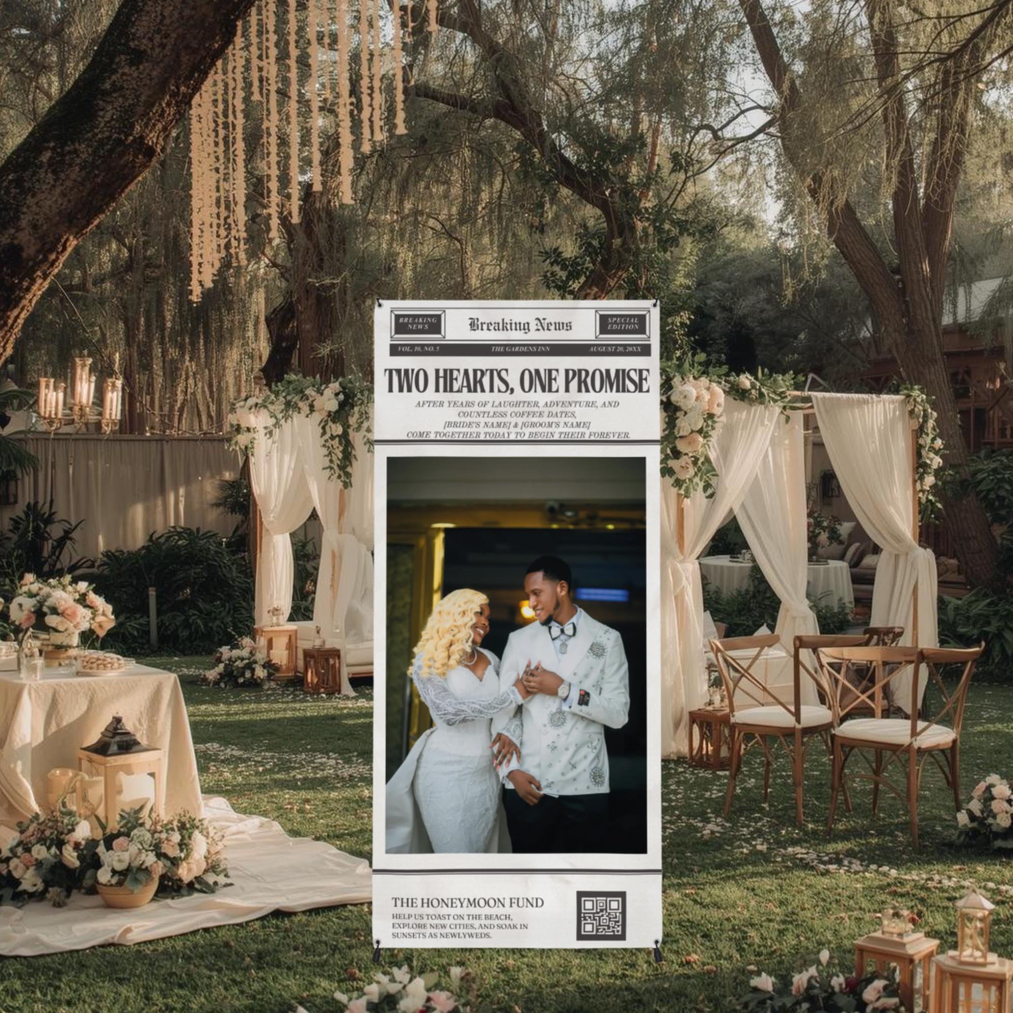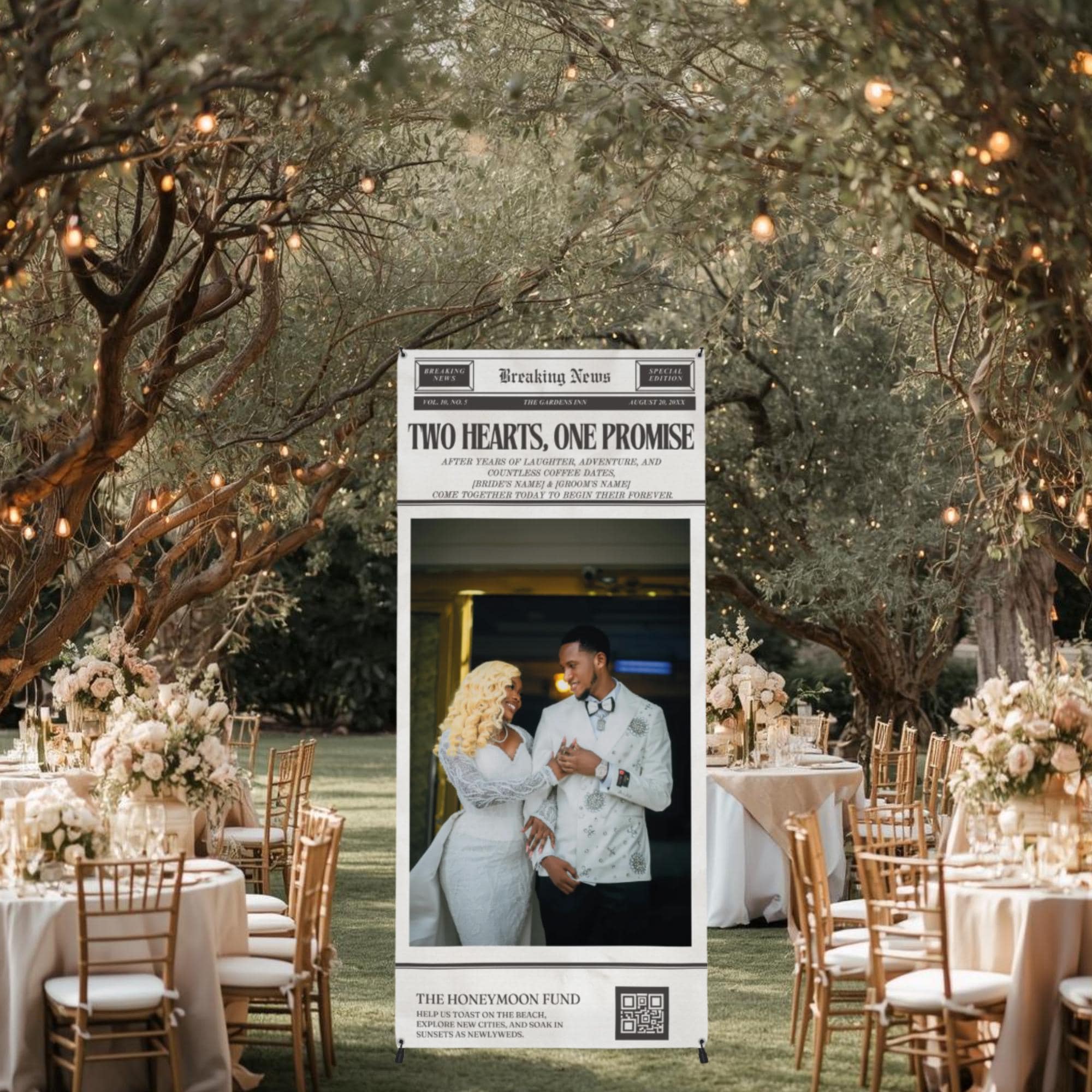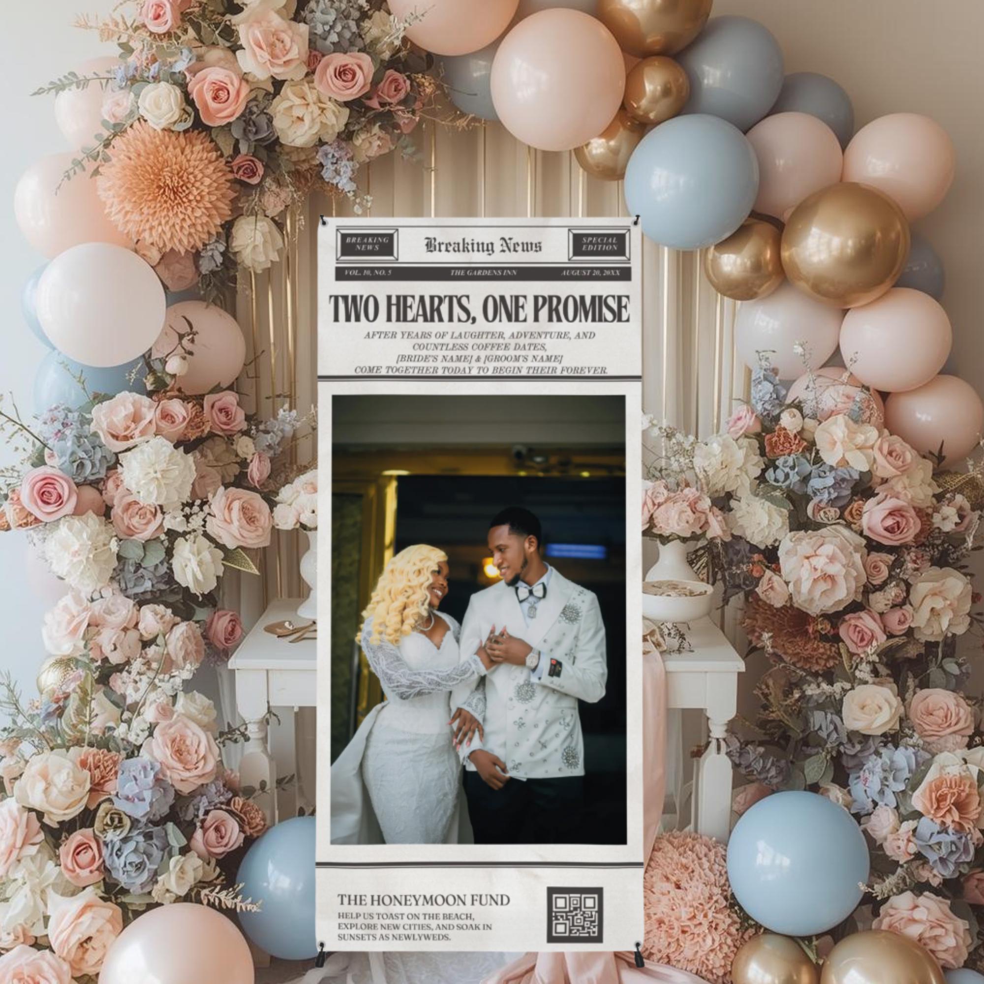 Make a stunning first impression on your wedding day with this custom newspaper-style wedding banner, featuring your love story in a timeless “Breaking News” layout. Designed to highlight your names, wedding date, venue, and a special message like “Two Hearts, One Promise,” this elegant sign is perfect for wedding entrances, receptions, cocktail hours, and photo backdrops.