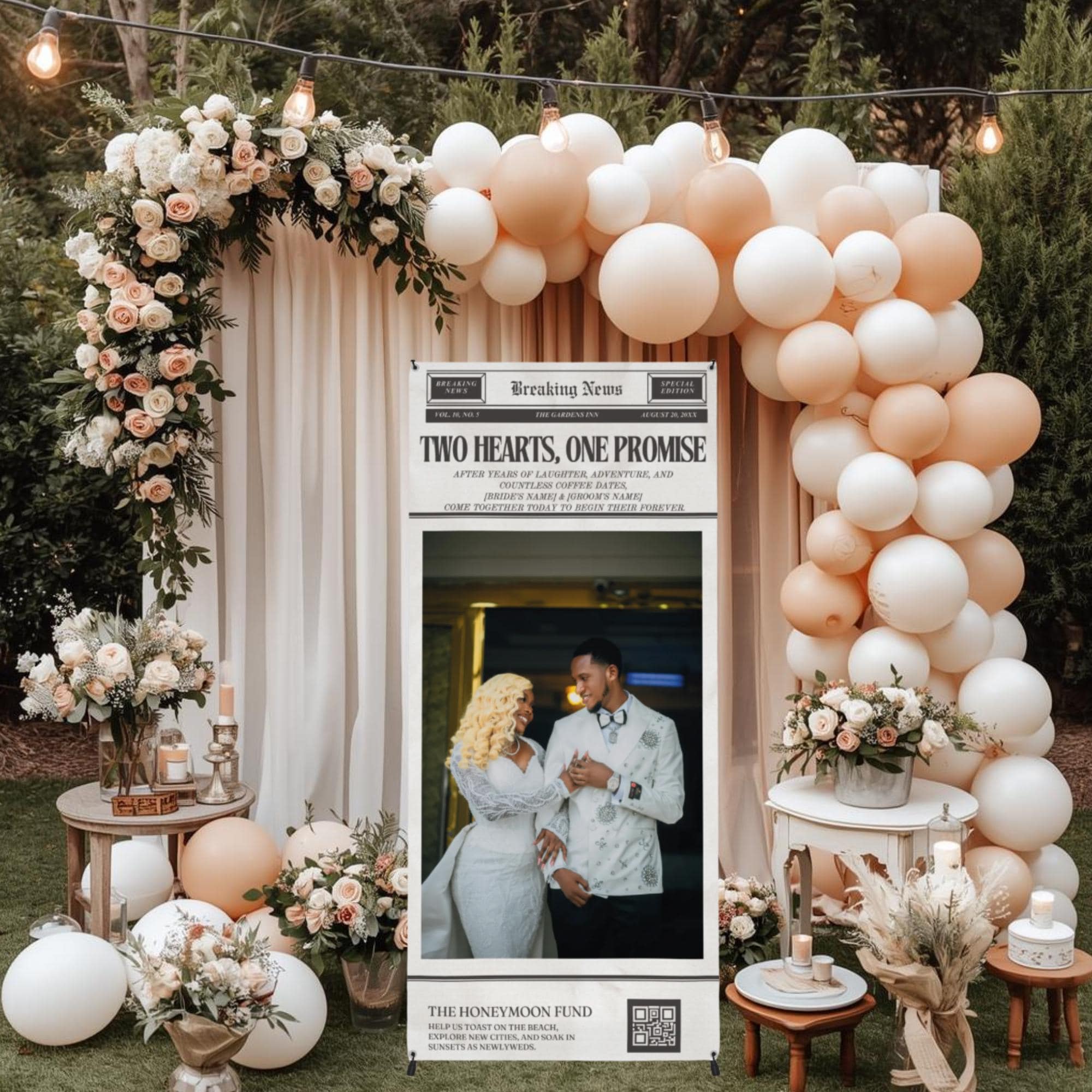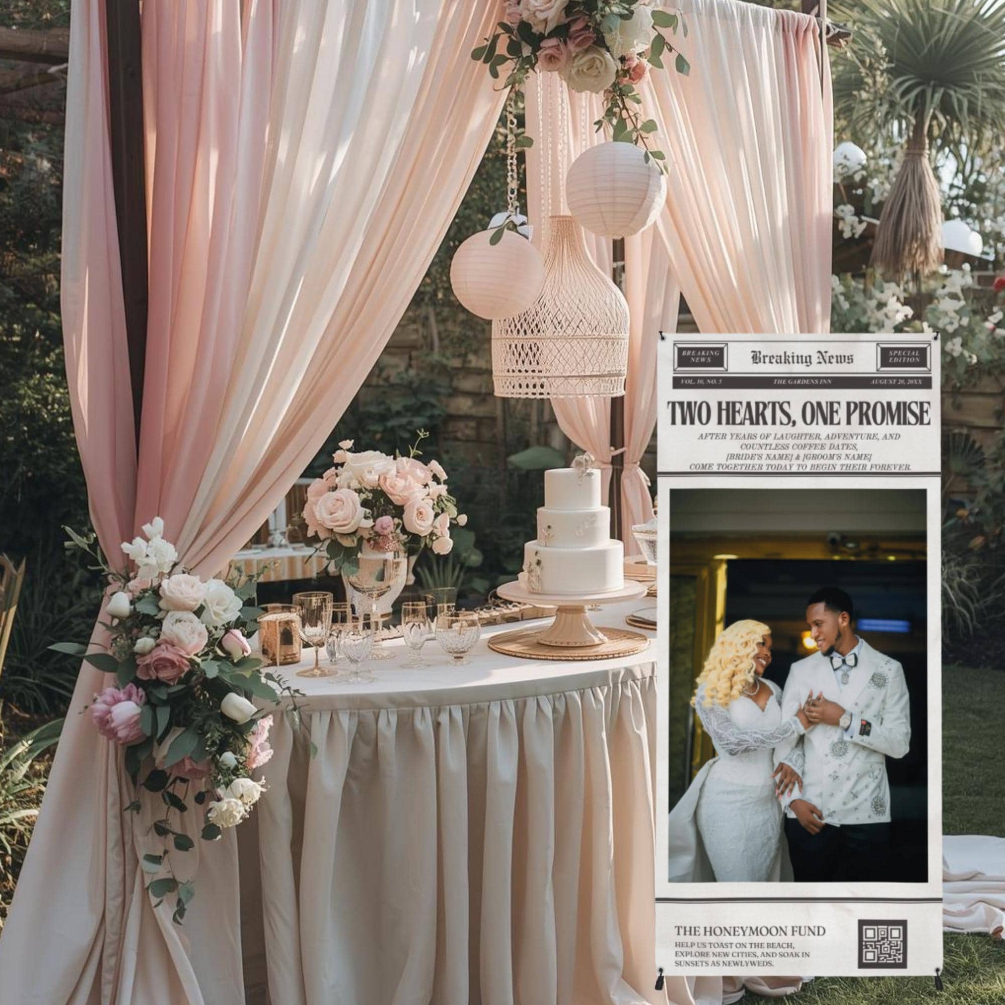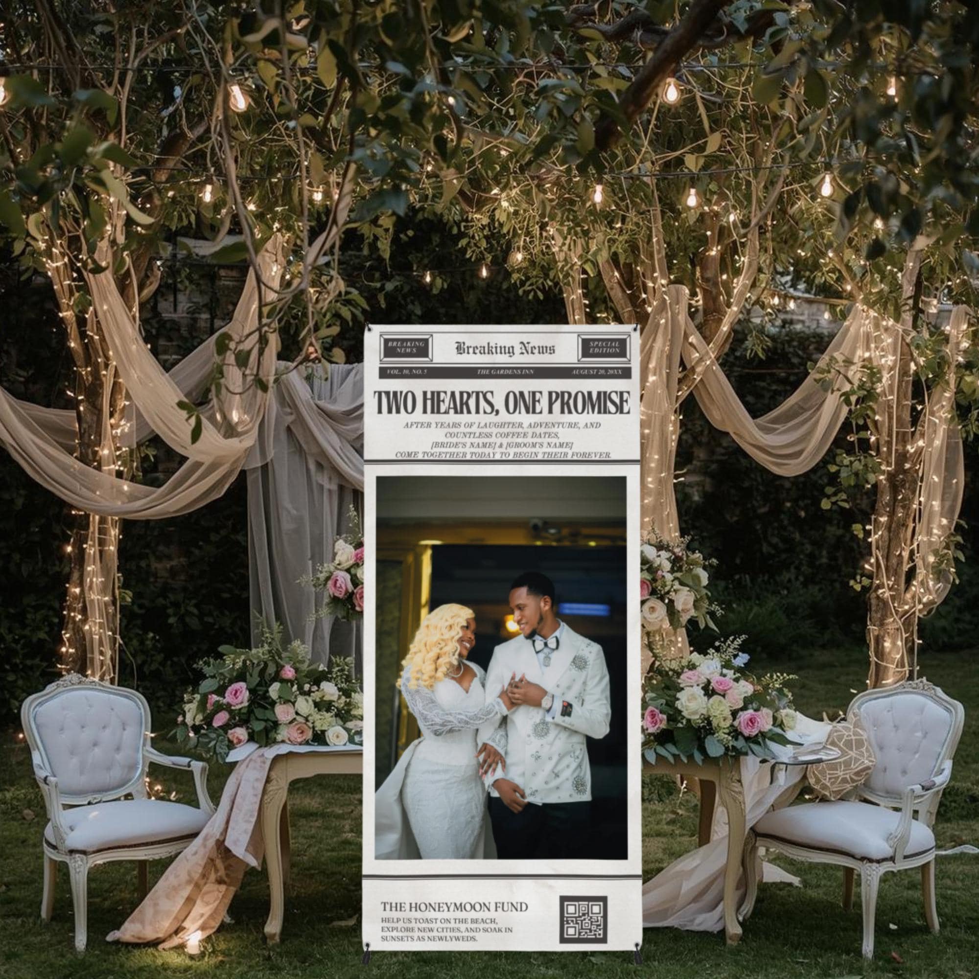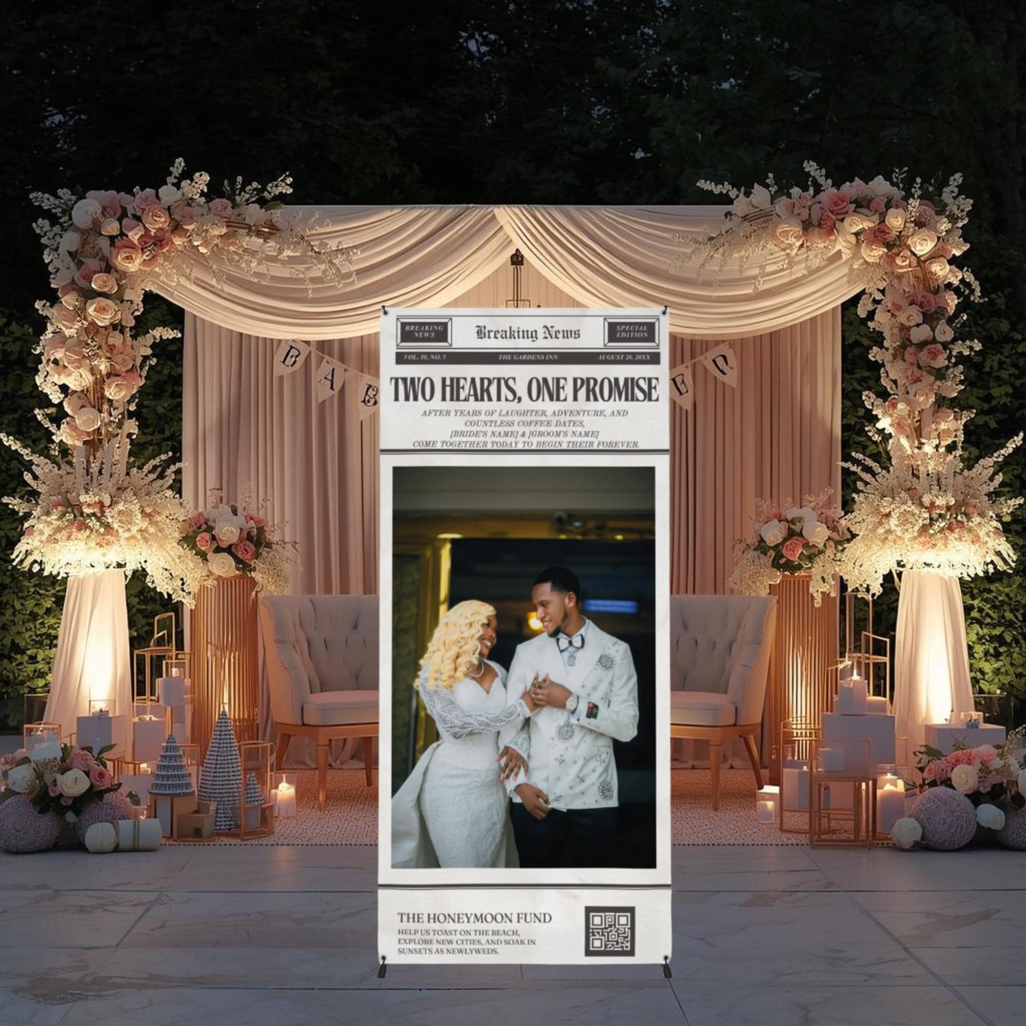 Make a stunning first impression on your wedding day with this custom newspaper-style wedding banner, featuring your love story in a timeless “Breaking News” layout. Designed to highlight your names, wedding date, venue, and a special message like “Two Hearts, One Promise,” this elegant sign is perfect for wedding entrances, receptions, cocktail hours, and photo backdrops.