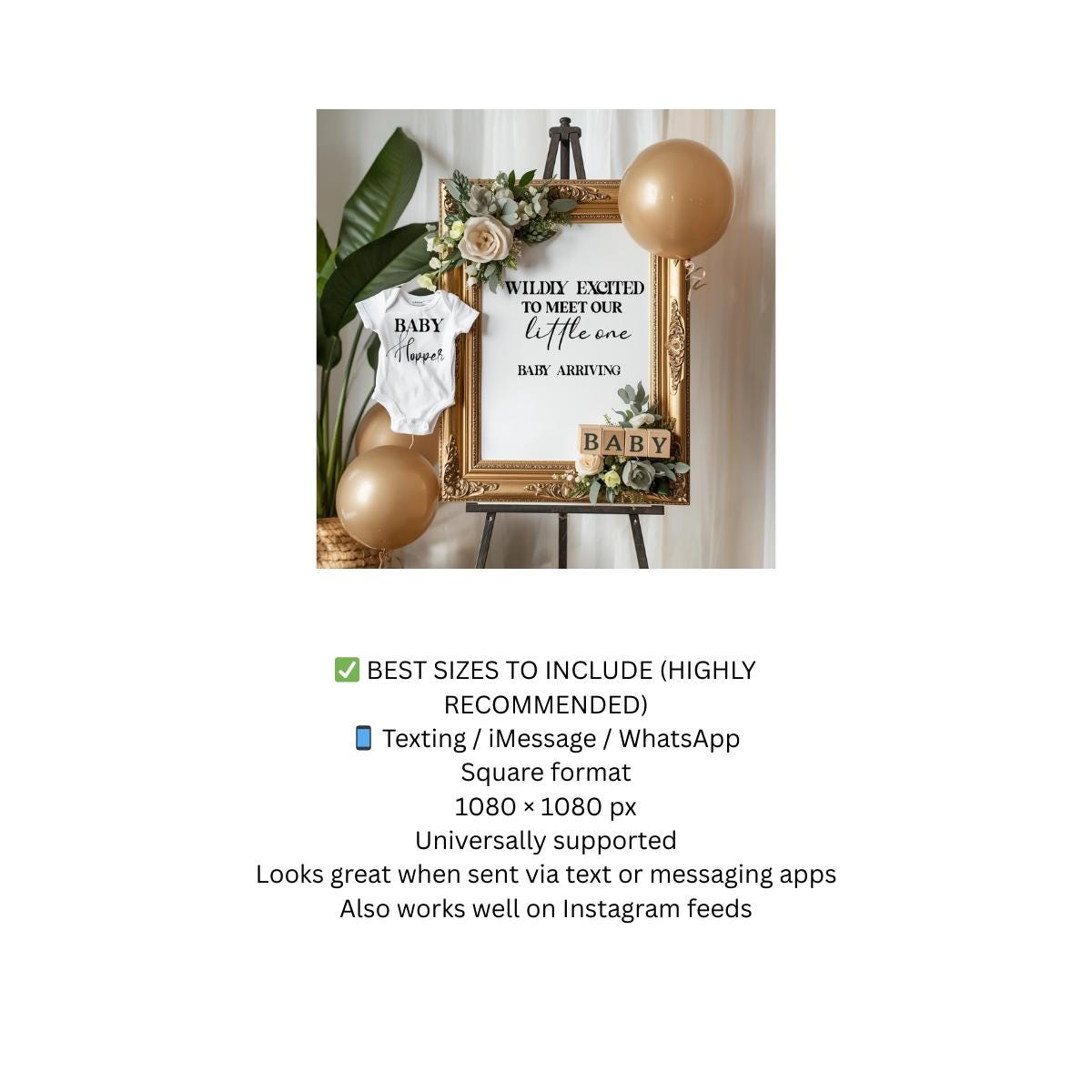 Share your exciting news in the most charming way with this Safari Jungle–themed pregnancy announcement, designed especially for social media sharing. Featuring an elegant ornate frame with a blank photo space, festive balloons, a baby onesie, and classic wooden “BABY” blocks surrounded by soft floral accents, this design is perfect for modern parents who love a neutral, whimsical safari aesthetic.