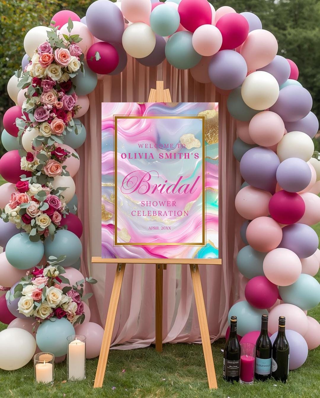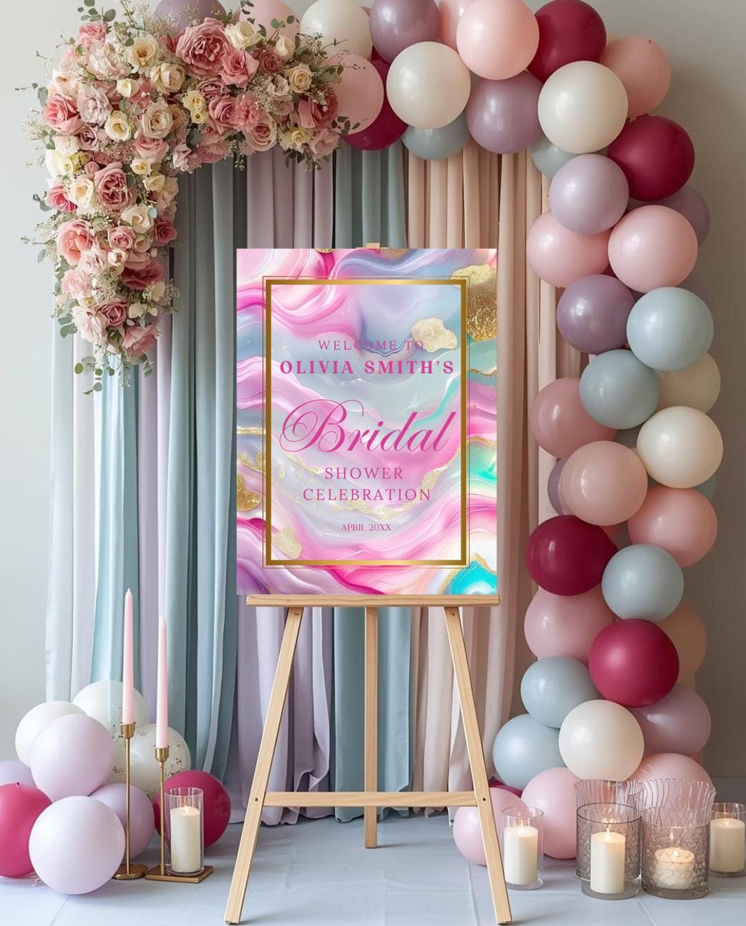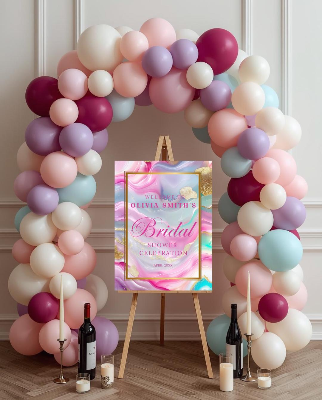 Create a stunning first impression with this elegant pastel agate bridal shower welcome sign, designed to elevate your celebration with soft flowing color, delicate gold accents, and a luxurious modern aesthetic. Perfect for bridal showers, brunch celebrations, champagne showers, and upscale events, this sign serves as a beautiful focal point at your entrance or gift table.