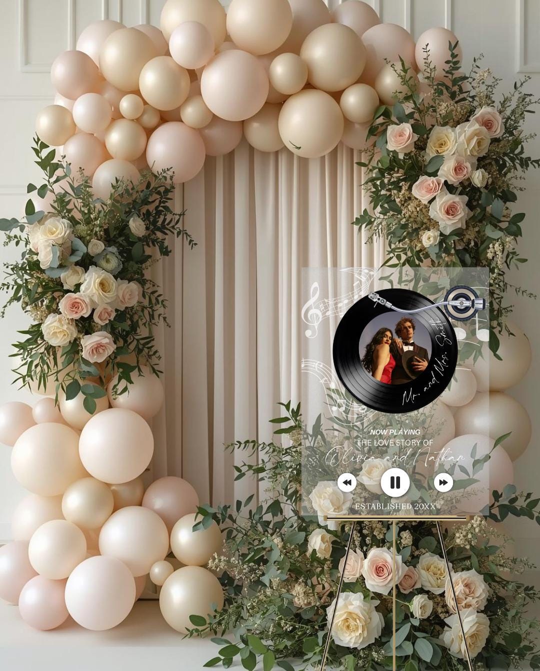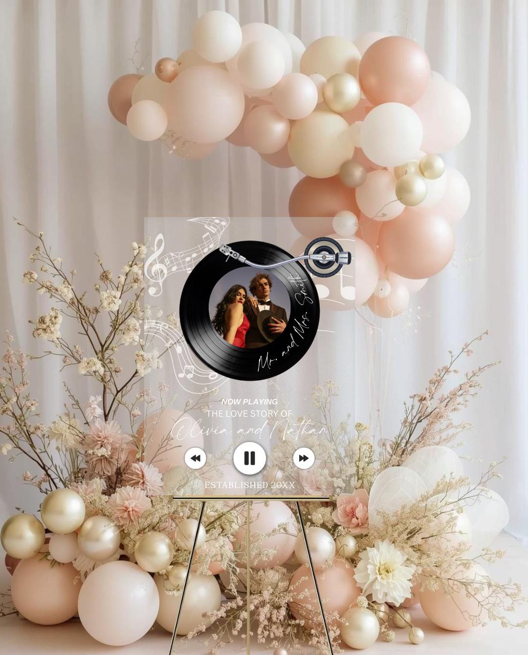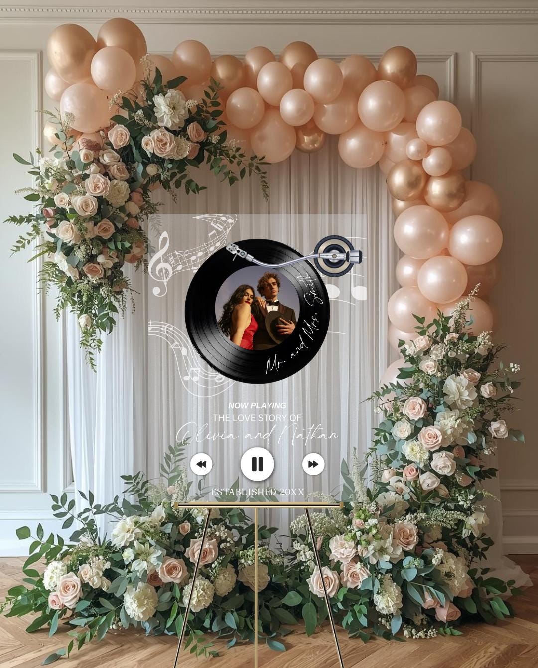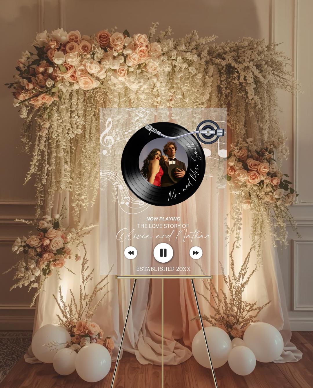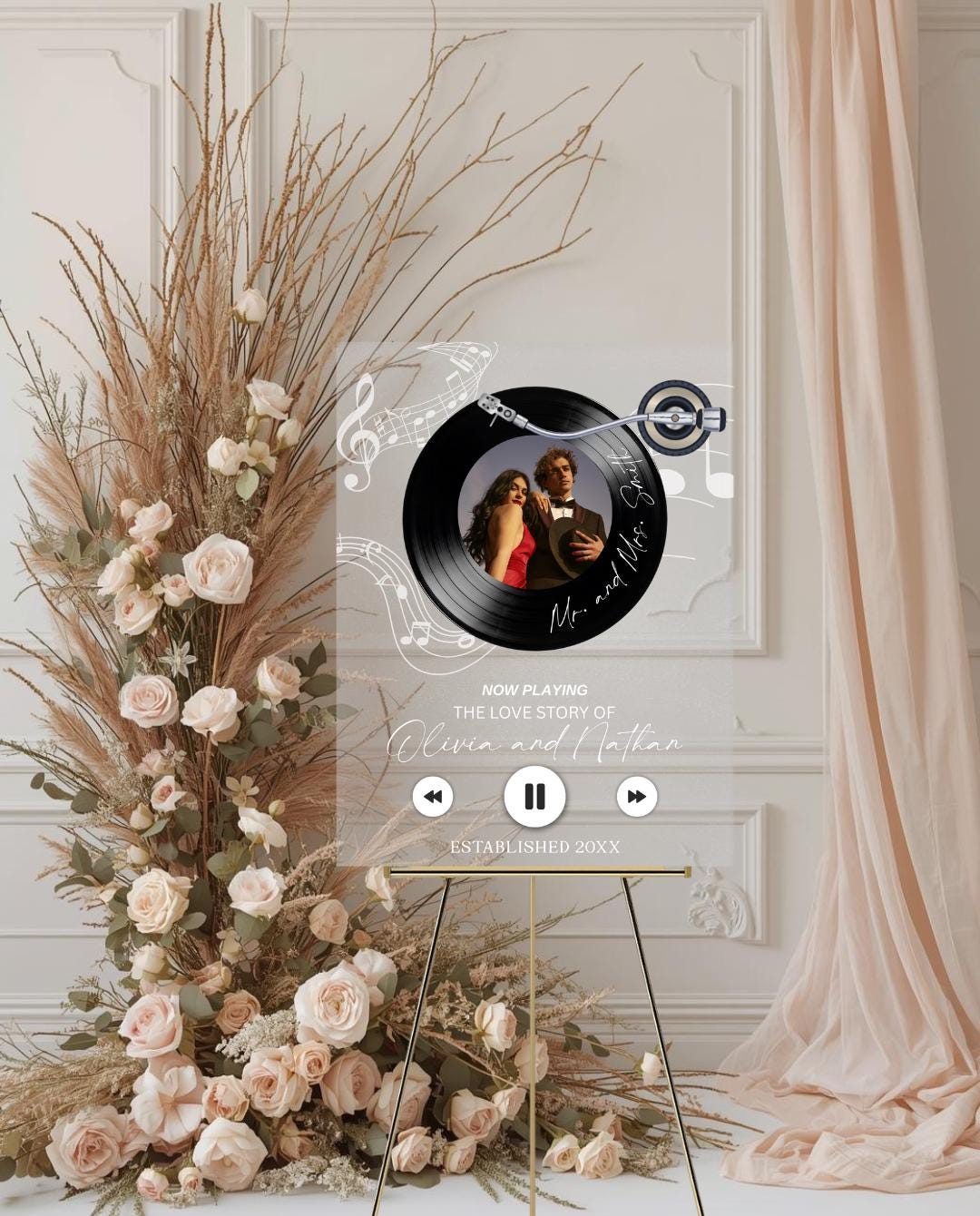 Create a statement-making entrance with this modern, music-inspired acrylic welcome sign designed to look like a vinyl record playing on a record player. Perfect for weddings, anniversaries, birthdays, and music-themed celebrations.
