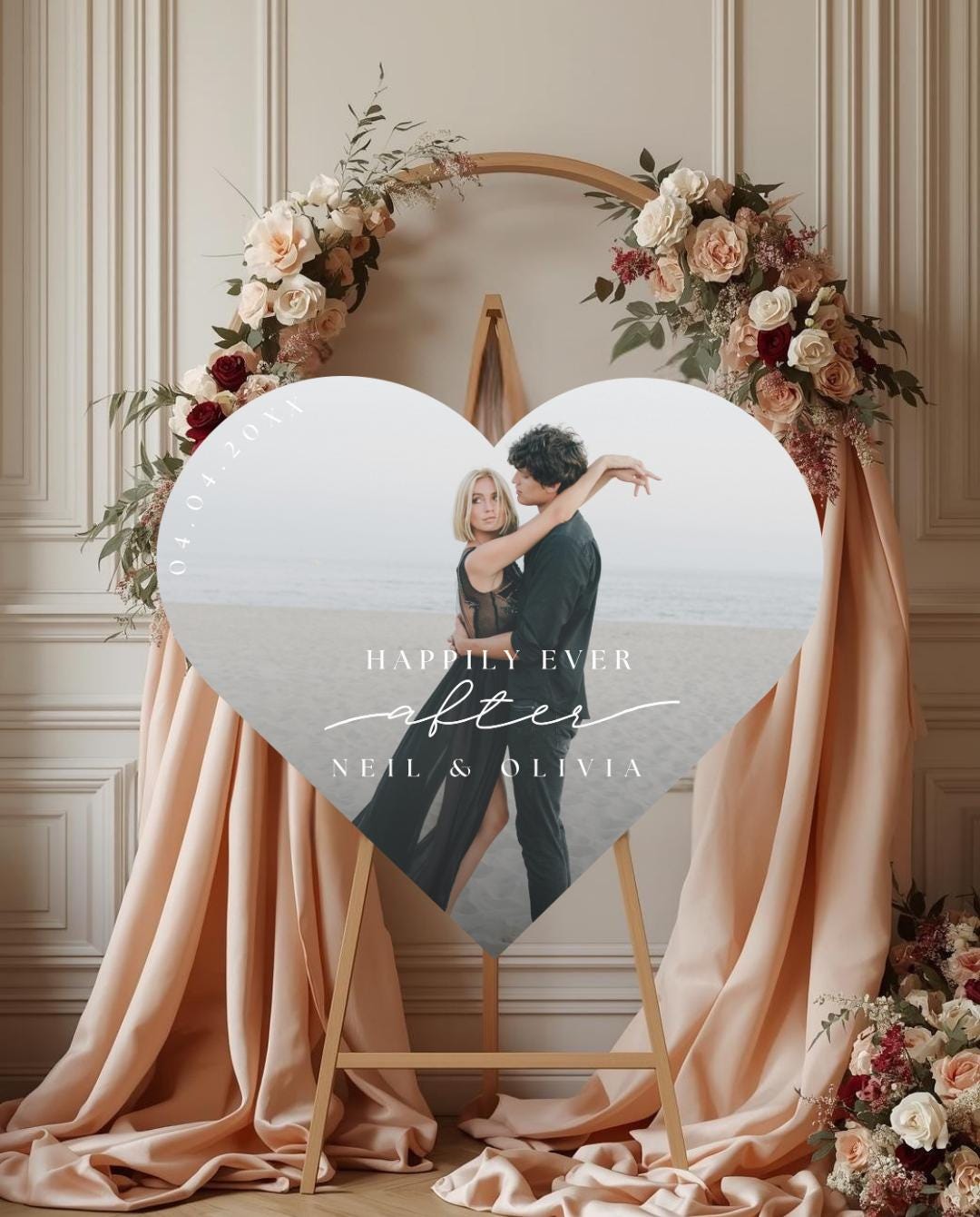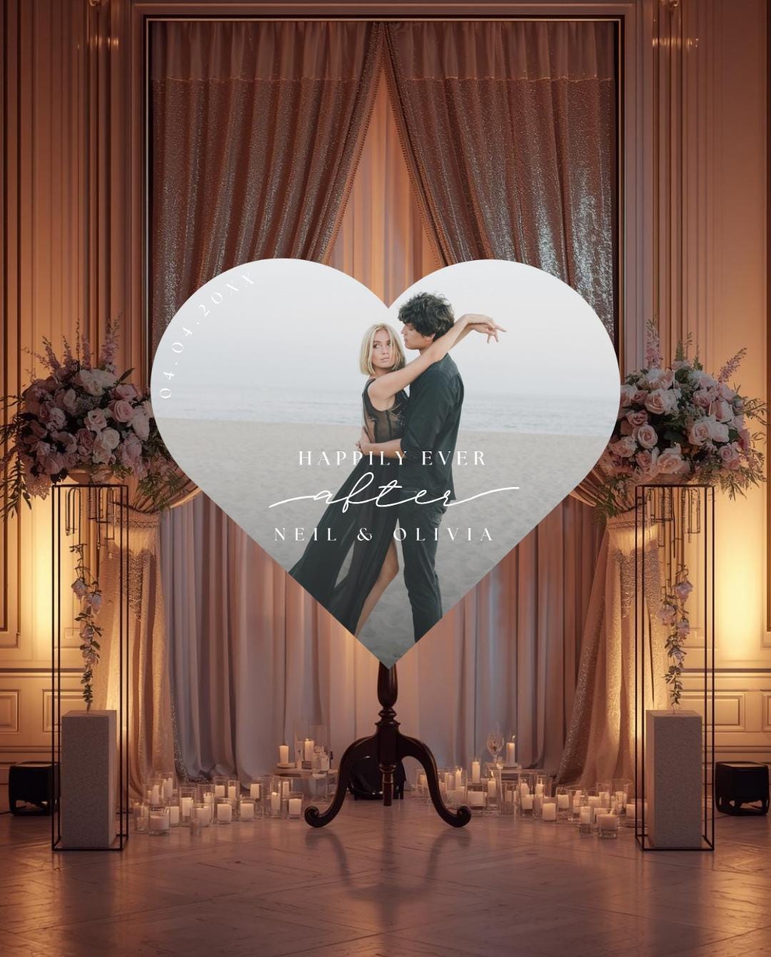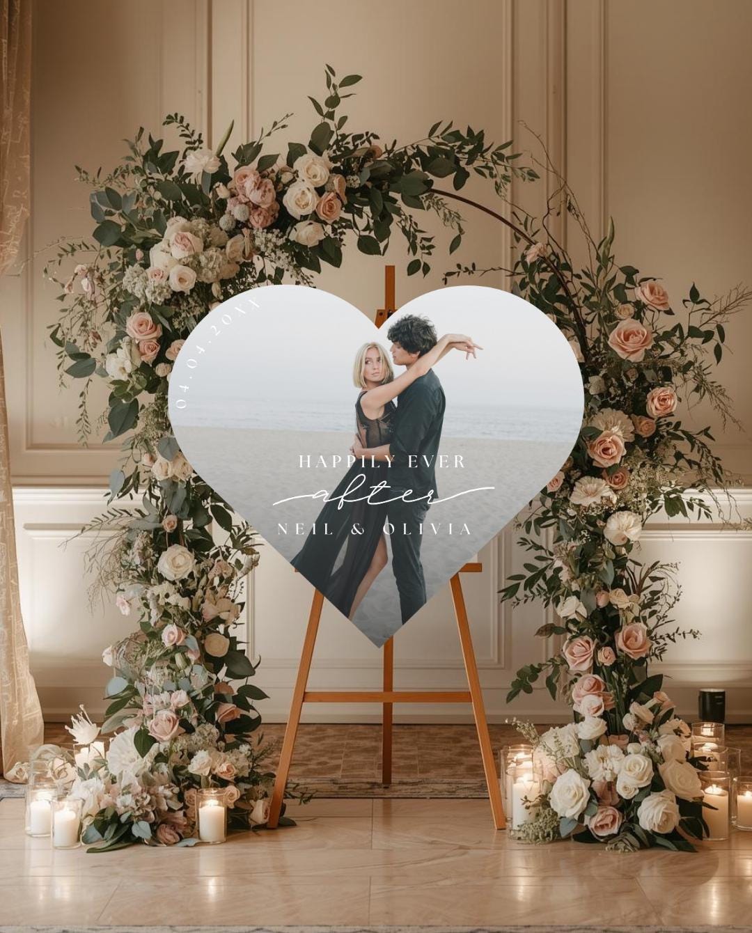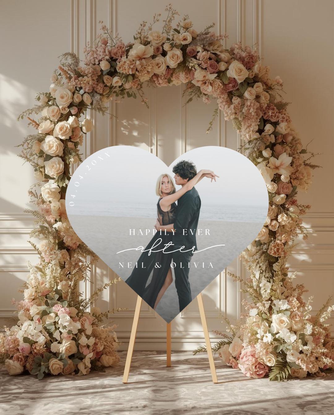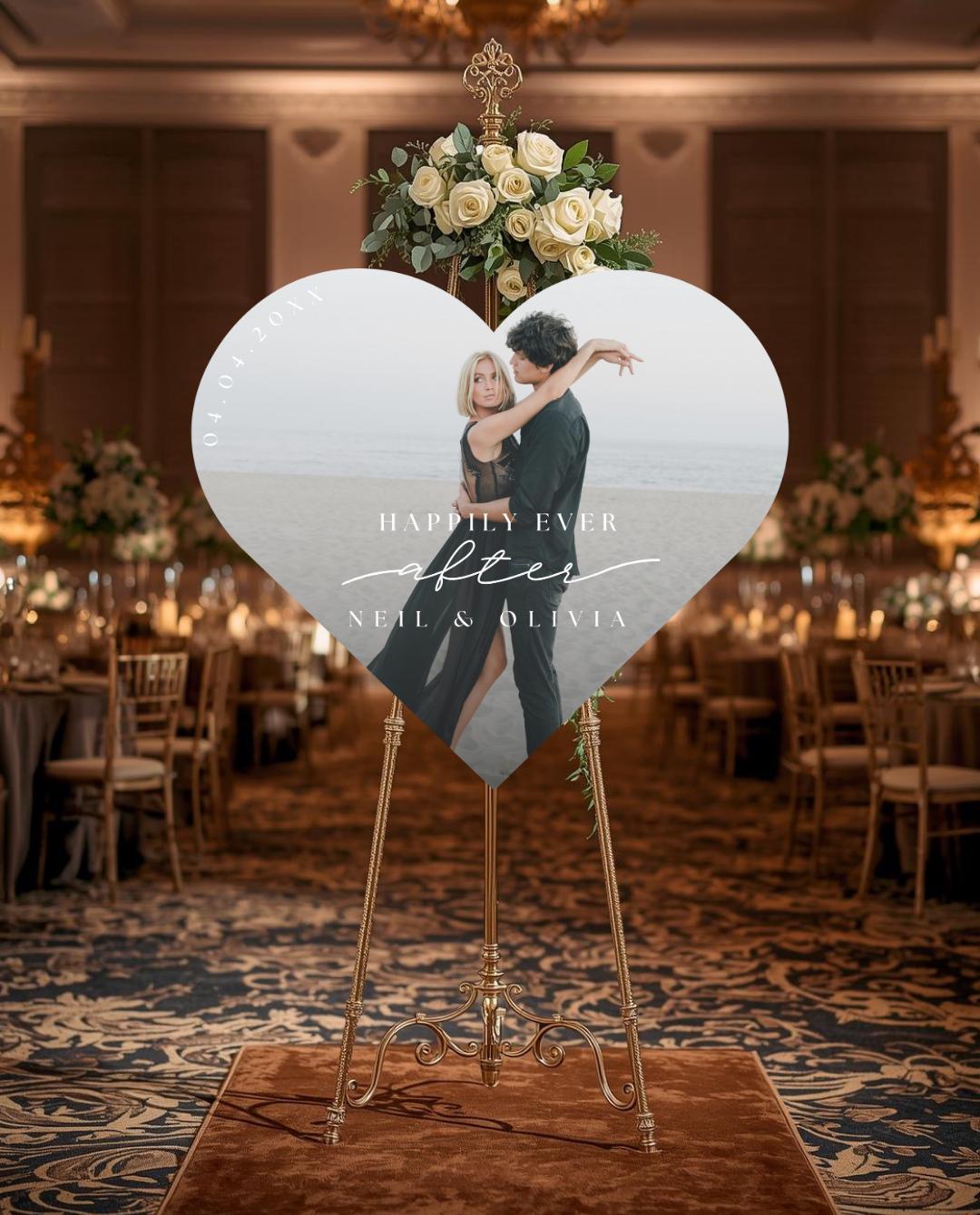 A personalized heart photo sign adds a warm, elegant touch to your entrance and becomes a cherished memory piece you can display in your home after the celebration.