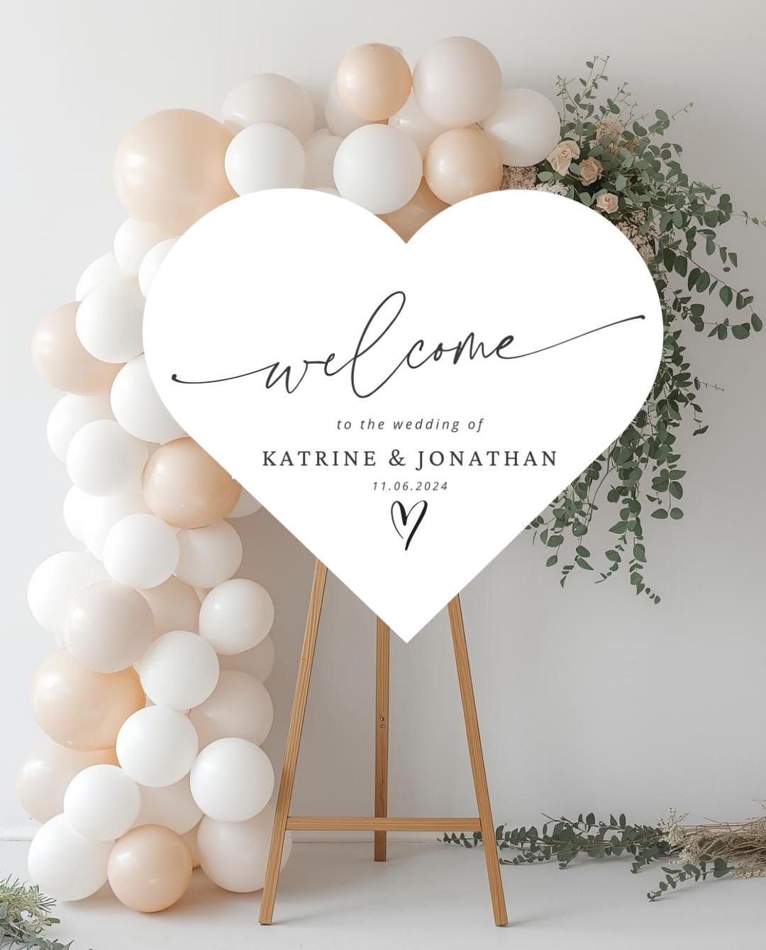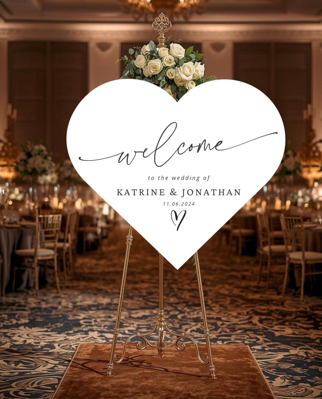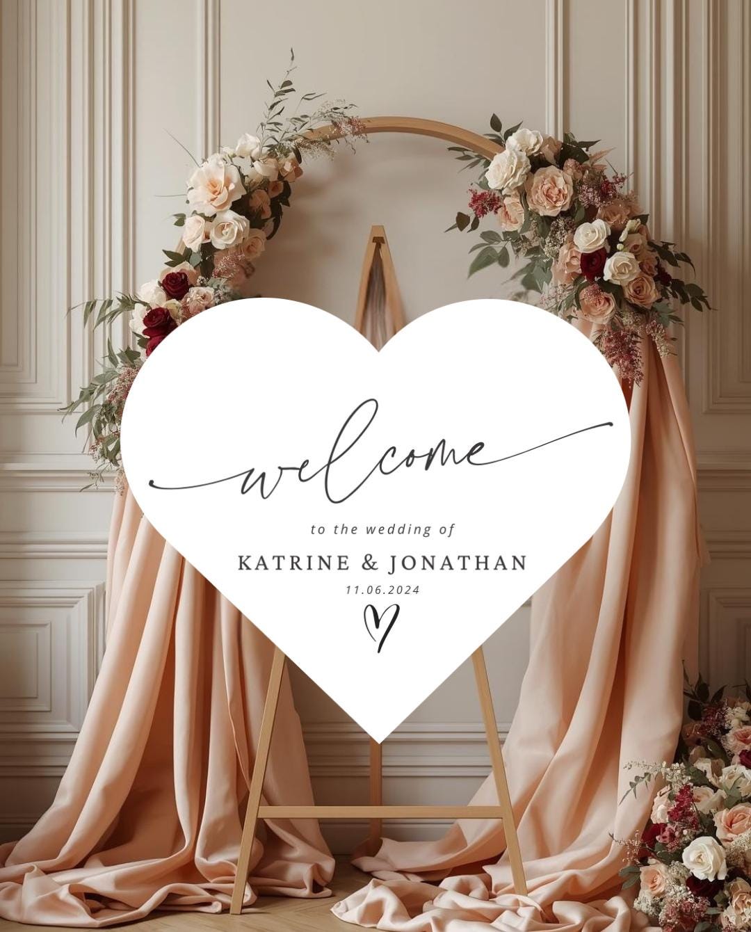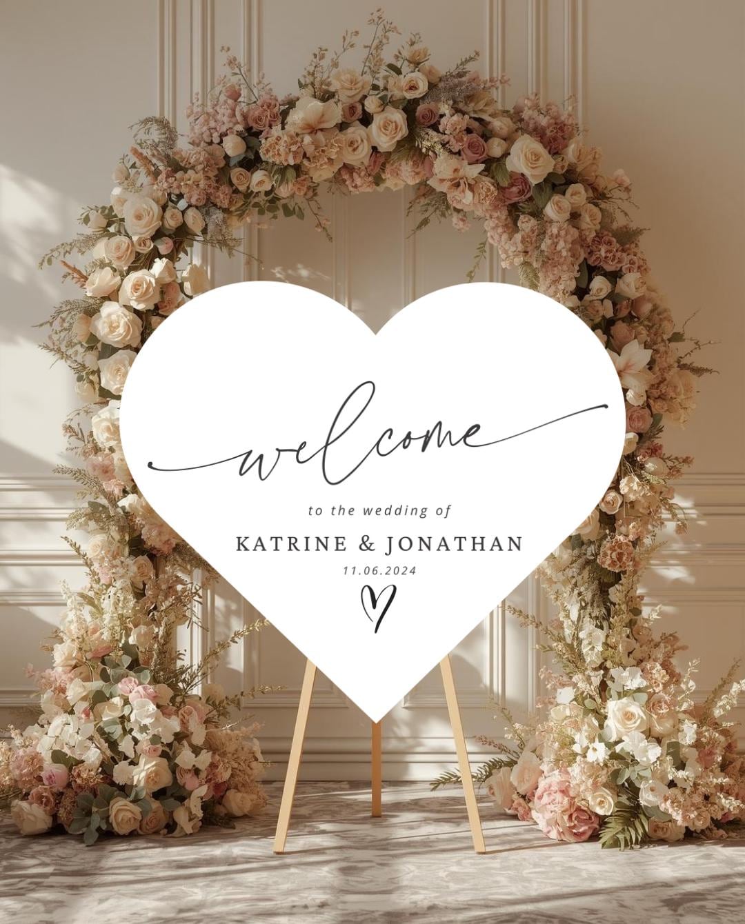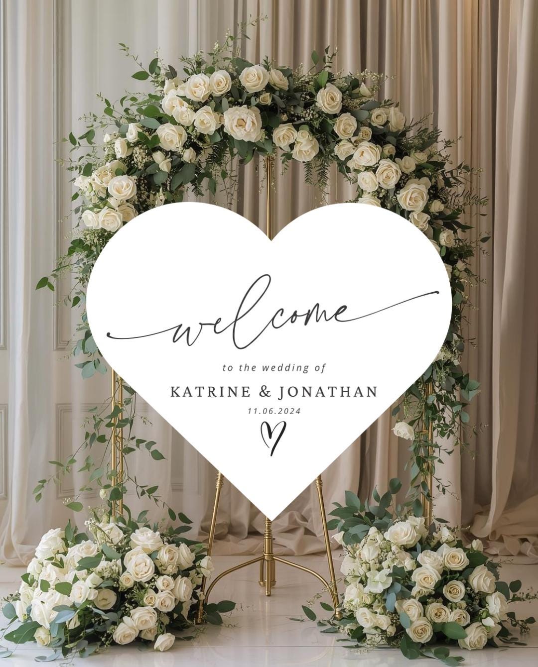 Create a beautiful first impression with a custom heart-shaped welcome sign designed to add elegance and warmth to your special day. This black and white minimalist aesthetic blends perfectly with modern, classic, or romantic themes while becoming a cherished keepsake long after the celebration.