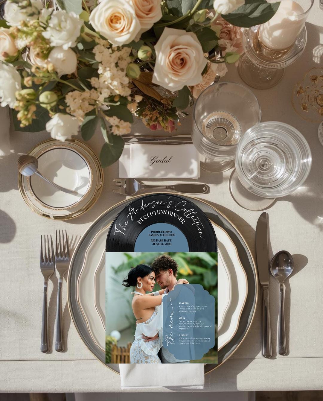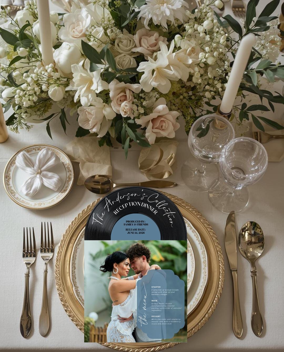 Each record jacket can feature a different photo, or you can choose album covers that represent your journey together. Every menu comes fully mounted and assembled, giving your guests a keepsake they’ll remember long after the last song plays.