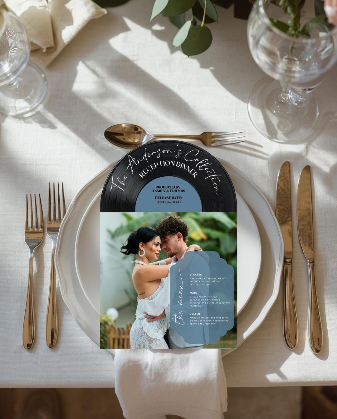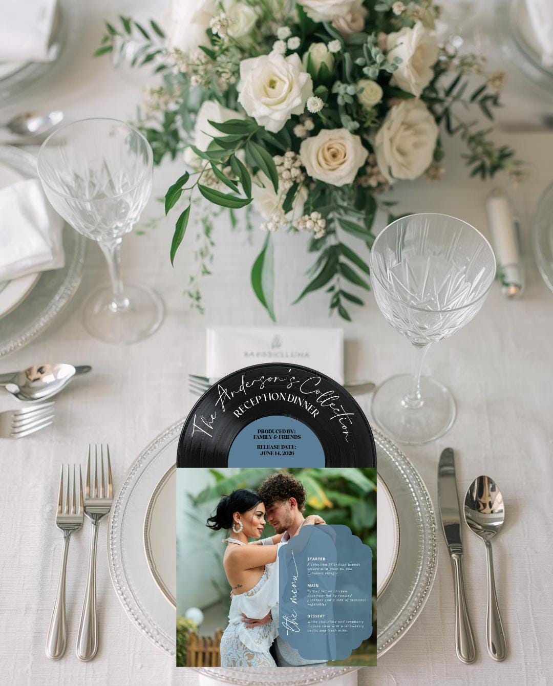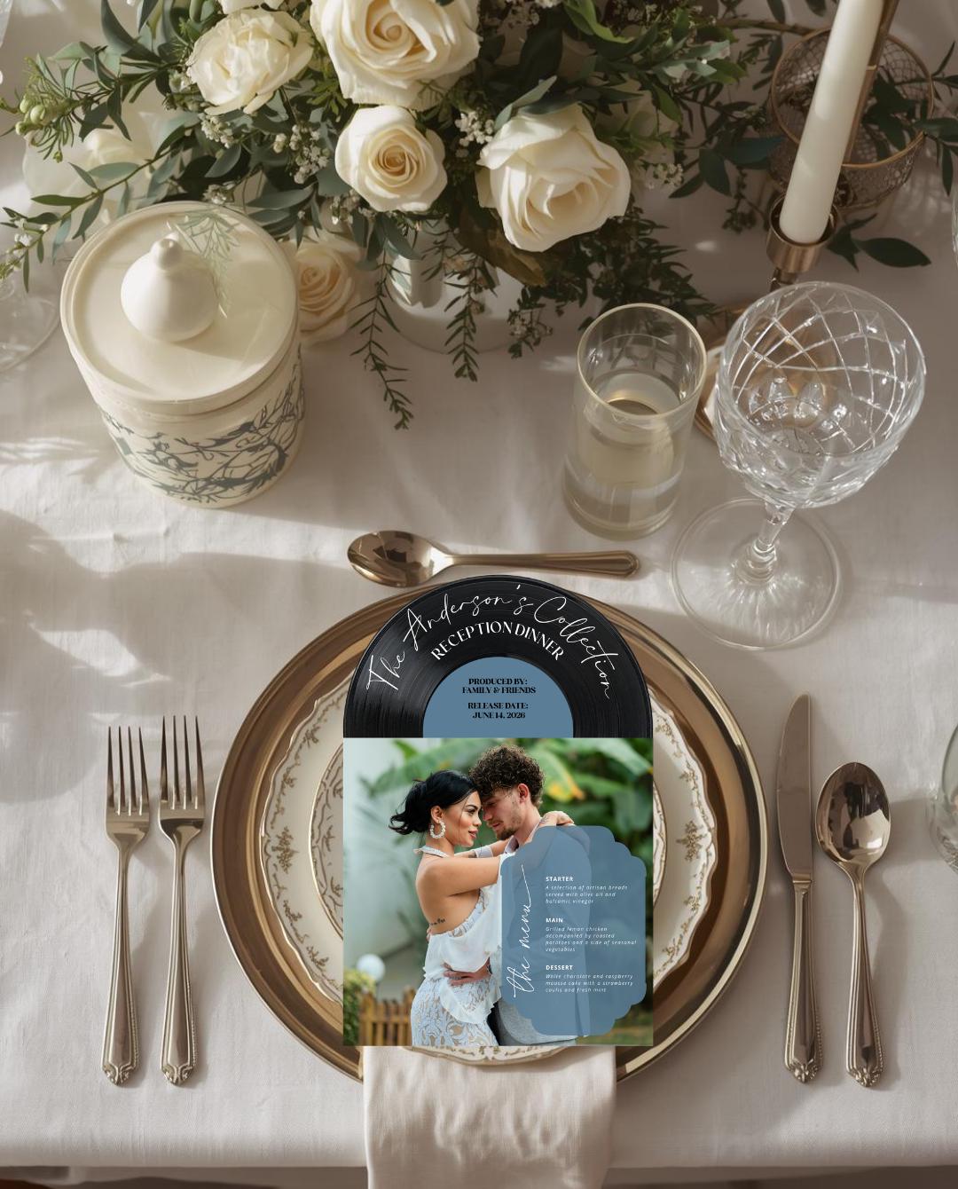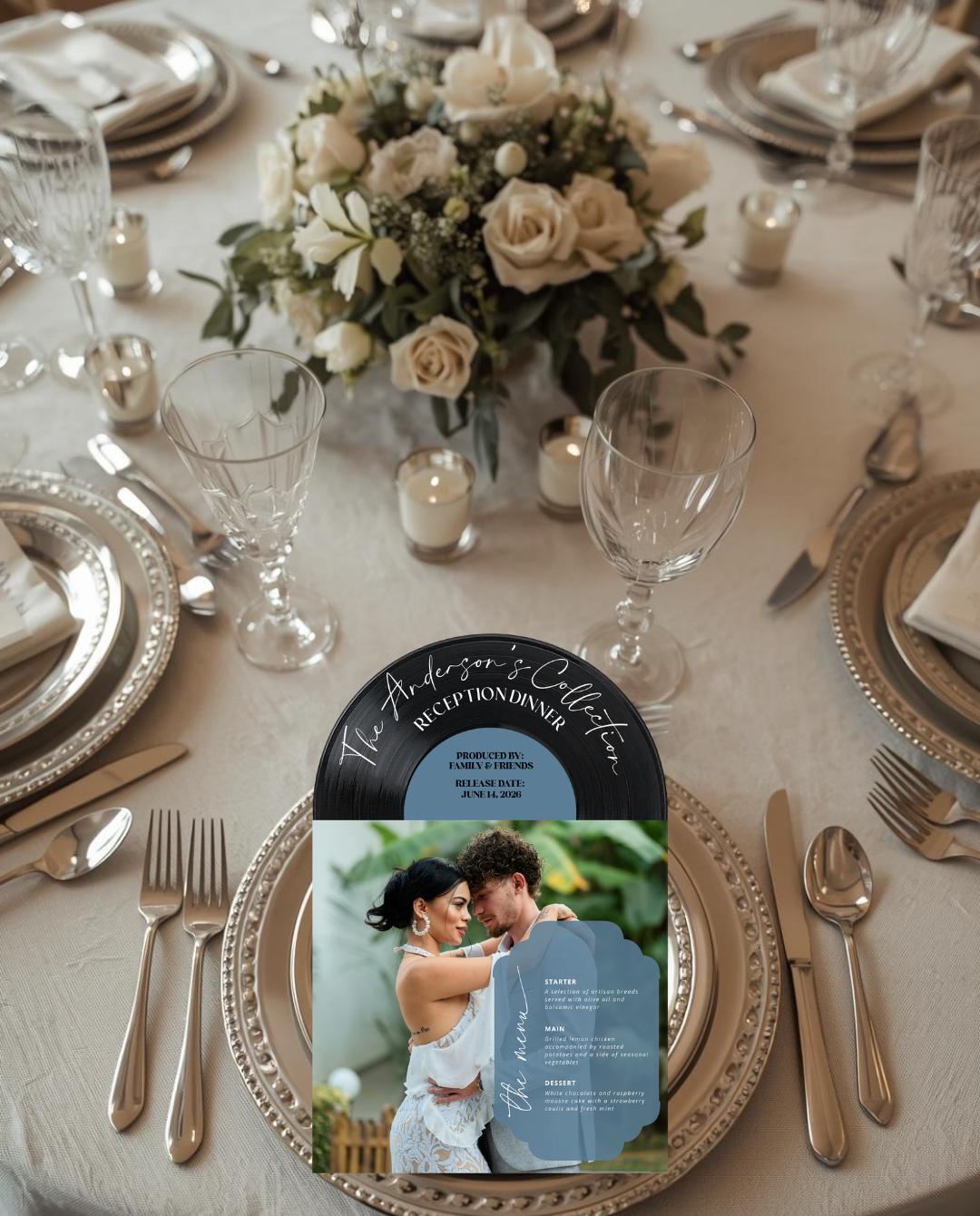 Bring your love story to the table with this 3D Vinyl Record Menu, beautifully designed to look like a classic record jacket and vinyl insert. This unique menu is printed on high-quality cardstock and layered for a 3D effect, making it a standout centerpiece for weddings, rehearsal dinners, anniversaries, or music-themed celebrations.