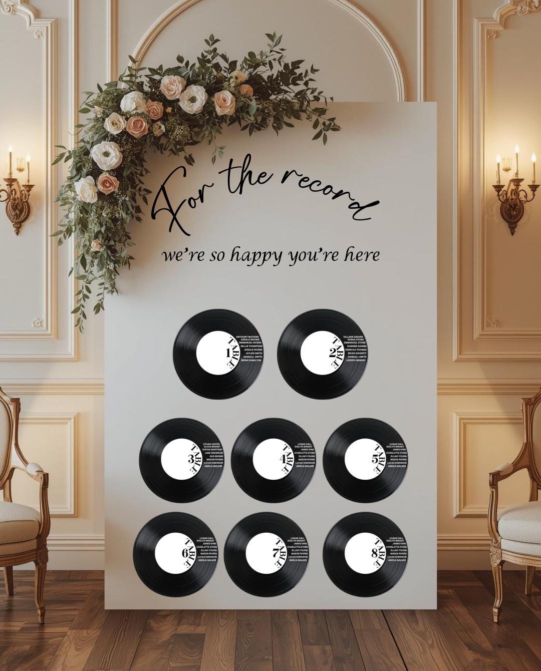 Create a seating display your guests will never forget! These 12" faux vinyl records are personalized with guest names and table numbers, making them the perfect combination of décor and function for weddings, birthdays, and music-themed celebrations.