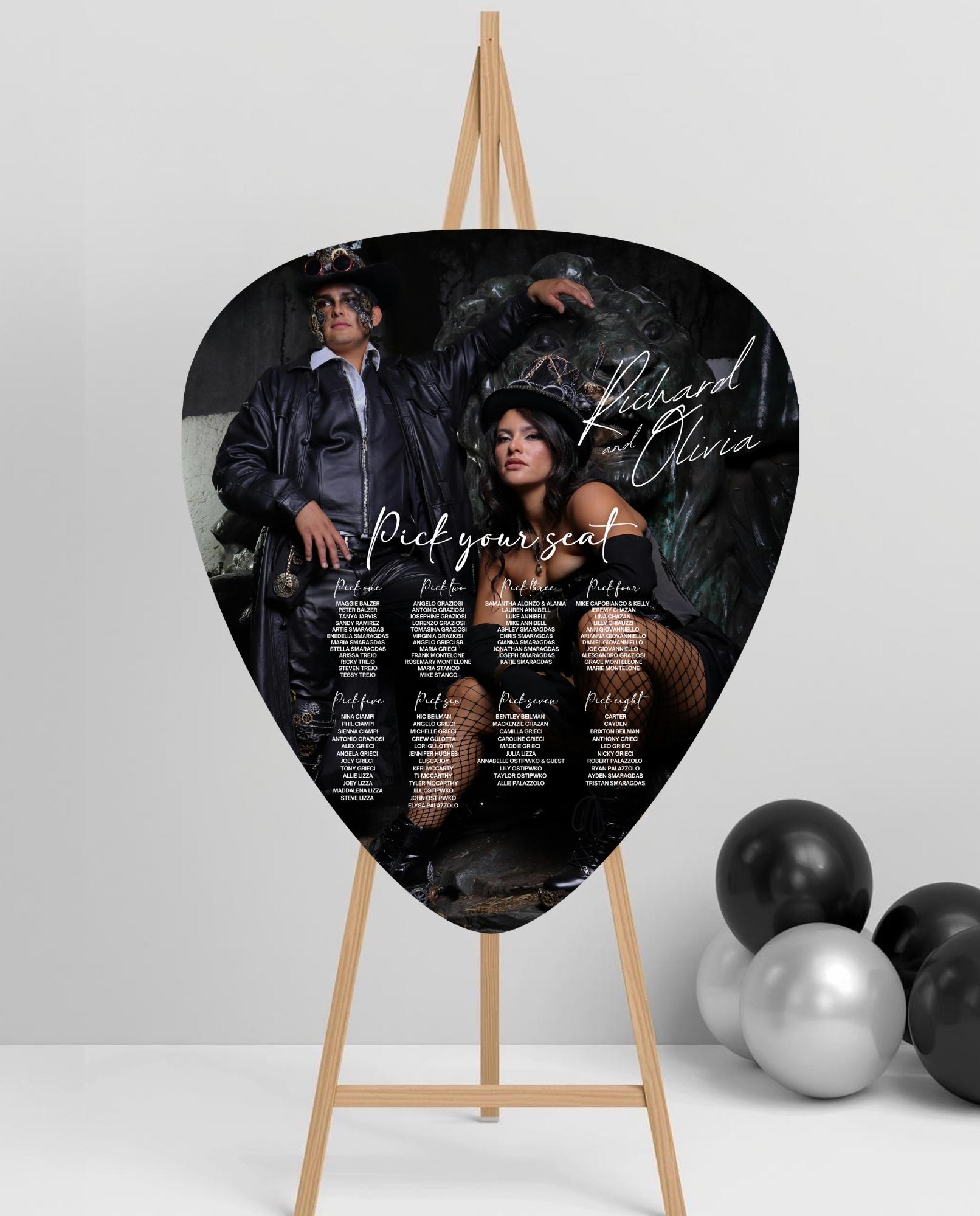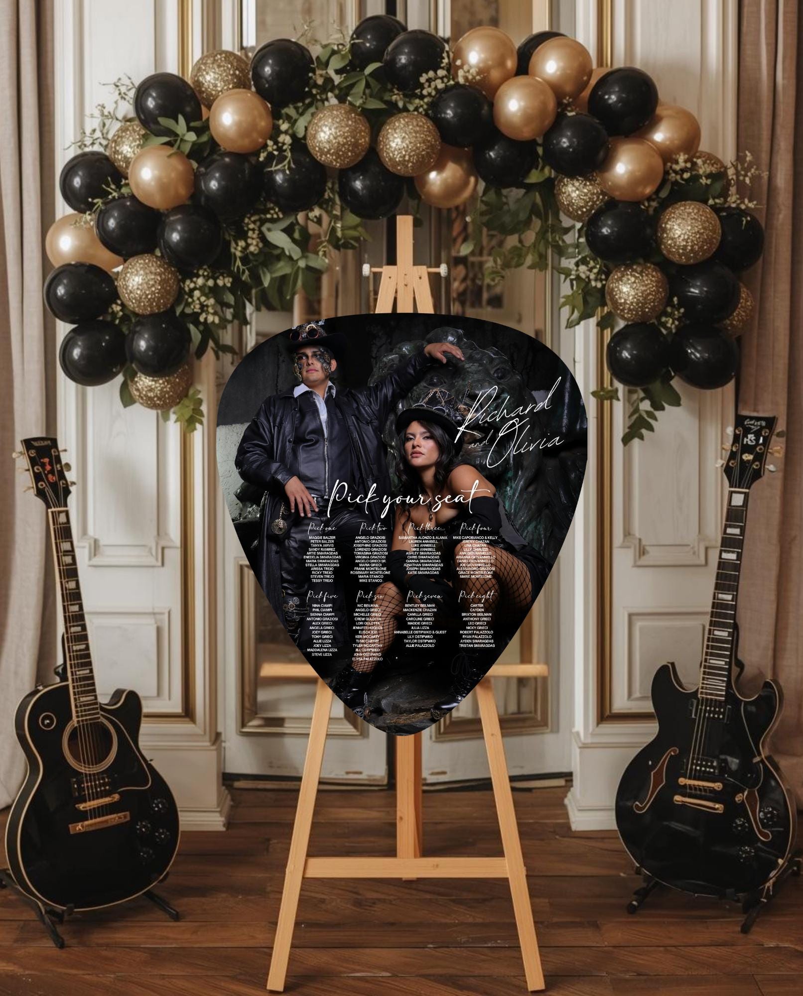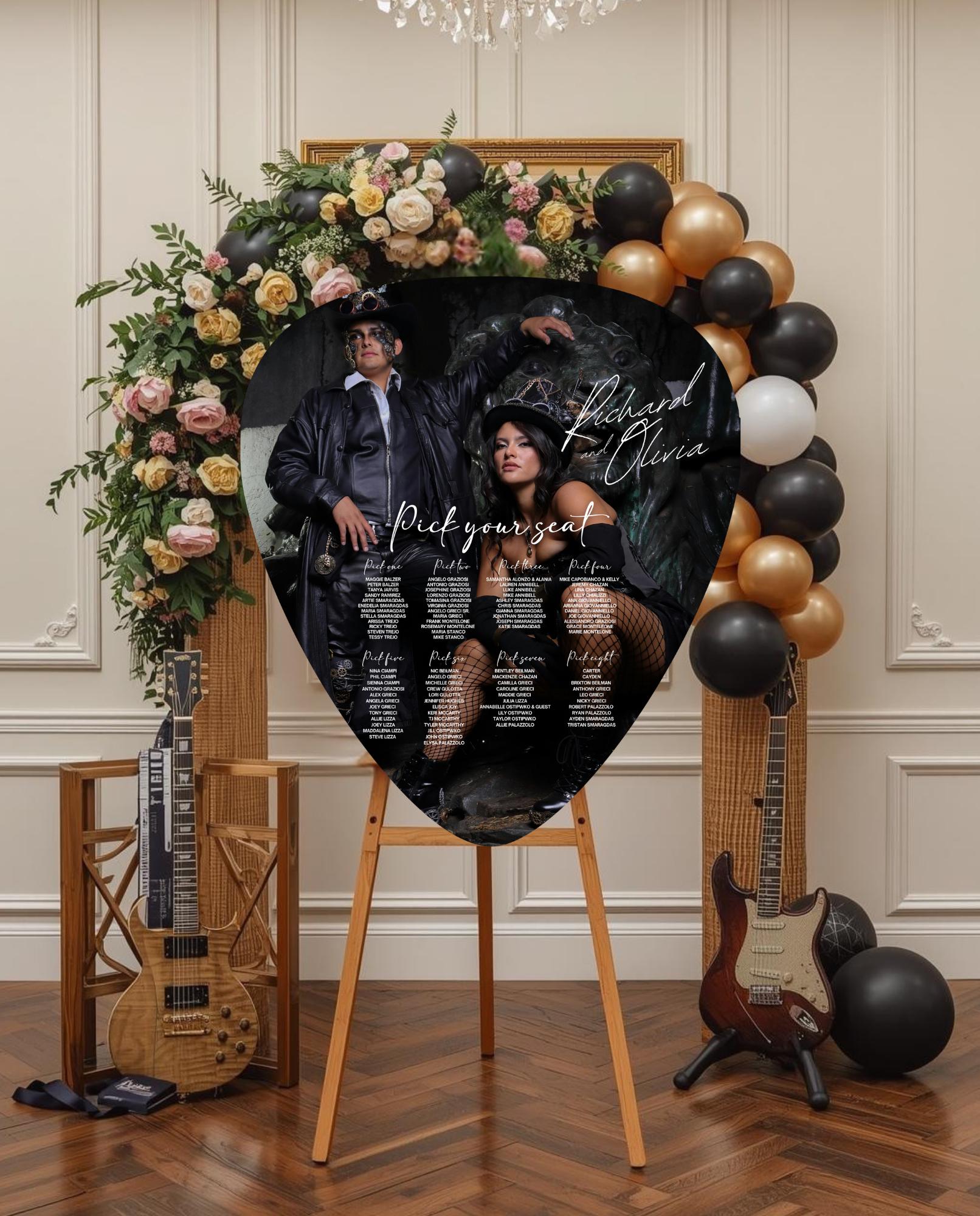 Make a statement at your event with this unique guitar pick–shaped acrylic seating chart. Perfect for music lovers, weddings, birthdays, and themed celebrations, this custom sign adds a modern and personalized touch to your reception décor.